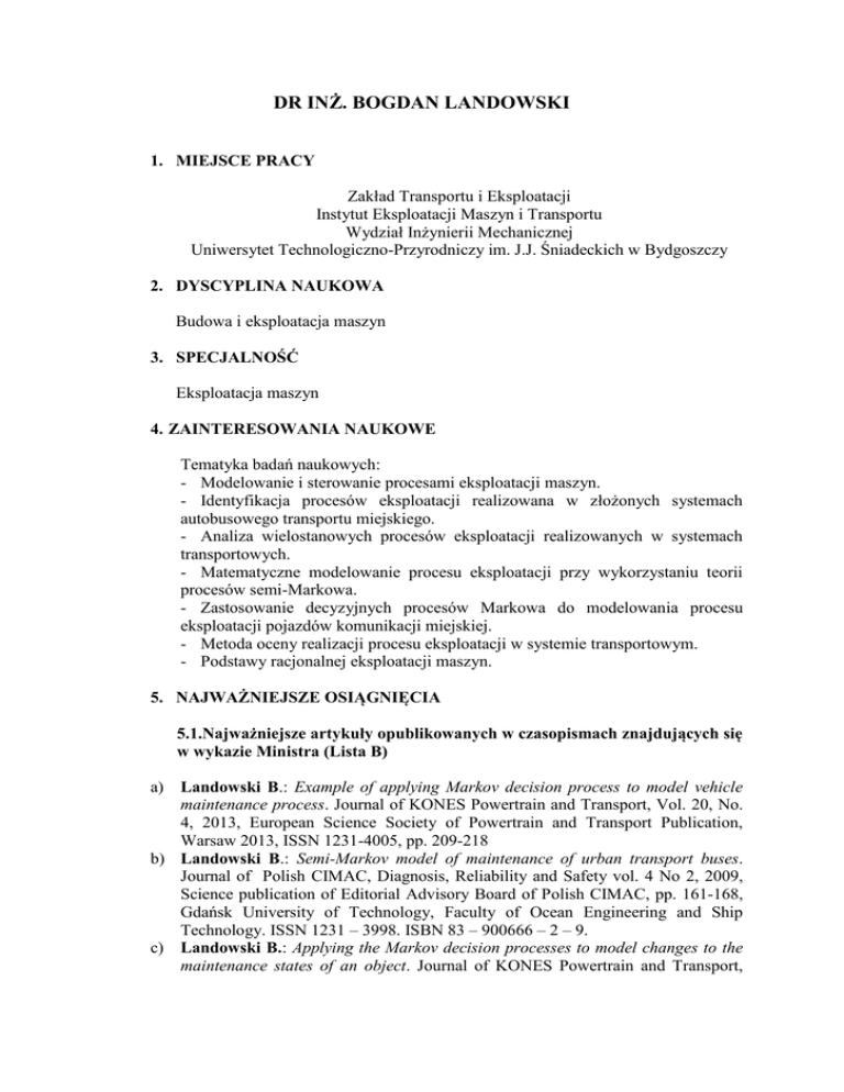 DR INŻ. BOGDAN LANDOWSKI 1. MIEJSCE PRACY Zakład Transportu i Eksploatacji Instytut Eksploatacji Maszyn i Transportu Wydział Inżynierii Mechanicznej Uniwersytet Technologiczno-Przyrodniczy im. J.J. Śniadeckich w Bydgoszczy 2. DYSCYPLINA NAUKOWA Budowa i eksploatacja maszyn 3. SPECJALNOŚĆ Eksploatacja maszyn 4. ZAINTERESOWANIA NAUKOWE Tematyka badań naukowych: - Modelowanie i sterowanie procesami eksploatacji maszyn. - Identyfikacja procesów eksploatacji realizowana w złożonych systemach autobusowego transportu miejskiego. - Analiza wielostanowych procesów eksploatacji realizowanych w systemach transportowych. - Matematyczne modelowanie procesu eksploatacji przy wykorzystaniu teorii procesów semi-Markowa. - Zastosowanie decyzyjnych procesów Markowa do modelowania procesu eksploatacji pojazdów komunikacji miejskiej. - Metoda oceny realizacji procesu eksploatacji w systemie transportowym. - Podstawy racjonalnej eksploatacji maszyn. 5. NAJWAŻNIEJSZE OSIĄGNIĘCIA 5.1.Najważniejsze artykuły opublikowanych w czasopismach znajdujących się w wykazie Ministra (Lista B) a) Landowski B.: Example of applying Markov decision process to model vehicle maintenance process. Journal of KONES Powertrain and Transport, Vol. 20, No. 4, 2013, European Science Society of Powertrain and Transport Publication, Warsaw 2013, ISSN 1231-4005, pp. 209-218 b) Landowski B.: Semi-Markov model of maintenance of urban transport buses. Journal of Polish CIMAC, Diagnosis, Reliability and Safety vol. 4 No 2, 2009, Science publication of Editorial Advisory Board of Polish CIMAC, pp. 161-168, Gdańsk University of Technology, Faculty of Ocean Engineering and Ship Technology. ISSN 1231 – 3998. ISBN 83 – 900666 – 2 – 9. c) Landowski B.: Applying the Markov decision processes to model changes to the maintenance states of an object. Journal of KONES Powertrain and Transport, d) e) f) g) h) i) j) Vol. 17, No. 3, 2010, European Science Society of Powertrain and Transport Publication, Warsaw 2010, ISSN 1231-4005, pp. 263-270. Landowski B.: Simulation model of the means of transport maintenance process. Journal of KONES Powertrain and Transport, Vol. 17, No. 4, 2010, European Science Society of Powertrain and Transport Publication, Warsaw 2010, ISSN 1231-4005, pp. 271-276. Landowski B.: Application of Markov decision process as a mathematical model of operation and maintenance process. Scientific Journals Maritime University of Szczecin No. 24(96), 2010, pp. 12-16, ISSN 1733-8670. Landowski B.: An example of a technical object operation process model describing influence of engine damages on the operation process course. Journal of Polish CIMAC Vol. 9, no 3, 2014, pp. 33-42. Landowski B.: Example of Markov decision process use for modelling of operation and maintenance process. Interdisciplinary Integration of Science in Technology, Education and Economy. Monograph: edited by Shalapko J. and Żółtowski B. Khmelnytsky – Jaremche 2013, ISBN 978-617-70-94-07-3, pp. 583593. Woropay M., Grabski F., Landowski B.: Semi-Markov model of the vehicle maintenance processes in an urban transport system. Scientific Publishers of the Polish Scientific Association of Automotive Engineering, Archives of Automotive Engineering Vol. 7, No 3, 2004. Landowski B., Szeliga M.: Analiza wybranych cech procesu eksploatacji środków transportu szynowego. Logistyka 3/2014, pp. 3650-3657. Wydawca: Instytut Logistyki I Magazynowania, Poznań 2014, ISSN 1231-5478. Landowski B., Woropay M.: A simulation method of operation and maintenance for vehicles under influence of preventive service. Archiwum Motoryzacji vol. 7, nr 2, 2004, s. 109-123. 5.2. Publikacje książkowe i monografie a) Woropay M., Knopik L., Landowski B.: Modelowanie procesów eksploatacji w systemie transportowym. Biblioteka Problemów Eksploatacji. Wydawnictwo Instytutu Eksploatacji Maszyn, Bydgoszcz – Radom 2001. b) Woropay M., Landowski B., Jaskulski Z.: Wybrane problemy eksploatacji i zarządzania systemami technicznymi. Wydawnictwa Uczelniane ATR w Bydgoszczy 2004. c) Woropay M., Knopik L., Landowski B.: Sterowanie niezawodnością w systemach transportowych. Biblioteka Problemów Eksploatacji, Wydawnictwo Instytutu Eksploatacji Maszyn, Bydgoszcz – Radom 2004. d) Żółtowski B., Landowski B., Przybyliński B.: Projektowanie eksploatacji maszyn. Wydawnictwo Instytutu Eksploatacji Maszyn, Radom 2012. 5.3. Prestiżowe nagrody i wyróżnienia a) 2011 - Medal 60-lecia Wydziału Inżynierii Mechanicznej UTP w Bydgoszczy, b) 2013 - Nagroda zespołowa II stopnia JM Rektora UTP w Bydgoszczy za wyróżniające osiągnięcia w działalności dydaktycznej w 2012 roku. c) 2014 - Nagroda zespołowa II stopnia JM Rektora UTP w Bydgoszczy za wyróżniające osiągnięcia w działalności organizacyjnej, d) 2014 – Laur Wydziału Inżynierii Mechanicznej UTP w Bydgoszczy,