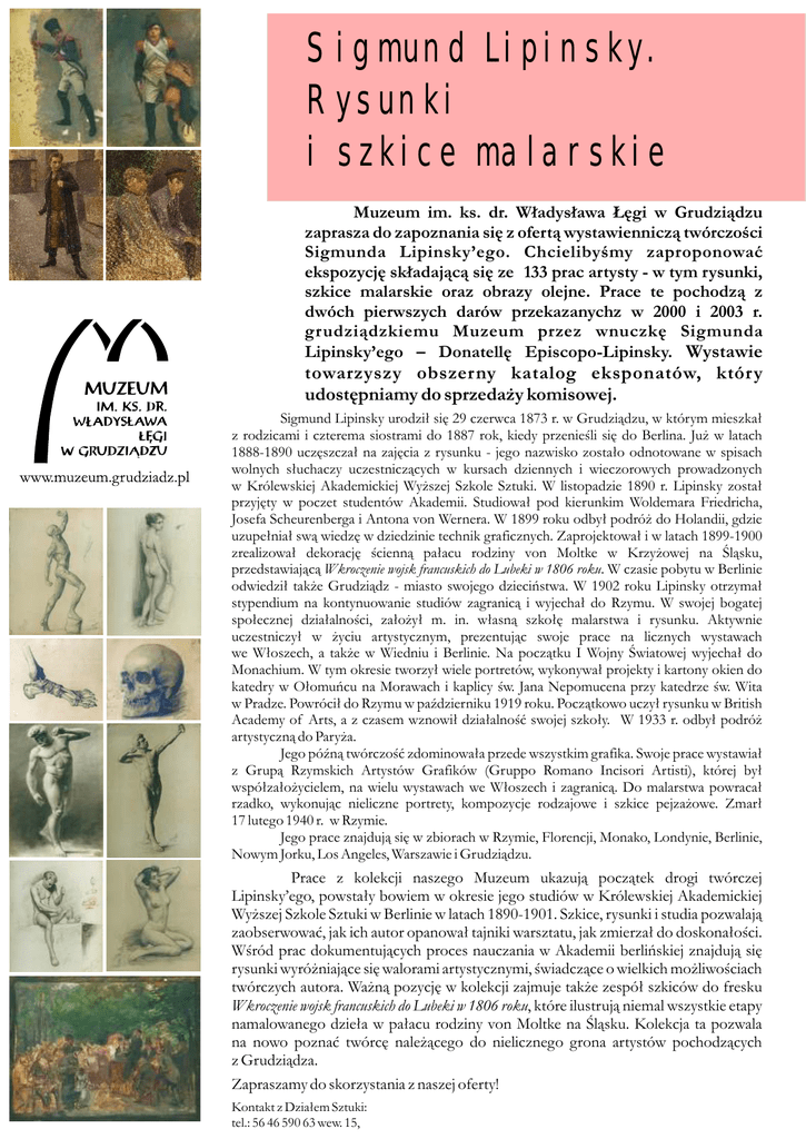 Sigmund Lipinsky. Rysunki i szkice malarskie Muzeum im. ks. dr. Władysława Łęgi w Grudziądzu zaprasza do zapoznania się z ofertą wystawienniczą twórczości Sigmunda Lipinsky’ego. Chcielibyśmy zaproponować ekspozycję składającą się ze 133 prac artysty - w tym rysunki, szkice malarskie oraz obrazy olejne. Prace te pochodzą z dwóch pierwszych darów przekazanychz w 2000 i 2003 r. grudziądzkiemu Muzeum przez wnuczkę Sigmunda Lipinsky’ego – Donatellę Episcopo-Lipinsky. Wystawie towarzyszy obszerny katalog eksponatów, który udostępniamy do sprzedaży komisowej. Sigmund Lipinsky urodził się 29 czerwca 1873 r. w Grudziądzu, w którym mieszkał z rodzicami i czterema siostrami do 1887 rok, kiedy przenieśli się do Berlina. Już w latach 1888-1890 uczęszczał na zajęcia z rysunku - jego nazwisko zostało odnotowane w spisach wolnych słuchaczy uczestniczących w kursach dziennych i wieczorowych prowadzonych w Królewskiej Akademickiej Wyższej Szkole Sztuki. W listopadzie 1890 r. Lipinsky został przyjęty w poczet studentów Akademii. Studiował pod kierunkim Woldemara Friedricha, Josefa Scheurenberga i Antona von Wernera. W 1899 roku odbył podróż do Holandii, gdzie uzupełniał swą wiedzę w dziedzinie technik graficznych. Zaprojektował i w latach 1899-1900 zrealizował dekorację ścienną pałacu rodziny von Moltke w Krzyżowej na Śląsku, przedstawiającą Wkroczenie wojsk francuskich do Lubeki w 1806 roku. W czasie pobytu w Berlinie odwiedził także Grudziądz - miasto swojego dzieciństwa. W 1902 roku Lipinsky otrzymał stypendium na kontynuowanie studiów zagranicą i wyjechał do Rzymu. W swojej bogatej społecznej działalności, założył m. in. własną szkołę malarstwa i rysunku. Aktywnie uczestniczył w życiu artystycznym, prezentując swoje prace na licznych wystawach we Włoszech, a także w Wiedniu i Berlinie. Na początku I Wojny Światowej wyjechał do Monachium. W tym okresie tworzył wiele portretów, wykonywał projekty i kartony okien do katedry w Ołomuńcu na Morawach i kaplicy św. Jana Nepomucena przy katedrze św. Wita w Pradze. Powrócił do Rzymu w październiku 1919 roku. Początkowo uczył rysunku w British Academy of Arts, a z czasem wznowił działalność swojej szkoły. W 1933 r. odbył podróż artystyczną do Paryża. Jego późną twórczość zdominowała przede wszystkim grafika. Swoje prace wystawiał z Grupą Rzymskich Artystów Grafików (Gruppo Romano Incisori Artisti), której był współzałożycielem, na wielu wystawach we Włoszech i zagranicą. Do malarstwa powracał rzadko, wykonując nieliczne portrety, kompozycje rodzajowe i szkice pejzażowe. Zmarł 17 lutego 1940 r. w Rzymie. Jego prace znajdują się w zbiorach w Rzymie, Florencji, Monako, Londynie, Berlinie, Nowym Jorku, Los Angeles, Warszawie i Grudziądzu. Prace z kolekcji naszego Muzeum ukazują początek drogi twórczej Lipinsky’ego, powstały bowiem w okresie jego studiów w Królewskiej Akademickiej Wyższej Szkole Sztuki w Berlinie w latach 1890-1901. Szkice, rysunki i studia pozwalają zaobserwować, jak ich autor opanował tajniki warsztatu, jak zmierzał do doskonałości. Wśród prac dokumentujących proces nauczania w Akademii berlińskiej znajdują się rysunki wyróżniające się walorami artystycznymi, świadczące o wielkich możliwościach twórczych autora. Ważną pozycję w kolekcji zajmuje także zespół szkiców do fresku Wkroczenie wojsk francuskich do Lubeki w 1806 roku, które ilustrują niemal wszystkie etapy namalowanego dzieła w pałacu rodziny von Moltke na Śląsku. Kolekcja ta pozwala na nowo poznać twórcę należącego do nielicznego grona artystów pochodzących z Grudziądza. Zapraszamy do skorzystania z naszej oferty! Kontakt z Działem Sztuki: tel.: 56 46 590 63 wew. 15, e-mail: [email protected]