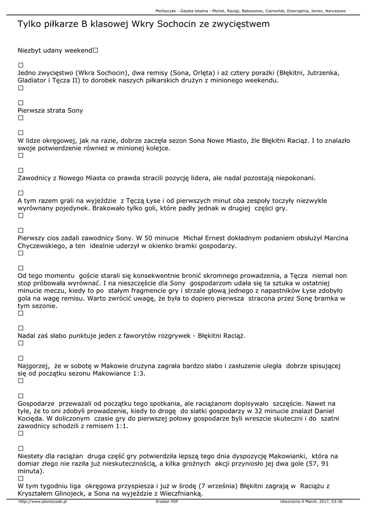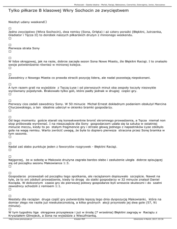 Płońszczak - Gazeta lokalna - Płońsk, Raciąż, Baboszewo, Czerwińsk, Dzierzążnia, Joniec, Naruszewo Tylko piłkarze B klasowej Wkry Sochocin ze zwycięstwem Niezbyt udany weekend Jedno zwycięstwo (Wkra Sochocin), dwa remisy (Sona, Orlęta) i aż cztery porażki (Błękitni, Jutrzenka, Gladiator i Tęcza II) to dorobek naszych piłkarskich drużyn z minionego weekendu. Pierwsza strata Sony W lidze okręgowej, jak na razie, dobrze zaczęła sezon Sona Nowe Miasto, źle Błękitni Raciąż. I to znalazło swoje potwierdzenie również w minionej kolejce. Zawodnicy z Nowego Miasta co prawda stracili pozycję lidera, ale nadal pozostają niepokonani. A tym razem grali na wyjeździe z Tęczą Łyse i od pierwszych minut oba zespoły toczyły niezwykle wyrównany pojedynek. Brakowało tylko goli, które padły jednak w drugiej części gry. Pierwszy cios zadali zawodnicy Sony. W 50 minucie Michał Ernest dokładnym podaniem obsłużył Marcina Chyczewskiego, a ten idealnie uderzył w okienko bramki gospodarzy. Od tego momentu goście starali się konsekwentnie bronić skromnego prowadzenia, a Tęcza niemal non stop próbowała wyrównać. I na nieszczęście dla Sony gospodarzom udała się ta sztuka w ostatniej minucie meczu, kiedy to po stałym fragmencie gry i strzale głową jednego z napastników Łyse zdobyło gola na wagę remisu. Warto zwrócić uwagę, że była to dopiero pierwsza stracona przez Sonę bramka w tym sezonie. Nadal zaś słabo punktuje jeden z faworytów rozgrywek - Błękitni Raciąż. Najgorzej, że w sobotę w Makowie drużyna zagrała bardzo słabo i zasłużenie uległa dobrze spisującej się od początku sezonu Makowiance 1:3. Gospodarze przeważali od początku tego spotkania, ale raciążanom dopisywało szczęście. Nawet na tyle, że to oni zdobyli prowadzenie, kiedy to drogę do siatki gospodarzy w 32 minucie znalazł Daniel Kocięda. W doliczonym czasie gry do pierwszej połowy gospodarze byli wreszcie skuteczni i do szatni zawodnicy schodzili z remisem 1:1. Niestety dla raciążan druga część gry potwierdziła lepszą tego dnia dyspozycję Makowianki, która na domiar złego nie raziła już nieskutecznością, a kilka groźnych akcji przyniosło jej dwa gole (57, 91 minuta). W tym tygodniu liga okręgowa przyspiesza i już w środę (7 września) Błękitni zagrają w Raciążu z Kryształem Glinojeck, a Sona na wyjeździe z Wieczfnianką. http://www.plonszczak.pl Kreator PDF Utworzono 4 March, 2017, 03:36 Płońszczak - Gazeta lokalna - Płońsk, Raciąż, Baboszewo, Czerwińsk, Dzierzążnia, Joniec, Naruszewo W weekendowej kolejce raciążanie jadą do Rzekunia, a Sona podejmie ostrołęcką Koronę. Słabo w A klasie Cztery nasze drużyny grające w A klasie wypadły bardzo słabo, zdołając zdobyć zaledwie jedną bramkę. Gol ten padł na boisku w Baboszewie, a trafienie Grzegorza Rybackiego dało Orlętom punkt w pojedynku z Wąsewem. Pozostałe zespoły poległy do zera: Gladiator Słoszewo 0:4 w Kadzidle z Kurpikiem, a po 0:3 Jutrzenka Unieck w Myszyńcu z Bartnikiem i rezerwy Tęczy z GKS Pokrzywnica. Sochocin liderem Co prawda to dopiero druga kolejka rozgrywek B klasy, ale humory w Sochocinie z pewnością bardzo dobre. Wkra ponownie bez straty gola wygrała na wyjeździe - tym razem 3:0 z Opią Opinogóra - i lideruje rozgrywkom. Artur Kołodziejczyk, Łukasz Majkowski, Krzysztof Lewandowski foto: Karina Borowska LIGA OKRĘGOWA 3.09. Makowianka Maków Maz. - Błękitni Raciąż 3:1 (1:1) bramka: Kocięda (32, akcja indywidualna). Błękitni: Kamil Kalinowski - Kamil Szelągiewicz, Mariusz Mikłowski, Paweł Kopczyński, Rafał Kieczmer (80, Michał Wawrowski), Piotr Nowicki (46, Łukasz Szelągiewicz), Kamil Osiecki, Arkadiusz Wróblewski, Daniel Kocięda (46, Michał Golian), Dariusz Petrykowski, Mariusz Kopecki (75, Piotr Janakakos). 4.09. Tęcza Łyse - Sona Nowe Miasto 1:1 (0:0) bramka: Marcin Chyczewski (50, asysta Ernest). Sona: Rafał Wieczorkowski - Marcin Szwejkowski, Krzysztof Brudzyński, Radosław Cytloch, Mateusz Chyczewski, Michał Bandurski, Cezariusz Prusinowski (80, Marcin Macias), Marcin Chyczewski, Łukasz Szwejkowski (36, Michał Chyczewski), Karol Olbryś (45, Konrad Wiktorowicz), Michał Ernest. Pozostałe wyniki III kolejki (3-4.09.): * KS Pniewo - Wieczfnianka Wieczfnia 3:4 * Żbik Nasielsk - Orzeł Sypniewo 8:2 * Wkra Bieżuń - Boruta Kuczbork 6:4 * Kryształ Glinojeck - KS CK Troszyn 4:1 * Rzekunianka Rzekuń - Iskra Krasne 0:3 * Tęcza Ojrzeń - Korona Ostrołęka 1:2. W IV kolejce (środa 7.09.) zagrają: * Korona Ostrołęka - Tęcza Łyse * Wieczfnianka Wieczfnia - Sona Nowe Miasto (Wieczfnia, środa 7.09., g. 17) * Iskra Krasne - Tęcza Ojrzeń * KS CK Troszyn http://www.plonszczak.pl Kreator PDF Utworzono 4 March, 2017, 03:36 Płońszczak - Gazeta lokalna - Płońsk, Raciąż, Baboszewo, Czerwińsk, Dzierzążnia, Joniec, Naruszewo Rzekunianka Rzekuń * Błękitni Raciąż - Kryształ Glinojeck (Raciąż, środa 7.09., g. 17) * Boruta Kuczbork - Makowianka Maków Maz. * Orzeł Sypniewo - Wkra Bieżuń * KS Pniewo - Żbik Nasielsk. W V kolejce (sob.-niedz. 10-11.09.) zagrają: * Żbik Nasielsk - Wieczfnianka Wieczfnia * Wkra Bieżuń KS Pniewo * Makowianka Maków Maz. - Orzeł Sypniewo * Kryształ Glinojeck - Boruta Kuczbork * Rzekunianka Rzekuń - Błękitni Raciąż * Tęcza Ojrzeń - KS CK Troszyn * Tęcza Łyse - Iskra Krasne * Sona Nowe Miasto - Korona Ostrołęka (N. Miasto, sobota 10.09., g. 16). Tabela A KLASA 4.09. Bartnik Myszyniec - Jutrzenka Unieck 3:0 (2:0) Jutrzenka: Patryk Kocięcki - Piotr Kwieciński, Rafał Wiśniewski, Michał Ługowski, Łukasz Lubiński, Dawid Bloch, Janusz Pajewski (75, Rafał Wiśniewski), Damian Kujawski (70, Patryk Baczewski), Piotr Bloch, Mariusz Borzykowski, Stanisław Pniewski (46, Marcin Marciniak). czerwona kartka: Bloch (60). 4.09. Orlęta Baboszewo - KS Wąsewo 1:1 (1:0) bramka: G. Rybacki (28, akcja indywidualna). Orlęta: Tomasz Kuligowski - Jacek K