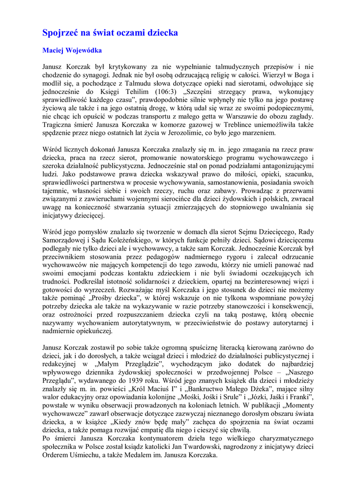 Spojrzeć na świat oczami dziecka Maciej Wojewódka Janusz Korczak był krytykowany za nie wypełnianie talmudycznych przepisów i nie chodzenie do synagogi. Jednak nie był osobą odrzucającą religię w całości. Wierzył w Boga i modlił się, a pochodzące z Talmudu słowa dotyczące opieki nad sierotami, odwołujące się jednocześnie do Księgi Tehilim (106:3) „Szczęśni strzegący prawa, wykonujący sprawiedliwość każdego czasu”, prawdopodobnie silnie wpłynęły nie tylko na jego postawę życiową ale także i na jego ostatnią drogę, w którą udał się wraz ze swoimi podopiecznymi, nie chcąc ich opuścić w podczas transportu z małego getta w Warszawie do obozu zagłady. Tragiczna śmierć Janusza Korczaka w komorze gazowej w Treblince uniemożliwiła także spędzenie przez niego ostatnich lat życia w Jerozolimie, co było jego marzeniem. Wśród licznych dokonań Janusza Korczaka znalazły się m. in. jego zmagania na rzecz praw dziecka, praca na rzecz sierot, promowanie nowatorskiego programu wychowawczego i szeroka działalność publicystyczna. Jednocześnie stał on ponad podziałami antagonizującymi ludzi. Jako podstawowe prawa dziecka wskazywał prawo do miłości, opieki, szacunku, sprawiedliwości partnerstwa w procesie wychowywania, samostanowienia, posiadania swoich tajemnic, własności siebie i swoich rzeczy, ruchu oraz zabawy. Prowadząc z przerwami związanymi z zawieruchami wojennymi sierocińce dla dzieci żydowskich i polskich, zwracał uwagę na konieczność stwarzania sytuacji zmierzających do stopniowego uwalniania się inicjatywy dziecięcej. Wśród jego pomysłów znalazło się tworzenie w domach dla sierot Sejmu Dziecięcego, Rady Samorządowej i Sądu Koleżeńskiego, w których funkcje pełniły dzieci. Sądowi dziecięcemu podlegały nie tylko dzieci ale i wychowawcy, a także sam Korczak. Jednocześnie Korczak był przeciwnikiem stosowania przez pedagogów nadmiernego rygoru i zalecał odrzucanie wychowawców nie mających kompetencji do tego zawodu, którzy nie umieli panować nad swoimi emocjami podczas kontaktu zdzieckiem i nie byli świadomi oczekujących ich trudności. Podkreślał istotność solidarności z dzieckiem, opartej na bezinteresownej więzi i gotowości do wyrzeczeń. Rozważając myśl Korczaka i jego stosunek do dzieci nie możemy także pominąć „Prośby dziecka”, w której wskazuje on nie tylkona wspomniane powyżej potrzeby dziecka ale także na wykazywanie w razie potrzeby stanowczości i konsekwencji, oraz ostrożności przed rozpuszczaniem dziecka czyli na taką postawę, którą obecnie nazywamy wychowaniem autorytatywnym, w przeciwieństwie do postawy autorytarnej i nadmiernie opiekuńczej. Janusz Korczak zostawił po sobie także ogromną spuściznę literacką kierowaną zarówno do dzieci, jak i do dorosłych, a także wciągał dzieci i młodzież do działalności publicystycznej i redakcyjnej w „Małym Przeglądzie”, wychodzącym jako dodatek do najbardziej wpływowego dziennika żydowskiej społeczności w przedwojennej Polsce – „Naszego Przeglądu”, wydawanego do 1939 roku. Wśród jego znanych książek dla dzieci i młodzieży znalazły się m. in. powieści „Król Maciuś I” i „Bankructwo Małego Dżeka”, mające silny walor edukacyjny oraz opowiadania kolonijne „Mośki, Jośki i Srule” i „Józki, Jaśki i Franki”, powstałe w wyniku obserwacji prowadzonych na koloniach letnich. W publikacji „Momenty wychowawcze” zawarł obserwacje dotyczące zazwyczaj nieznanego dorosłym obszaru świata dziecka, a w książce „Kiedy znów będę mały” zachęca do spojrzenia na świat oczami dziecka, a także pomaga rozwijać empatię dla niego i cieszyć się chwilą. Po śmierci Janusza Korczaka kontynuatorem dzieła tego wielkiego charyzmatycznego społecznika w Polsce został ksiądz katolicki Jan Twardowski, nagrodzony z inicjatywy dzieci Orderem Uśmiechu, a także Medalem im. Janusza Korczaka.
