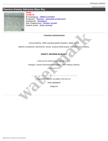 Informacje o produkcie Utworzono 04-03-2017 Tkanina Kwiaty Odcienie Blue Sky Cena : 13,00 zł Nr katalogowy : TKBA11221SKY Producent : Tkaniny - pozostali producenci Dostępność : Dostępny Stan magazynowy : bardzo wysoki Średnia ocena : brak recenzji er m ar k TKANINA BAWEŁNIANA Urocza tkanina, 100% wysokiej jakości bawełny. Gęsto tkana. Idealna na poduszki, patchworki, kocyki, artykuły dekoracyjne, zabawki i inne projekty. KWIATY ODCIENIE BLUE/SKY Cena za 0,5 metra bieżącego (50 x 112) Kupując 2 sztuki otrzymujecie Państwo 1 metr bieżący tkaniny ************ ........................................................................................ w at Szerokość tkaniny na wałku 110-112 cm Wygenerowano w programie www.oscGold.com 100% BAWEŁNY 130gr/m2
