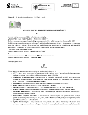 Załącznik 1 do Regulaminu Inkubatora - UMOWA – wzór UMOWA Z KLIENTEM INKUBATORA PRZEDSIĘBIORCZOŚCI KPPT Nr……………………………….. zawarta w dniu ……………….2015 r. w Kwidzynie, pomiędzy: „KWIDZYŃSKI PARK PRZEMYSŁOWO – TECHNOLOGICZNY ” Spółka z ograniczoną odpowiedzialnością , mającą swą siedzibę w Górkach, gmina Kwidzyn, Górki 3A, 82-500 Kwidzyn, zarejestrowaną w Rejestrze Przedsiębiorców Krajowego Rejestru Sądowego prowadzonego przez Sąd Rejonowy Gdańsk-Północ w Gdańsku Wydział Gospodarczy KRS pod nr 0000258211, NIP 581 18 79 158, REGON 220249083 NIP 5811879158, REGON 220249083, reprezentowaną przez: Prezesa Zarządu – Jarosława Rosiaka zwanym w dalszej części umowy „Wynajmującym/KPPT” a ……………………………………., NIP ……………………, REGON ………………………… zwanym w dalszej części umowy „ Klientem/Firmą”, o następującej treści: §1 Definicje Ilekroć w dalszych postanowieniach niniejszego regulaminu jest mowa o: 1. KPPT - należy przez to rozumieć infrastrukturę Kwidzyńskiego Parku Przemysłowo-Technologicznego służącą rozwojowi przedsiębiorczości zlokalizowaną w Górki 3A i 2A 2. Inkubatorze Przedsiębiorczości - należy przez to rozumieć przestrzeń w KPPT przeznaczoną na lokowanie rozpoczynających działalność oraz chcących się rozwijać firm technologicznych oraz firm typu ,, start –up’’ ( zwany dalej Inkubatorem KPPT) 3. Regulaminie - należy przez to rozumieć Regulamin Inkubatora Przedsiębiorczości KPPT. 4. Klient KPPT – podmiot korzystający z usług oferowanych w KPPT. 5. Umowa- Umowa z Klientem Inkubatora KPPT zawarta pomiędzy KPPT Sp. z o.o. a Klientem. 6. Stawka bazowa - aktualizowana corocznie w oparciu o lokalny rynek wartość rynkowa usługi. 7. Pracownik Administracji – wyznaczony przez Zarządzającego pracownik Inkubatora obsługujący i odpowiedzialny za dane zadanie. 8. Powierzchnie wspólne Inkubatora – powierzchnie komunikacyjne oraz pomieszczenia, w tym pomieszczenia socjalne, łazienki, wc, korytarze, klatki schodowe, windy, służące do współkorzystania przez firmy ulokowane w Inkubatorze. 9. Opłata eksploatacyjna – przypadająca na Firmę należność z tytułu eksploatacji Inkubatora oraz związane z jego utrzymaniem w należytym stanie technicznym, bezpieczeństwie, porządku i czystości oraz obciążeniami podatkowymi, obejmujące: opłaty za energię cieplną, elektryczną, wodę, ścieki, sprzątanie, wywóz śmieci ( bez odpadów produkcyjnych), ochronę i monitoring, podatki. 10. Zarządzający – należy przez to rozumieć Kwidzyński Park Przemysłowo- Technologiczny Sp. z o.o. §2 Przedmiot Umowy i zabezpieczenie 1. Przedmiotem niniejszej umowy jest określenie warunków korzystania przez Firmę z usług KPPT jako miejsca sprzyjającego rozwojowi Firmy, w tym w szczególności warunków usługi wynajmu i korzystania z powierzchni w Inkubatorze Przedsiębiorczości KPPT ,Górki 3 A, budynek E: pomieszczenie nr……………………………… o powierzchni użytkowej…………………………… powierzchnie wdrożeniowo- produkcyjne…………………………………………………………….. 2. Usługi w Inkubatorze KPPT są oferowane Firmie po stawkach preferencyjnych bądź nieodpłatnie w zależności od ich rodzaju. 3. Wynajmujący przekazuje protokolarnie Firmie opisane w punkcie 1 pomieszczenie/powierzchnie z przeznaczeniem na prowadzenie przez nią działalności w Inkubatorze KPPT. 4. Wzór Protokołu przekazania pomieszczenia/powierzchni przeznaczonej na działalność Firmy w Inkubatorze KPPT stanowi Załącznik 1 do Umowy. 5. Na zabezpieczenie wszelkich roszczeń KPPT wynikających z niniejszej Umowy, Firma w dniu odbioru przedmiotu najmu przekaże do dyspozycji KPPT pochodzący z jej wystawienia weksel własny in blanco, wraz z deklaracją wekslową stanowiącą Załącznik 7 do Umowy. §3 Okres zawarcia i obowiązywania Umowy Umowa zostaje zawarta na okres trzech lat od daty podpisania. 1. Data podpisania Umowy jest uznawana za datę rozpoczęcia działalności Firmy w Inkubatorze KPPT. 2. Wydanie powierzchni Firmie zostanie to potwierdzone przez Strony stosownym protokołem, sporządzonym w dwóch egzemplarzach. 3. Po upływie okresu wymienionego w punkcie 1 może zostać zawarta dalsza Umowa na warunkach określonych w Regulaminie Inkubatora KPPT. 4. Przypadki opuszczenia Inkubatora KPPT przez Klienta określa Regulamin. 5. Umowa ulega automatycznemu rozwiązaniu w trybie natychmiastowym, bez zachowania okresu wypowiedzenia i/lub potrzeby składania jakichkolwiek dodatkowych oświadczeń Stron w tym zakresie w przypadku utraty przez Firmę uprawnień do korzystania z pomocy de minimis lub jej wygaśnięcia. 6. Firma nie może przenosić praw wynikających z Umowy na rzecz osób trzecich. Naruszenie tego warunku będzie skutkowało rozwiązaniem umowy ze skutkiem natychmiastowym. 7. Przy opuszczaniu Inkubatora KPPT Strony umowy podpisują Protokół dotyczący m.in. terminów i sposobu uregulowania wszelkich wzajemnych zobowiązań na moment wyjścia Klienta z Inkubatora. 8. Zwrot powierzchni zostanie potwierdzony protokołem. Na wniosek pisemny Firmy Strony mogą ustalić inny termin zwrotu w formie pisemnej pod rygorem nieważności. 9. Opuszczając wynajmowane pomieszczenia/powierzchnie Firma jest zobowiązana przywrócić je do stanu na moment ich przekazania. 10. W wypadku gdy po opuszczeniu przedmiotu umowy przez Firmę pozostaną w nim jakiekolwiek przedmioty należące do Firmy, KPPT będzie uprawniony do opróżnienia oraz sprzątnięcia powierzchni na koszt i ryzyko Firmy. Rzeczy pozostawione w przedmiocie umowy zostaną uznane za porzucone w rozumieniu art. 180 K.C. KPPT nie będzie zobowiązany do przechowywania takich przedmiotów i nie będzie ponosił jakiegokolwiek ryzyka ich utraty czy uszkodzenia. 11. W przypadku gdy Firma nie przywróci pow