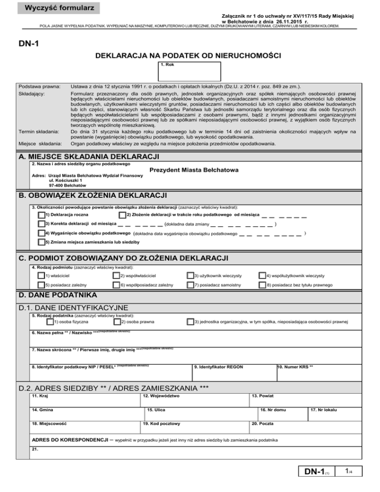 Wyczyść formularz Załącznik nr 1 do uchwały nr XV/117/15 Rady Miejskiej w Bełchatowie z dnia 26.11.2015 r. POLA JASNE WYPEŁNIA PODATNIK. WYPEŁNIAĆ NA MASZYNIE, KOMPUTEROWO LUB RĘCZNIE, DUŻYMI DRUKOWANYMI LITERAMI, CZARNYM LUB NIEBIESKIM KOLOREM. DN-1 DEKLARACJA NA PODATEK OD NIERUCHOMOŚCI 1. Rok Podstawa prawna: Ustawa z dnia 12 stycznia 1991 r. o podatkach i opłatach lokalnych (Dz.U. z 2014 r. poz. 849 ze zm.). Składający: Formularz przeznaczony dla osób prawnych, jednostek organizacyjnych oraz spółek niemających osobowości prawnej będących właścicielami nieruchomości lub obiektów budowlanych, posiadaczami samoistnymi nieruchomości lub obiektów budowlanych, użytkownikami wieczystymi gruntów, posiadaczami nieruchomości lub ich części albo obiektów budowlanych lub ich części, stanowiących własność Skarbu Państwa lub jednostki samorządu terytorialnego oraz dla osób fizycznych będących współwłaścicielami lub współposiadaczami z osobami prawnymi, bądź z innymi jednostkami organizacyjnymi nieposiadającymi osobowości prawnej lub ze spółkami nieposiadającymi osobowości prawnej, z wyjątkiem osób fizycznych tworzących wspólnotę mieszkaniową. Do dnia 31 stycznia każdego roku podatkowego lub w terminie 14 dni od zaistnienia okoliczności mających wpływ na powstanie (wygaśnięcie) obowiązku podatkowego, lub wysokość opodatkowania. Organ podatkowy właściwy ze względu na miejsce położenia przedmiotów opodatkowania. Termin składania: Miejsce składania: A. MIEJSCE SKŁADANIA DEKLARACJI 2. Nazwa i adres siedziby organu podatkowego Prezydent Miasta Bełchatowa Adres: Urząd Miasta Bełchatowa Wydział Finansowy ul. Kościuszki 1 97-400 Bełchatów B. OBOWIĄZEK ZŁOŻENIA DEKLARACJI 3. Okoliczności powodujące powstanie obowiązku złożenia deklaracji (zaznaczyć właściwy kwadrat): __ ____ 3) Korekta deklaracji od miesiąca _ _ _ _ _ _ (dokładna data zmiany _ _ _ _ _ _ _ _ ) 4) Wygaśnięcie obowiązku podatkowego (dokładna data wygaśnięcia obowiązku podatkowego _ _ _ _ _ _ _ _ ) 1) Deklaracja roczna 2) Złożenie deklaracji w trakcie roku podatkowego od miesiąca 5) Zmiana miejsca zamieszkania lub siedziby C. PODMIOT ZOBOWIĄZANY DO ZŁOŻENIA DEKLARACJI 4. Rodzaj podmiotu (zaznaczyć właściwy kwadrat): 1) właściciel 2) współwłaściciel 3) użytkownik wieczysty 4) współużytkownik wieczysty 5) posiadacz zależny 6) współposiadacz zależny 7) posiadacz samoistny 8) posiadacz bez tytułu prawnego D. DANE PODATNIKA D.1. DANE IDENTYFIKACYJNE 5. Rodzaj podatnika (zaznaczyć właściwy kwadrat): 1) osoba fizyczna 2) osoba prawna 3) jednostka organizacyjna, w tym spółka, nieposiadająca osobowości prawnej 6. Nazwa pełna ** / Nazwisko ***(niepotrzebne skreślić) 7. Nazwa skrócona ** / Pierwsze imię, drugie imię *** (niepotrzebne skreślić) 8. Identyfikator podatkowy NIP / PESEL* (niepotrzebne skreślić) 9. Identyfikator REGON 10. Numer KRS ** D.2. ADRES SIEDZIBY ** / ADRES ZAMIESZKANIA *** 11. Kraj 14. Gmina 18. Miejscowość 12. Województwo 15. Ulica 19. Kod pocztowy 13. Powiat 16. Nr domu 17. Nr lokalu 20. Poczta ADRES DO KORESPONDENCJI – wypełnić w przypadku jeżeli jest inny niż adres siedziby lub zamieszkania podatnika 21. DN-1 (1) 1/4 POLA JASNE WYPEŁNIA PODATNIK. WYPEŁNIAĆ NA MASZYNIE, KOMPUTEROWO LUB RĘCZNIE, DUŻYMI DRUKOWANYMI LITERAMI, CZARNYM LUB NIEBIESKIM KOLOREM. E. DANE DOTYCZĄCE PRZEDMIOTÓW OPODATKOWANIA (Z WYJĄTKIEM ZWOLNIONYCH) W przypadku, gdy obowiązek podatkowy powstał bądź wygasł w trakcie roku podatkowego, podstawy opodatkowania oraz kwoty podatku dla zgłaszanych nieruchomości/ obiektów budowlanych (lub ich części) należy wyliczyć proporcjonalnie do czasu, w którym ciążył obowiązek podatkowy w danym roku (w rozbiciu na miesiące). E.1. GRUNTY Miesiące (od – do) Wyszczególnienie Podstawa opodatkowania w m2 (ha) Stawka podatku (zł, gr) Kwota podatku (zł, gr) 22. 23. 24. 25. 26. 27. 28. 29. 30. 31. 32. 33. 34. 35. 36. 37. 1. grunty związane z prowadzeniem działalności gospodarczej, bez względu na sposób zakwalifikowania w ewidencji gruntów i budynków (w m2 ) 2. grunty pod wodami powierzchniowymi stojącymi lub wodami powierzchniowymi płynącymi jezior i zbiorników sztucznych (w ha) 3. grunty pozostałe, w tym zajęte na prowadzenie odpłatnej statutowej działalności pożytku publicznego przez organizacje pożytku publicznego (w m2 ) 4. grunty niezabudowane objęte obszarem rewitalizacji, o którym mowa w ustawie z dnia 9 października 2015 r. o rewitalizacji (Dz. U. poz. 1777), i położonych na terenach, dla których miejscowy plan zagospodarowania przestrzennego przewiduje przeznaczenie pod zabudowę mieszkaniową, usługową albo zabudowę o przeznaczeniu mieszanym obejmującym wyłącznie te rodzaje zabudowy, jeżeli od dnia wejścia w życie tego planu w odniesieniu do tych gruntów upłynął okres 4 lat, a w tym czasie nie zakończono budowy zgodnie z przepisami prawa budowlanego (w m2 ) E.2. BUDYNKI LUB ICH CZĘŚCI Do powierzchni użytkowej budynku (lub jego części) należy zaliczyć powierzchnię mierzoną po wewnętrznej długości ścian na wszystkich kondygnacjach, z wyjątkiem powierzchni klatek schodowych oraz szybów dźwigowych; za kondygnację uważa się również garaże podziemne, piwnice, sutereny i poddasza użytkowe. Powierzchnię pomieszczeń lub ich części oraz części kondygnacji o wysokości w świetle od 1,40m do 2,20m zalicza się do powierzchni użytkowej budynku w 50%, a jeżeli wysokość jest mniejsza niż 1,40m, powierzchnię tę pomija się. Budynek to obiekt budowlany w rozumieniu przepisów prawa budowlanego, który jest trwale związany z gruntem, wydzielony z przestrzeni za pomocą przegród budowlanych oraz posiada fundamenty i dach. Wyszczególnienie Miesiące (od – do) Podstawa opodatkowania w m2 Stawka podatku (zł, gr) Kwota podatku (zł, gr) 38. 39. 40. 41. 42. 43. 44. 45. 46. 47. 48. 