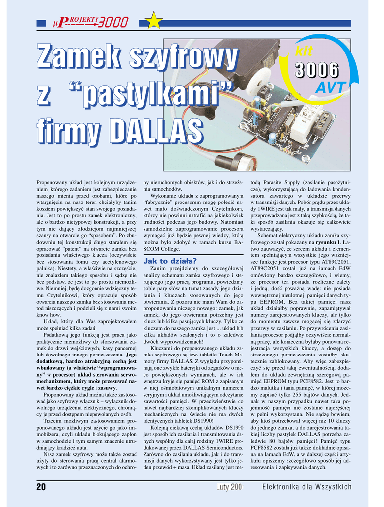 # Zamek szyfrowy z “pastylkami” firmy DALLAS Proponowany układ jest kolejnym urządze− niem, którego zadaniem jest zabezpieczanie naszego mienia przed osobami, które po wtargnięciu na nasz teren chciałyby tanim kosztem powiększyć stan swojego posiada− nia. Jest to po prostu zamek elektroniczny, ale o bardzo nietypowej konstrukcji, a przy tym nie dający złodziejom najmniejszej szansy na otwarcie go “sposobem”. Po zbu− dowaniu tej konstrukcji długo starałem się opracować “patent” na otwarcie zamka bez posiadania właściwego klucza (oczywiście bez stosowania łomu czy acetylenowego palnika). Niestety, a właściwie na szczęście, nie znalazłem takiego sposobu i sądzę nie bez podstaw, że jest to po prostu niemożli− we. Niemniej, będę dozgonnie wdzięczny te− mu Czytelnikowi, który opracuje sposób otwarcia naszego zamka bez stosowania me− tod niszczących i podzieli się z nami swoim know how. Układ, który dla Was zaprojektowałem może spełniać kilka zadań: Podatkową jego funkcją jest praca jako praktycznie niemożliwy do sforsowania za− mek do drzwi wejściowych, kasy pancernej lub dowolnego innego pomieszczenia. Jego dodatkową, bardzo atrakcyjną cechą jest wbudowany (a właściwie “wprogramowa− ny” w procesor) układ sterowania serwo− mechanizmem, który może przesuwać na− wet bardzo ciężkie rygle i zasuwy. Proponowany układ można także zastoso− wać jako szyfrowy włącznik – wyłącznik do− wolnego urządzenia elektrycznego, chronią− cy je przed dostępem niepowołanych osób. Trzecim możliwym zastosowaniem pro− ponowanego układu jest użycie go jako im− mobilzera, czyli układu blokującego zapłon w samochodzie i tym samym znacznie utru− dniający kradzież auta. Nasz zamek szyfrowy może także zostać użyty do sterowania pracą central alarmo− wych i to zarówno przeznaczonych do ochro− 20 ny nieruchomych obiektów, jak i do strzeże− nia samochodów. Wykonanie układu z zaprogramowanym “fabrycznie” procesorem mogę polecić na− wet mało doświadczonym Czytelnikom, którzy nie powinni natrafić na jakiekolwiek trudności podczas jego budowy. Natomiast samodzielne zaprogramowanie procesora wymagać już będzie pewnej wiedzy, którą można było zdobyć w ramach kursu BA− SCOM College. Jak to działa? Zanim przejdziemy do szczegółowej analizy schematu zamka szyfrowego i ste− rującego jego pracą programu, powiedzmy sobie parę słów na temat zasady jego dzia− łania i kluczach stosowanych do jego otwierania. Z pozoru nie mam Wam do za− proponowania niczego nowego: zamek, jak zamek, do jego otwierania potrzebny jest klucz lub kilka pasujących kluczy. Tylko że kluczem do naszego zamka jest ... układ lub kilka układów scalonych i to o zaledwie dwóch wyprowadzeniach! Kluczami do proponowanego układu za− mka szyfrowego są tzw. tabletki Touch Me− mory firmy DALLAS. Z wyglądu przypomi− nają one zwykłe bateryjki od zegarków o nie− co powiększonych wymiarach, ale w ich wnętrzu kryje się pamięć ROM z zapisanym w niej ośmiobitowym unikalnym numerem seryjnym i układ umożliwiającym odczytanie zawartości pamięci. W przeciwieństwie do nawet najbardziej skomplikowanych kluczy mechanicznych na świecie nie ma dwóch identycznych tabletek DS1990! Kolejną ciekawą cechą układów DS1990 jest sposób ich zasilania i transmitowania da− nych wspólny dla całej rodziny 1WIRE pro− dukowanej przez DALLAS Semiconductors. Zarówno do zasilania układu, jak i do trans− misji danych wykorzystywany jest tylko je− den przewód + masa. Układ zasilany jest me− 3006 todą Parasite Supply (zasilanie pasożytni− cze), wykorzystującą do ładowania konden− satora zawartego w układzie przerwy w transmisji danych. Pobór prądu przez ukła− dy 1WIRE jest tak mały, a transmisja danych przeprowadzana jest z taką szybkością, że ta− ki sposób zasilania okazuje się całkowicie wystarczający. Schemat elektryczny układu zamka szy− frowego został pokazany na rysunku 1. Ła− two zauważyć, że sercem układu i elemen− tem spełniającym wszystkie jego ważniej− sze funkcje jest procesor typu AT89C2051. AT89C2051 został już na łamach EdW omówiony bardzo szczegółowo, i wiemy, że procesor ten posiada rozliczne zalety i jedną, dość poważną wadę: nie posiada wewnętrznej nieulotnej pamięci danych ty− pu EEPROM. Bez takiej pamięci nasz układ działałby poprawnie, zapamiętywał numery zarejestrowanych kluczy, ale tylko do momentu zawsze mogącej się zdarzyć przerwy w zasilaniu. Po przywróceniu zasi− lania procesor podjąłby oczywiście normal− ną pracę, ale konieczna byłaby ponowna re− jestracja wszystkich kluczy, a dostęp do strzeżonego pomieszczenia zostałby sku− tecznie zablokowany. Aby więc zabezpie− czyć się przed taką ewentualnością, doda− łem do układu zewnętrzną szeregową pa− mięć EEPROM typu PCF8582. Jest to bar− dzo malutka i tania pamięć, w której może− my zapisać tylko 255 bajtów danych. Jed− nak w naszym przypadku nawet taka po− jemność pamięci nie zostanie najczęściej w pełni wykorzystana. Nie sądzę bowiem, aby ktoś potrzebował więcej niż 10 kluczy do jednego zamka, a do zarejestrowania ta− kiej liczby pastylek DALLAS potrzeba za− ledwie 80 bajtów pamięci! Pamięć typu PCF8582 została już także dokładnie opisa− na na łamach EdW, a w dalszej części arty− kułu opiszemy szczegółowo sposób jej ad− resowania i zapisywania danych. Elektronika dla Wszystkich Analizę pracy układu popartą fragmen− tami kodu źródłowego programu rozpocz− niemy w momencie narodzin naszego za− mka szyfrowego, kiedy to zmontowany układ został dołączony do zasilania. W tym momencie pamięć EEPROM jest pusta i urządzenie nie byłoby w stanie normalnie pracować. Dlatego też podczas pierwszego uruchomienia układu, jak i też podczas każ−