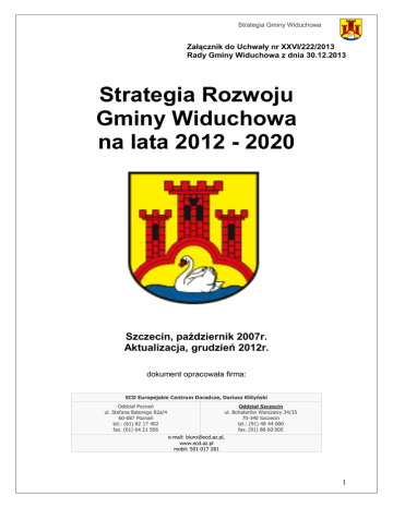 Strategia Gminy Widuchowa Załącznik do Uchwały nr XXVI/222/2013 Rady Gminy Widuchowa z dnia 30.12.2013 Strategia Rozwoju Gminy Widuchowa na lata 2012 - 2020 Szczecin, październik 2007r. Aktualizacja, grudzień 2012r. dokument opracowała firma: ECD Europejskie Centrum Doradcze, Dariusz Klityński Oddział Poznań ul. Stefana Batorego 82a/4 60-687 Poznań tel.: (61) 82 17 402 fax. (61) 64 21 506 Oddział Szczecin ul. Bohaterów Warszawy 34/35 70-340 Szczecin tel.: (91) 48 44 000 fax. (91) 88 60 005 e-mail: [email protected], www.ecd.az.pl mobil: 501 017 281 1 Strategia Gminy Widuchowa SPIS TREŚCI 1. Istota planowania strategicznego ......................................................................................................... 4 2. Diagnoza aktualnego stanu społeczno-gospodarczego Gminy Widuchowa ...................................... 5 3. 4. 2.1. Położenie i warunki demograficzne ............................................................................................. 5 2.2. Infrastruktura społeczna............................................................................................................ 12 2.3. Podmioty gospodarcze i rolnictwo .............................................................................................34 2.4. Finanse samorządu .................................................................................................................... 41 2.5. Infrastruktura techniczna............................................................................................................ 47 Analiza SWOT ..................................................................................................................................... 56 3.1. Założenia metodologiczne ......................................................................................................... 56 3.2. Analiza poszczególnych obszarów życia społeczno- gospodarczego..................................... 60 3.2.1. Finanse gminy ..................................................................................................................... 60 3.2.2. Infrastruktura i Ochrona środowiska ................................................................................... 61 3.2.3. Rozwój gospodarczy ........................................................................................................... 62 3.2.4. Sfera społeczna ................................................................................................................... 63 Misja i cele strategiczne gminy Widuchowa....................................................................................... 63 4.1. Hierarchiczny układ Strategii ..................................................................................................... 63 4.2. Wizja i misja Gminy Widuchowa................................................................................................65 4.3. Cele strategiczne gminy Widuchowa ........................................................................................ 65 4.4. Struktura logiczna Strategii Gminy Widuchowa na lata 2012-2020 ......................................... 81 5. Realizacja i monitoring celów szczegółowych Strategii..................................................................... 83 6. Wdrażanie i monitorowanie Strategii .................................................................................................. 88 6.1. Wdrażanie Strategii .................................................................................................................... 88 6.2. Monitoring i ewaluacja Strategii ................................................................................................. 88 6.3. Promocja programu strategicznego gminy................................................................................ 89 2 Strategia Gminy Widuchowa SPIS TABEL Tab. 1. Udział ludności wg ekonomicznych grup wieku w % ludności ogółem i przedziału wiekowe ........ 6 Tab. 2. Migracje na pobyt stały gminne, wg płci, typu i kierunku – lata 2007 – 2011 ................................. 8 Tab. 3. Bezrobocie w Gminie Widuchowa w latach 2007 – 2011 (dane z końca każdego roku), w liczbie ludności w wieku produkcyjnym................................................................................................................... 11 Tab. 4. Bezrobocie w Gminie Widuchowa w roku 2012 (dane z października br.) ................................... 11 Tab. 5. Szkolnictwo podstawowe i gimnazjalne w Gminie Widuchowa w latach 2007 - 2011 ................. 13 Tab. 6. Kultura w Gminie Widuchowa w ciągu lat 2007 - 2011 .................................................................. 16 Tab. 7. Obiekty zbiorowego zakwaterowania w Gminie Widuchowa w ciągu lat 2007 - 2011 ................. 26 Tab. 8. Placówki ochrony zdrowia w Gminie Widuchowa w latach 2007 - 2011....................................... 29 Tab. 9. Zestawienie wydatków jako zadania zlecone GOPS w Widuchowej w roku 2011 ....................... 32 Tab. 10. Budownictwo mieszkaniowe w Gminie Widuchowa w latach 2007-2011 ................................... 33 Tab. 11. Podmioty gospodarcze w Gminie Widuchowa w latach 2007-2011............................................ 34 Tab. 12. Podmioty gospodarcze w Gminie Widuchowa ............................................................................. 35 Tab. 13. Liczba gospodarstw rolnych w Gminie Widuchowa w poszczególnych miejscowościach w latach 2008-2012 .......................................................................................................................................... 38 Tab. 14. Inwestycje w Gminie Widuchowa w latach 2007-2011 ................................................................43 Tab. 15. Oczyszczanie ścieków w Gminie Widuchowa w latach 2007-2011 ............................................ 50 Tab. 16. Odpady komunalne w Gminie Widuchowa w latach 2007-2011 ................