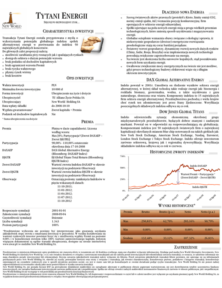 T YTANI ENERGII DLACZEGO NOWA ENERGIA Szereg światowych aktów prawnych (protokół z Kioto, limity emisji CO2, normy emisji spalin, itd.) wzmacnia pozycję konkurencyjną firm operujących w sektorze energii odnawialnej. Spółki operujące na polu nowych energii stoją u progu wielkich przemian technologicznych, które zmienią sposób uzyskiwania i magazynowania energii. Globalne ocieplenie wzmacnia obawy związane z ekologią i sprawia, iż niekorzystnie gospodarczo (droższe) energetyczne rozwiązania proekologiczne stają się coraz bardziej pożądane. Światowy wzrost gospodarczy, dynamiczny rozwój nowych dużych rynków (Chiny, Indie, Rosja, Brazylia) oraz implementacja nowych technologii powodują zwiększone zapotrzebowanie na energię. Na świecie jest skończona liczba surowców kopalnych, stąd poszukiwania nowych form uzyskania energii. Gwałtowne zwiększenie mocy energetycznych na świecie nie jest możliwe, gdyż proces technologiczny budowy elektrowni wiąże się z długim okresem inwestycyjnym. α SIĘGNIJ PO BEZWZGLĘDNY ZYSK… CHARAKTERYSTYKA INWESTYCJI Transakcja Tytani Energii została przygotowana z myślą o wykorzystaniu potencjału globalnego indeksu spółek alternatywnej energii w porównaniu do indeksu 50 największych globalnych koncernów. Do głównych zalet propozycji należą: α możliwość zarabiania przy rosnących jak i spadających rynkach α dostęp do sektora o dużym potencjale wzrostu α brak podatku od dochodów kapitałowych α brak ograniczeń wzrostu Premii α brak ryzyka walutowego α płynny rynek wtórny α brak kosztów α α α α α OPIS INWESTYCJI Waluta inwestycji Minimalna kwota inwestycyjna Forma inwestycji Ubezpieczyciel Ubezpieczający Data wpłaty składki Wypłata gwarantowana* Podatek od dochodów kapitałowych PLN 10 000 zł Ubezpieczenie na życie i dożycie TU Allianz Życie Polska SA New World Holding SA do 2008-10-10 Zwrot kapitału + Premia Nie * Suma ubezpieczenia na dożycie Premia Partycypacja DAXAEP DJGTR Zwrot DAXAEP Zwrot DJGTR Obserwacje PREMIA Płatna w dacie zapadalności. Liczona według wzoru: Max [0%; Partycypacja*(Zwrot DAXAEP – Zwrot DJGTR)] 90,00% - 110,00% ostatecznie określona dnia 17-10-2008 DAX Global Alternative Energy (Bloomberg: DAXAEP Index) DJ Global Titans Total Return (Bloomberg: DJGTR Index) Wartość zwrotu Indeksu DAXAEP w okresie inwestycji na podstawie Obserwacji Wartość zwrotu Indeksu DJGTR w okresie inwestycji na podstawie Obserwacji Oznaczają poziomy zamknięcia Indeksów w pięciu wskazanych datach: 11-10-2011; 11-01-2012; 11-04-2012; 11-07-2012; 11-10-2012 DAX GLOBAL ALTERNATIVE ENERGY Indeks powstał w 2001r. Umożliwia on śledzenie wyników sektora energii alternatywnej, w której skład wchodzą takie rodzaje energii jak: bioenergia i rozkładu biomasy, geotermalna, wodna, a także uzyskiwana z gazu naturalnego, słoneczna oraz wiatru. Komponenty indeksu to 15 największych firm sektora energii alternatywnej. Przedsiębiorstwa pochodzą z wielu krajów choć rynek ten zdominowany jest przez Stany Zjednoczone. Weryfikacja poszczególnych składowych indeksu odbywa się co rok. DOW JONES GLOBAL TITANS Indeks odzwierciedla sytuację ekonomiczną określonej grupy międzynarodowych przedsiębiorstw, będących dobrze znanymi i zaufanymi markami. Powstał on w odpowiedzi na rozpowszechniającą się globalizację. Komponentami indeksu jest 50 największych światowych firm o największej kapitalizacji określanych mianem blue chip notowanych na takich giełdach jak: New York Stock Exchange, American Stock Exchange, Nasdaq, Euronext, London Stock Exchange i Tokyo Stock Exchange. Indeks oferuje inwestorom zarówno sektorową, krajową jak i regionalną dywersyfikację. Weryfikacja składników indeksu odbywa się co rok w czerwcu. HISTORYCZNE ZWROTY INDEKSÓW 750% Indeks DAXAEP 500% Wartość Premii = Partycypacja * (Zwrot DAXAEP – Zwrot DJGTR) 250% Indeks DJGTR 0% W YNIKI HISTORYCZNE* Rozpoczęcie symulacji Zakończenie symulacji Częstotliwość symulacji Liczba symulacji Poziom partycypacji 2001-01-01 2008-09-04 Dziennie 1.343 100% *Przedstawione wyliczenia nie powinny być interpretowane jako gwarancja uzyskania jakiejkolwiek stopy zwrotu z omawianej inwestycji w przyszłości. W wyniku kształtowania się wartości rynkowych inwestor powinien liczyć się z możliwością wypłaty Premii na poziomie 0,00% i w konsekwencji zwrotem tylko 100% wartości zainwestowanego kapitału. Jedynym wiążącym dokumentem są ogólne warunki ubezpieczenia, dostępne na stronie internetowej www.nwai.pl i w siedzibie New World Holding SA. Premia Brutto Max 250,81% 62,70% 203,16% 50,79% Min 0,00% 0,00% 0,00% 0,00% 132,48% 33,12% 107,32% 26,83% Średnia Brutto (p.a.) Netto Netto (p.a.) ZASTRZEŻENIE Przedstawione w niniejszym dokumencie opisy produktowe nie stanowią oferty w rozumieniu art. 66 Kodeksu cywilnego, mają one charakter wyłącznie informacyjny. Działając pod marką New World Alternative Investments, New World Holding SA (dawniej New World Sp. z o.o.) nie świadczy doradztwa w związku z zawieranymi transakcjami ani nie udziela porad inwestycyjnych lub rekomendacji zawarcia transakcji, co oznacza, że udzielone informacje nie mają charakteru porady inwestycyjnej lub rekomendacji. Decyzja zawarcia jakiejkolwiek transakcji należy wyłącznie do Klienta. Przed zawarciem jakiejkolwiek transakcji Klient powinien, nie opierając się na informacjach przekazanych przez New World Holding SA, określić jej ryzyka, potencjalne korzyści oraz straty z związane z transakcją, jak również charakterystykę, konsekwencje prawne, podatkowe i księgowe transakcji, konsekwencje zmieniających się czynników rynkowych oraz w sposób niezależny powinien ocenić, czy jest w stanie sam lub po konsultacjach ze swoimi doradcami podjąć ryzyko transakcyjne. New World Holding SA nie ponosi żadnej odpowiedzialności za ewentualne szkody jakie może ponieść Klient w wyniku zawarcia transa