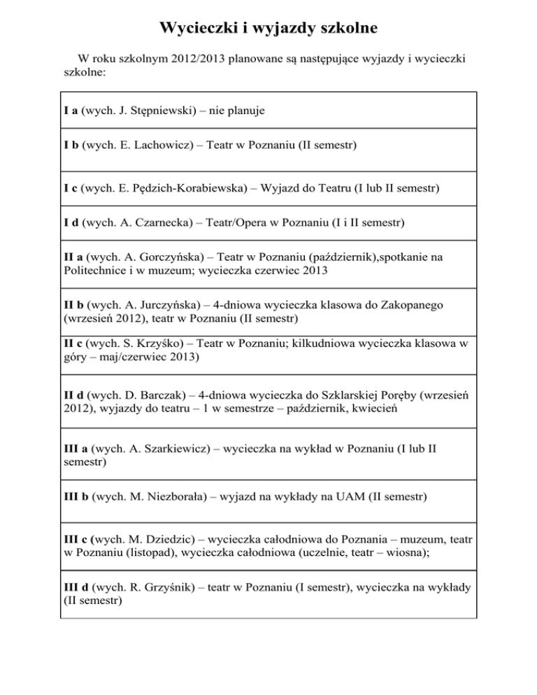 Wycieczki i wyjazdy szkolne W roku szkolnym 2012/2013 planowane są następujące wyjazdy i wycieczki szkolne: I a (wych. J. Stępniewski) – nie planuje I b (wych. E. Lachowicz) – Teatr w Poznaniu (II semestr) I c (wych. E. Pędzich-Korabiewska) – Wyjazd do Teatru (I lub II semestr) I d (wych. A. Czarnecka) – Teatr/Opera w Poznaniu (I i II semestr) II a (wych. A. Gorczyńska) – Teatr w Poznaniu (październik),spotkanie na Politechnice i w muzeum; wycieczka czerwiec 2013 II b (wych. A. Jurczyńska) – 4-dniowa wycieczka klasowa do Zakopanego (wrzesień 2012), teatr w Poznaniu (II semestr) II c (wych. S. Krzyśko) – Teatr w Poznaniu; kilkudniowa wycieczka klasowa w góry – maj/czerwiec 2013) II d (wych. D. Barczak) – 4-dniowa wycieczka do Szklarskiej Poręby (wrzesień 2012), wyjazdy do teatru – 1 w semestrze – październik, kwiecień III a (wych. A. Szarkiewicz) – wycieczka na wykład w Poznaniu (I lub II semestr) III b (wych. M. Niezborała) – wyjazd na wykłady na UAM (II semestr) III c (wych. M. Dziedzic) – wycieczka całodniowa do Poznania – muzeum, teatr w Poznaniu (listopad), wycieczka całodniowa (uczelnie, teatr – wiosna); III d (wych. R. Grzyśnik) – teatr w Poznaniu (I semestr), wycieczka na wykłady (II semestr) Wycieczki międzyoddziałowe (po lekcjach lub w czasie wolnym od zajęć): • Pielgrzymka maturzystów na Jasną Górę (marzec 2013); ks. G. Szczygieł • Pielgrzymka do Skrzatusza (piesza); KS. G. Szczygieł (wrzesień) • Wyjazd na wykłady o tematyce chemicznej (R. Grzyśnik) • Wyjazd na wykłady o tematyce fizycznej (A. Szarkiewicz) • Obóz sportowy* (ferie zimowe) – Z. Szpak Zebrała: Agnieszka Jurczyńska Dyrektor Szkoły: Marzena Szułczyńska