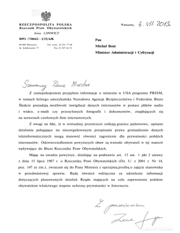 RZECZPOSPOLITA POLSKA Rzecznik Praw O b y w a t e l s k i c h Irena LIPOWICZ RPO -738662 - I/13/AJK 00-090 Warszawa Pan Tel. centr. 22 551 77 00 Al. Solidarności 77 Michał Boni Fax 22 827 64 53 Minister Administracji i Cyfryzacji Z zaniepokojeniem przyjęłam informacje o istnieniu w USA programu PRISM, w ramach którego amerykańska Narodowa Agencja Bezpieczeństwa i Federalne Biuro Śledcze posiadają możliwość inwigilacji danych internautów w postaci plików audio i wideo, e-maili czy przesyłanych fotografii i dokumentów, znajdujących się na serwerach czołowych firm internetowych. Z uwagi na fakt, iż w wirtualnej przestrzeni znikają granice państwowe, opisane działania polegające na nieuregulowanym przepisami prawa gromadzeniu danych teleinformatycznych mogą stanowić również zagrożenie dla prywatności polskich internautów. Odzwierciedleniem powyższych obaw są wnioski obywateli w tej materii wpływające do Biura Rzecznika Praw Obywatelskich. Mając na uwadze powyższe, działając na podstawie art. 13 ust. 1 pkt 2 ustawy z dnia 15 lipca 1987 r. o Rzeczniku Praw Obywatelskich (Dz. U. z 2001 r. Nr 14, poz. 147 ze zm.), zwracam się do Pana Ministra z uprzejmą prośbą o zajęcie stanowiska w przedmiotowej sprawie. Będę również wdzięczna za udzielenie informacji dotyczących planowanych działań Rządu mających na celu zapewnienie polskim obywatelom właściwego stopnia ochrony prywatności w Internecie.