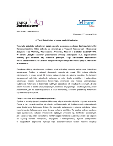 INFORMACJA PRASOWA Warszawa, 27 czerwca 2016 4. Targi Dziedzictwo w trosce o zabytki sakralne Tematyka zabytków sakralnych będzie szeroko poruszana podczas Ogólnopolskich Dni Konserwatorskich, które odbędą się równolegle z Targami Konserwacji i Restauracji Zabytków oraz Ochrony, Wyposażenia Archiwów, Muzeów i Bibliotek DZIEDZICTWO. W panelu „Zabytki sakralne” przewidziano wykłady poświęcone m.in. zagadnieniom ochrony tych obiektów czy aspektom prawnym. Targi Dziedzictwo zaplanowane na 5-7 października br. w Centrum Targowo-Kongresowego MT Polska przy ul. Marsa 56c w Warszawie. Zabytkowe obiekty sakralne wraz z dziełami sztuki kościelnej stanowią ważną część dziedzictwa narodowego. Ogółem w polskich diecezjach znajduje się prawie 33,5 tysiąca obiektów zabytkowych, z czego ponad 12 tysięcy wpisanych jest do rejestru zabytków. Do kategorii nieruchomych zabytków sakralnych zaliczane są m.in. dzieła architektury i budownictwa sakralnego, zespoły budownictwa kościelnego, cmentarze oraz miejsca upamiętniające wydarzenia historyczne i działalność wybitnych osobistości lub instytucji kościelnych. Z kolei zabytki ruchome to dzieła sztuk plastycznych, rzemiosła artystycznego i sztuki użytkowej, zbiory przedmiotów, jak np. szat liturgicznych, a także numizmaty, kościelne przedmioty historyczne czy instrumenty muzyczne. Zabytki sakralne pod kompleksową ochroną Zgodnie z obowiązującymi przepisami kluczową rolę w ochronie zabytków odgrywa wojewoda. Zapisy w tym zakresie znajdują się również w Konkordacie, jak i dokumentach ustanowionych przez Konferencję Episkopatu Polski. Do czynności związanych z ochroną zabytków należą inwentaryzacja, katalogowanie oraz fizyczna ochrona obiektów. Ta ostatnia dotyczy zarówno klęsk żywiołowych, sytuacji kryzysowych będących wynikiem np. konfliktów społecznych, jak i kradzieży czy aktów wandalizmu, na które często narażone są obiekty sakralne ze względu na wysoką wartość historyczną, artystyczną i kolekcjonerską. System postępowania w przypadkach zagrożenia wymaga więc skoordynowanych działań różnych instytucji państwowych, samorządowych i kościelnych oraz wyspecjalizowanych służb, w tym Państwowej Straży Pożarnej, Straży Granicznej i formacji obrony cywilnej. Zakres tematyczny panelu Szczegółowa tematyka tego obszaru dziedzictwa narodowego zostanie omówiona podczas panelu „Zabytki sakralne” organizowanego przez Stowarzyszenie Starożytników, firmę Archaios oraz firmę MT Targi Polska, organizatora Targów Dziedzictwo. Do współpracy zaproszono także Ministerstwo Kultury i Dziedzictwa Narodowego, Narodowy Instytut Dziedzictwa, Stowarzyszenie Konserwatorów Zabytków, Uniwersytet Kardynała Stefana Wyszyńskiego, Narodowy Instytut Muzealnictwa i Ochrony Zbiorów, Kancelarię Prawną Elżanowski, Cherka & Wąsowski oraz Komisję ds. dziedzictwa Konferencji Episkopatu Polski. Prelegenci podczas wystąpień omówią m.in. specyfikę zabytków sakralnych, kwestie związane z ochroną, współpracę diecezjalnych konserwatorów zabytków, obszary formalno-prawne czy procedury naboru do programów europejskich. Poza tym opowiedzą o muzeach diecezjalnych i nowych formach przestępczości zorganizowanej przeciw zabytkom. Specjaliści zaprezentują także wybrane projekty konserwatorskie oraz przybliżą problemy konserwacji sakralnych obiektów drewnianych na przykładzie cerkwi kościoła prawosławnego. Organizatorzy oraz patroni honorowi Targów Dziedzictwo Organizatorem targów jest firma MT Targi Polska wraz z partnerami: Polskim Komitetem Błękitnej Tarczy, Stowarzyszeniem Starożytników, Stowarzyszeniem Konserwatorów Zabytków, Uniwersytetem Kardynała Stefana Wyszyńskiego oraz firmą Archaios. Targi zostały objęte patronatem honorowym: Małgorzaty Kidawy-Błońskiej - wicemarszałka Sejmu Rzeczypospolitej Polskiej, prof. dr. hab. Wojciecha Fałkowskiego - podsekretarza stanu w Ministerstwie Obrony Narodowej, Adama Struzika - marszałka województwa mazowieckiego, Hanny Gronkiewicz-Waltz - prezydent m.st. Warszawy, ks. bp. Wiesława Alojzego Meringa - biskupa Diecezji Włocławskiej, przewodniczącego Rady ds. Kultury i Ochrony Dziedzictwa Kulturowego Konferencji Episkopatu Polski, Jego Eminencji Wielce Błogosławionego Sawy - prawosławnego Metropolity Warszawskiego i całej Polski, dr. Wojciecha Woźniaka - naczelnego dyrektora Archiwów Państwowych, dr. Tomasza Makowskiego - dyrektora Biblioteki Narodowej, nadbryg. mgr. inż. Leszka Suskiego - komendanta głównego Państwowej Straży Pożarnej, szefa Obrony Cywilnej Kraju. Patronat nad Ogólnopolskimi Dniami Konserwatorskimi sprawują: dr hab. Magdalena Gawin - podsekretarz stanu w Ministerstwie Kultury i Dziedzictwa Narodowego, Generalny Konserwator Zabytków oraz Barbara Jezierska - Mazowiecki Wojewódzki Konserwator Zabytków. Więcej informacji na www.targidziedzictwo.pl. *** Kontakt PR: Joanna Kuźma, Lawenda Public Relations, [email protected], tel. 502 096 072 Agnieszka Kuźma-Filipek, Lawenda Public Relations, [email protected], tel. 601 99 10 89 Ewa Prochowicz, koordynator działu marketingu, MT Targi Polska, [email protected], tel. 22 529 39 26 _______ MT Targi Polska to jeden z wiodących w Polsce i największy na rynku warszawskim organizator imprez targowych. Firma organizuje 8 imprez wystawienniczych, które rocznie gromadzą ponad 2000 wystawców i 80 000 zwiedzających. W kalendarium znajdują się targi, które bardzo dobrze znane są za granicą, a w Polsce zyskały miano najważniejszych wydarzeń targowych. Są to: EuroGastro, EuroLab, CrimeLab, TT Warsaw, Lato, WorldHotel, Dziedzictwo oraz Infrastruktura. Firma MT Targi Polska bierze udział w ogólnopolskiej kampanii Polskiej Izby Przemysłu Targowego pt. „Targi dają więcej! Czasu, kontaktów, wiedzy, pieniędzy”. Celem kampanii jest budowanie pozytywnego wizerunku imprez targowych, zachęcenie Polaków do ich o