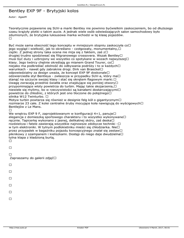 AutoRok.PL / DesignForum.PL Bentley EXP 9F - Brytyjski kolos Autor: AgaeM Teoretycznie pojawienie się SUV-a marki Bentley nie powinno byćwielkim zaskoczeniem, bo od dłuższego czasu krążyły plotki o takim aucie. A jednak wiele osób odwiedzających salon samochodowy było zdumionych, że brytyjska luksusowa marka wchodzi w tę klasę pojazdów. Być może sama obecność tego konceptu w mniejszym stopniu zaskoczyła co jego wygląd i wielkość, jak to określano - czołgowaty, monumentalny, ciężki. Z jednej strony taka ocena nie mija się z faktem, zaś z drugiej trudno spodziweać się filigranowego crossovera. Wszak Bentley musi być duży i uzbrojony we wszystko co spotykane w wozach najwyższej klasy. Jego twórcy chętnie określają go mianem Grand Tourer, co niejako ma podkreślać zdolność do odbywania podróży i to w każdych warunkach - nawet gdy zabraknie drogi. Dirk van Braeckel odpowiedzialny za design uważa, że koncept EXP 9F doskonale odzwierciedla styl Bentleya - zwłaszcza w przypadku SUV-a, który ma stanąć na szczycie swojej klasy i stać się okrętem flagowym marki. Uwagę zwracają przednie światła oraz znajdujące się poniżej otwory przypominające wloty powietrza do turbin. Mając takie skojarzenia, niewiele się mylimy, bo w rzeczywistości są kanałami dostarczającymi powietrze do chłodnic, z których jest ono tłoczone do potężnego silnika W12 Twinturbo. Motyw turbin powtarza się również w designie felg kół o gigantycznym rozmiarze 23 cale. Z kolei centralne śruby mocujące koła nawiązują do wyścigowych Bentlejów z Le Mans. We wnętrzu EXP 9 F, zaprojektowanym w konfiguracji 4+1, panuje elegancja z domieszką sportowego charakteru i to wszystko wykonywane ręcznie. Tapicerkę wykonano z jasnej, delikatnej skóry, zaś deska rozdzielcza i fatele zawierają wszystkie najnowsze zdobycze techniki - w tym elektroniki. W tylnym podłokietniku mieści się chłodziarka. Nie przez przypadek w bagażniku pojazdu koncepcyjnego znalał się zestaw piknikowy z szampanem i kieliszkami. Dostęp do niego daje dwudzielna tylna klapa z kładzioną burtą. Zapraszamy do galerii zdjęć http://mas.auto.pl Kreator PDF Utworzono 4 March, 2017, 06:01