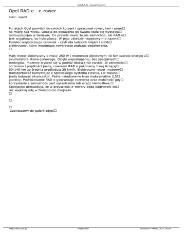 AutoRok.PL / DesignForum.PL Opel RAD e - e-rower Autor: AgaeM Po latach Opel powrócił do swoich korzeni i opracował rower, tym razem na miarę XXI wieku. Okazją do pokazania go światu stała się wystawa motoryzacyjna w Genewie. Co prawda rower to nie samochód, ale RAD e jest wyjątkowy, bo hybrydowy. W jego układzie napędowym o nazwie Pedelec współpracuje człowiek - czyli siła ludzkich mięśni i silnik elektryczny, który wspomaga rowerzystę podczas pedałowania. Mały motor elektryczny o mocy 250 W i momencie obrotowym 40 Nm czerpie energię z akumulatora litowo-jonowego. Dzięki wspomaganiu, bez specjalnych treningów, możemy wybrać się w podróż dłuższą niż zwykle. W zależności od terenu i prędkości jazdy, rowerem RAD e pokonamy trasę liczącą 60-145 km ze średnią prędkością 20 km/h. Elektryczny rower możemy transportować korzystając z oplowskiego systemu FlexFix, i w trakcie jazdy ładować akumulator. Pełne naładowanie trwa maksymalnie 2,5 godziny. Podróżowanie RAD e gwarantuje rozrywkę oraz mobilność gdy korzystanie z samochodu jest ograniczone lub wręcz niemożliwe. Specjaliści przewidują, że w przyszłości e-rowery będą odgrywały co raz większą rolę w transporcie miejskim. Zapraszamy do galerii zdjęć http://mas.auto.pl Kreator PDF Utworzono 4 March, 2017, 06:01