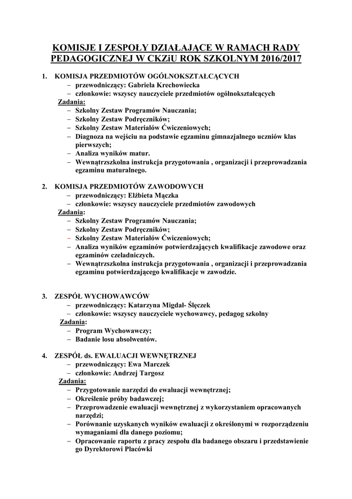 KOMISJE I ZESPOŁY DZIAŁAJĄCE W RAMACH RADY PEDAGOGICZNEJ W CKZiU ROK SZKOLNYM 2016/2017 1. KOMISJA PRZEDMIOTÓW OGÓLNOKSZTAŁCĄCYCH przewodniczący: Gabriela Krechowiecka członkowie: wszyscy nauczyciele przedmiotów ogólnokształcących Zadania: Szkolny Zestaw Programów Nauczania; Szkolny Zestaw Podręczników; Szkolny Zestaw Materiałów Ćwiczeniowych; Diagnoza na wejściu na podstawie egzaminu gimnazjalnego uczniów klas pierwszych; Analiza wyników matur. Wewnątrzszkolna instrukcja przygotowania , organizacji i przeprowadzania egzaminu maturalnego. 2. KOMISJA PRZEDMIOTÓW ZAWODOWYCH przewodniczący: Elżbieta Mączka członkowie: wszyscy nauczyciele przedmiotów zawodowych Zadania: Szkolny Zestaw Programów Nauczania; Szkolny Zestaw Podręczników; Szkolny Zestaw Materiałów Ćwiczeniowych; Analiza wyników egzaminów potwierdzających kwalifikacje zawodowe oraz egzaminów czeladniczych. Wewnątrzszkolna instrukcja przygotowania , organizacji i przeprowadzania egzaminu potwierdzającego kwalifikacje w zawodzie. 3. ZESPÓŁ WYCHOWAWCÓW przewodniczący: Katarzyna Migdał- Ślęczek członkowie: wszyscy nauczyciele wychowawcy, pedagog szkolny Zadania: Program Wychowawczy; Badanie losu absolwentów. 4. ZESPÓŁ ds. EWALUACJI WEWNĘTRZNEJ przewodniczący: Ewa Marczek członkowie: Andrzej Targosz Zadania: Przygotowanie narzędzi do ewaluacji wewnętrznej; Określenie próby badawczej; Przeprowadzenie ewaluacji wewnętrznej z wykorzystaniem opracowanych narzędzi; Porównanie uzyskanych wyników ewaluacji z określonymi w rozporządzeniu wymaganiami dla danego poziomu; Opracowanie raportu z pracy zespołu dla badanego obszaru i przedstawienie go Dyrektorowi Placówki 5. ZESPÓŁ ds. DOSKONALENIA ZAWODOWEGO NAUCZYCIELI przewodniczący: Paweł Dobrzański członkowie: Jarosław Rusek Zadania: Plan Doskonalenia Zawodowego Nauczycieli. 6. ZESPÓŁ ds. SZKOLNEGO PROGRAMU PROFILAKTYKI przewodniczący: Aleksandra Fraś członkowie: Elżbieta Mączka Zadania: Program Profilaktyki. 7. ZESPÓŁ ds. BEZPIECZEŃSTWA przewodniczący: Hanna Serwin członkowie: Aleksandra Fraś Pielęgniarka szkolna Krzysztof Kruk Tomasz Joniec Ks. Rafał Bobek Paweł Dobrzański Aleksander Starowicz Zadania : Plan pracy koordynatora ds. bezpieczeństwa w szkole; Procedura postępowania w razie wypadku; Dokumentacja BHP, PPOŻ, pierwsza pomoc; Procedura ewakuacji uczniów i nauczycieli z budynku szkoły. 8. ZESPÓŁ ds. ROZWOJU I PROMOCJI SZKOŁY przewodniczący: Jarosław Rusek członkowie: Aleksandra Fraś Katarzyna Migdał - Ślęczek Zuzanna Polańska Gabriela Krechowiecka Agnieszka Despet Zadania: Roczny Plan Pracy Centrum; Kronika – Zuzanna Polańska, Agnieszka Despet; Harmonogram imprez – Gabriela Krechowiecka Prasówka – Aleksandra Fraś, Jarosław Rusek. 9. Komisja ds. STATUTU Centrum Kształcenia Zawodowego i Ustawicznego przewodniczący: Aleksandra Tomera członkowie: Bożena Kruk Zadania: Statut Centrum – aktualizacja; Aktualizacja podstawowych dokumentów Centrum. 10. Komisja ds. STATUTU Ośrodka Dokształcania i Doskonalenia Zawodowego przewodniczący: Anna Glińska- Grochal - członkowie: Elżbieta Mączka Zadania: Statut Ośrodka – aktualizacja; Aktualizacja podstawowych dokumentów Ośrodka. 11. Komisja ds. STATUTU Zasadniczej Szkoły Zawodowej im. Krakowskiego Bractwa Kurkowego Przewodniczący: Anna Hanczakowska członkowie: Gabriela Krechowiecka Zadania: Statut Szkoły – aktualizacja; Aktualizacja podstawowych dokumentów szkoły. 12. Komisja ds. STATUTU Liceum Ogólnokształcącego dla Dorosłych przewodniczący: Zuzanna Polańska członkowie: Agnieszka Despet Aleksandra Tomera Zadania: Statut Szkoły – aktualizacja; Aktualizacja podstawowych dokumentów szkoły. 13. Komisja ds. STATUTU Technikum przewodniczący: Agnieszka Król członkowie: Elżbieta Mączka Zadania: Statut Szkoły – aktualizacja; Aktualizacja podstawowych dokumentów szkoły. 14. Komisja Rekrutacyjna przewodniczący: wicedyrektor pełnomocnik dyrektora ds. rekrutacji jako zastępca przewodniczącego Agnieszka Despet członkowie: kandydaci na wychowawców klas pierwszych w roku szkolnym, na który odbywa się nabór(Uczniowie ZSZ oraz Technikum); pedagog w zależności od potrzeb; opiekun szkoły dla Dorosłych (Słuchacze LO); kierownik Ośrodka (Uczestnicy KKZ). Zadania: Prowadzenie postępowania rekrutacyjnego do szkół wchodzących w skład Centrum; Regulamin szkolnej komisji rekrutacyjnej.