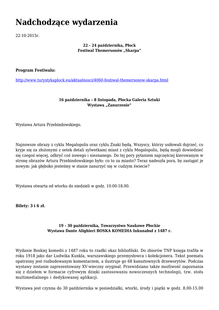 Nadchodzące wydarzenia 22-10-2015r. 22 - 24 października, Płock Festiwal Themersonów „Skarpa” Program Festiwalu: http://www.turystykaplock.eu/aktualnosci/4060-festiwal-themersonow-skarpa.html 16 października – 8 listopada, Płocka Galeria Sztuki Wystawa „Zanurzenie” Wystawa Artura Przebindowskiego. Najnowsze obrazy z cyklu Megalopolis oraz cyklu Znaki będą. Wszyscy, którzy usiłowali dojrzeć, co kryje się za złożonymi z setek detali sylwetkami miast z cyklu Megalopolis, będą mogli dowiedzieć się czegoś więcej, odkryć coś nowego i nieznanego. Do tej pory pytaniem najczęściej kierowanym w stronę obrazów Artura Przebindowskiego było: co to za miasto? Teraz nadeszła pora, by zastąpić je nowym: jak głęboko jesteśmy w stanie zanurzyć się w cudzym świecie? Wystawa otwarta od wtorku do niedzieli w godz. 10.00-18.00. Bilety: 3 i 6 zł. 19 - 30 października, Towarzystwo Naukowe Płockie Wystawa Dante Alighieri BOSKA KOMEDIA Inkunabuł z 1487 r. Wydanie Boskiej komedii z 1487 roku to rzadki okaz bibliofilski. Do zbiorów TNP księga trafiła w roku 1918 jako dar Ludwika Kunkla, warszawskiego przemysłowca i kolekcjonera. Tekst poematu opatrzony jest rozbudowanym komentarzem, a ilustruje go 68 kunsztownych drzeworytów. Podczas wystawy zostanie zaprezentowany XV-wieczny oryginał. Przewidziano także możliwość zapoznania się z dziełem w formacie cyfrowym dzięki zastosowaniu nowoczesnych technologii, tzw. stołu multimedialnego i dedykowanej aplikacji. Wystawa jest czynna do 30 października w poniedziałki, wtorki, środy i piątki w godz. 8.00-15.00 oraz w czwartki w godz. 10.00-18.00 Wstęp wolny 15 października – 30 grudnia, Spichlerz (ul. Kazimierza Wielkiego 11b) „Kultura Mazowsza w ludowej wizji świata” „Sztuka Dalekiego Wschodu. Płockie skarby buddyjskiej Azji” Wystawy będzie można oglądać do 30 grudnia br. Wstęp wolny 23 października, godz. 19.00, sala koncertowa PSM (ul. Kolegialna 23) Dire Straits Symfonicznie Wykonawcy: Kuba Badach – wokal Marek Napiórkowski – gitara Bartosz Szetela – gitara basowa Tomasz Kałwak – instrumenty klawiszowe Paweł Dobrowolski – perkusja Płocka Orkiestra Symfoniczna Krzysztof Herdzin – dyrygent, aranżer Program: „Money for Nothing”, „Sultans of Swing”, „Walk of life”, „Brothers in Arms”, „Your latest trick”, „Private Investigations” i inne doskonale znane piosenki legendarnego brytyjskiego zespołu Dire Straits zaaranżowane na orkiestrę symfoniczną przez Krzysztofa Herdzina Bilety: 40 zł 24 października, godz. 20.00, Rock’69 (Pl. Narutowicza 2) Thesis Zespół THESIS działa na polskiej scenie od 2007 roku. Wydał do tej pory debiutancką płytę „Channel 1”, dwie EPki "Acoustic Music EP 1" oraz "Fates EP 2", był częścią składanki Piotra Kaczkowskiego Minimax vol. 5 oraz prężnie koncertuje na różnych scenach w Polsce. 21 lutego 2014 roku ukazała się najnowsza płyta zespołu "Z Dnia Na Dzień Na Gorsze". Zaśpiewana w całości w języku polskim dostępna jest na CD, LP oraz cyfrowo za pośrednictwem www.thesis.8merch.com Zespół określa swoją muzykę jako Psychodeliczny Progresywny Post Rock i łączy na scenie żywiołową muzykę z wizualizacjami miksowanymi na żywo. Bilety: 10 zł 24 października, godz. 19.00, Teatr Dramatyczny im. Jerzego Szaniawskiego Wyspa Hobsona Spektakl powstał we współpracy Teatru Dramatycznego w Płocku i Stowarzyszenia Teatr Per Se. Sensacyjna historia przepleciona humorem i pytaniami o to, kim jesteśmy i dokąd zmierzamy. Adaptacja powieści utrzymanej w nastroju kryminalnym, a zarazem filozoficznym. Tytułowa wyspa na Atlantyku, odcięta od świata, staje się nagle przedmiotem zainteresowania służb specjalnych różnych państw. Dzieje osiadłej na niej rodziny, historia obalonego czarnego prezydenta afrykańskiej republiki, losy uwikłanego w szpiegostwo uczonego i jego żony splatają się w intrygującą, dowcipną opowieść. Spektakl zrealizowany w ramach Festiwalu Themersonów „SkArPA” Płockiego Ośrodka Kultury i Sztuki. Obsada: Katarzyna Anzorge (gościnnie), Piotr Bała, Henryk Błażejczyk, Magdalena Bogdan, Dorota Cempura, Szymon Cempura, Hanna Chojnacka, Henryk Jóźwiak, Bogumił Karbowski, Jacek Mąka, Łukasz Mąka, Mariusz Pogonowski, Krzysztof Popczuk, Marek Walczak, Katarzyna Wieczorek, Hanna Zientara Uczestnicy warsztatów teatralnych Stowarzyszenia Teatr Per Se: Filip Czekaj, Weronika Dzięgielewska, Karolina Gorzycka, Adrian Piwoński, Joanna Racińska, Oliwia Rychlik. Wstęp wolny. Bezpłatne zaproszenie do odbioru w kasie Teatru. 25 października, godz. 12.45, Stadion im. Kazimierza Górskiego Wisła Płock – Chrobry Głogów Bilety i karnety można kupować: - na stoisku klubowym w Galerii Mazovia - od wtorku do piątku od godz. 13 do 20 oraz w sobotę od 11 do 18, niedziela 13-18; - w sklepiku klubowym na stadionie od poniedziałku do piątku w godzinach 8-16. Bilet jednorazowy w przedsprzedaży: - trybuna wschodnia (sektor B, C) - 8,00 zł. - trybuna zachodnia (sektor G) - 13,00 zł. - trybuna zachodnia (sektor G) – emeryci i renciści III grupy - 8,00 zł. Bilet jednorazowy w dniu meczu: - trybuna wschodnia (sektor B, C) - 11,00 zł. - trybuna zachodnia (sektor G) - 16,00 zł. - trybuna zachodnia (sektor H) – 21,00zł - trybuna zachodnia (sektor H - rodzinny) - 21,00 zł. - loża honorowa (sektor H) - 40,00 zł. - loża honorowa (sektor H) - osoby niepełnosprawne poruszające się na wózkach inwalidzkich – 1zł. - trybuna wschodnia (sektor E - kibice gości) - 15,00 zł. - Panie – 2,00zł - dzieci od 6 do 13 lat – 1,00zł - dzieci do lat 6 – zaproszenie - trybuna zachodnia (sektor G) – emeryci i renciści III grupy - 11,00 zł. 25 października, godz. 18.00, Orlen Arena Wisła Płock – Flensubrg-Handewitt Mecz Ligii Mistrzów Ceny biletów: Sektory A, B, C, D, J, K, L, M – 65 zł Sektory E, F, F1, H, H1, I – 40 zł Sektory B1, C1, D