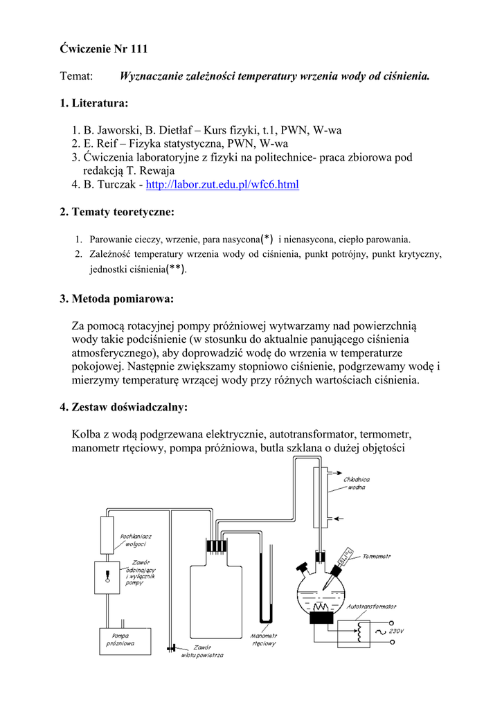 Ćwiczenie Nr 111 Temat: Wyznaczanie zależności temperatury wrzenia wody od ciśnienia. 1. Literatura: 1. B. Jaworski, B. Dietłaf – Kurs fizyki, t.1, PWN, W-wa 2. E. Reif – Fizyka statystyczna, PWN, W-wa 3. Ćwiczenia laboratoryjne z fizyki na politechnice- praca zbiorowa pod redakcją T. Rewaja 4. B. Turczak - http://labor.zut.edu.pl/wfc6.html 2. Tematy teoretyczne: 1. Parowanie cieczy, wrzenie, para nasycona(*) i nienasycona, ciepło parowania. 2. Zależność temperatury wrzenia wody od ciśnienia, punkt potrójny, punkt krytyczny, jednostki ciśnienia(**). 3. Metoda pomiarowa: Za pomocą rotacyjnej pompy próżniowej wytwarzamy nad powierzchnią wody takie podciśnienie (w stosunku do aktualnie panującego ciśnienia atmosferycznego), aby doprowadzić wodę do wrzenia w temperaturze pokojowej. Następnie zwiększamy stopniowo ciśnienie, podgrzewamy wodę i mierzymy temperaturę wrzącej wody przy różnych wartościach ciśnienia. 4. Zestaw doświadczalny: Kolba z wodą podgrzewana elektrycznie, autotransformator, termometr, manometr rtęciowy, pompa próżniowa, butla szklana o dużej objętości 5. Wykonanie ćwiczenia: a) Zamknąć zawór wlotu powietrza. (podkreślono nazwy użyte na rysunku) b) Otworzyć zawór odcinający, który włącza automatycznie pompę próżniową. Jeśli pompa nie włączy się, sprawdzić, czy bezpiecznik sieciowy w stole laboratoryjnym jest włączony. c) Odkręcić kran wodny, do którego podłączona jest chłodnica. d) Odczekać 2-3 minuty, aż w kolbie wytworzy się znaczne podciśnienie i włączyć ogrzewanie kolby, przekręcając pokrętło autotransformatora w prawo do oporu. e) Gdy woda w kolbie zaczynie wrzeć zanotować temperaturę wrzenia wody, odczytując wskazanie termometru elektronicznego. f) Zanotować wysokość słupka rtęci w obu ramionach manometru (h1 i h2). g) Wyłączyć pompę próżniową za pomocą za pomocą zaworu odcinającego sprzężonego z wyłącznikiem. h) Za pomocą zaworu wlotu powietrza wpuścić nieco powietrza do kolby, tak, aby słupek rtęci w prawym ramieniu manometru opadł o ok. 2cm. i) Gdy woda w kolbie zaczynie wrzeć zapisać temperaturę wrzenia wody. j) Zanotować wysokość słupka rtęci w obu ramionach manometru (h1 i h2). k) Czynności opisane w punktach h, i, j powtarzać aż do zrównania ciśnienia powietrza wewnątrz kolby z ciśnieniem atmosferycznym (h1=h2). l) Odczytać ciśnienie atmosferyczne b wskazywane przez wiszący w laboratorium na ścianie barometr. m) Wyniki zebrać w tabeli: t Nr pom. 1 2 3 4 5 6 7 8 9 10 11 12 13 14 15 [oC] Poziom rtęci w manometrze h1 h2 [mm Hg] [mm Hg] p1 =h1-h2 b p=b-p1 [mm [mm Hg] [mm Hg] Hg] p [Pa] ln p T [K] 1000 T 1 K 6. Opracowanie wyników pomiarów: a) Uzupełnić tabelę a następnie sporządzić wykres zależności T=f(p), 1000 (*) b) Sporządzić wykres zależności ln p f T (p- liczbowa wartość ciśnienia wyrażonego w paskalach, T- liczbowa wartość temperatury wyrażonej w kelwinach) c) metodą regresji liniowej wyznaczyć parametry a i b prostej: C p 1000 ln p ln A prosta typu : 1000 R T y a x b oraz niepewności tych parametrów u(a) oraz u(b) d) Obliczyć molowe ciepło parowania Cp oraz niepewność jego wyznaczenia: C p 1000 R a C p u (C p ) a 2 C u 2 (a) p u (a) |a| e) Porównać uzyskaną wartość Cp z danymi tablicowymi dla pary wodnej. -----------------------------------------------(*) przybliżona zależność ciśnienia pary nasyconej od temperatury dana jest wzorem Clausiusa-Clapeyrona Cp p , T T V którego uproszczonym rozwiązaniem jest: (patrz: Lit. 2, str. 316) p Ae Cp R T gdzie: Cp- molowe ciepło parowania R- stała gazowa; R 8,31 J K mol A- pewna stała 1000 Wykładnicza postać tego wzoru sugeruje, że wykres ln p f T powinien być linia prostą (**) przeliczenia ciśnienia wyrażonego w [mm Hg] na paskale można dokonać 101325 Pa według wzoru p[ Pa] p[mmHg ] 760mm