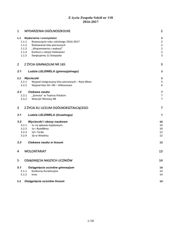Z życia Zespołu Szkół nr 118 2016-2017 1 WYDARZENIA OGÓLNOSZKOLNE 2 1.1 Wydarzenia i uroczystości 1.1.1 Rozpoczęcie roku szkolnego 2016-2017 1.1.2 Ślubowanie klas pierwszych 1.1.3 „Wspomnienia z wakacji” 1.1.4 Konkurs z okazji Halloween 1.1.5 Świętujemy 11 listopada 2 2 2 2 2 3 2 3 2.1 Z ŻYCIA GIMNAZJUM NR 165 3 Ludzie LELEWELA (gimnazjalnego) 2.2 Wycieczki 2.2.1 Wyjazd integracyjny klas pierwszych – Ryte Błota 2.2.2 Wyjazd klas IIA i IID – Mikoszewo 5 5 6 2.3 Ciekawa nauka 2.3.1 „Zemsta” w Teatrze Polskim 2.3.2 Wieczór filmowy IIB 7 7 7 3 7 3.1 Z ŻYCIA XLI LICEUM OGÓLNOKSZTAŁCĄCEGO 7 Ludzie LELEWELA (licealnego) 3.2 Wycieczki i obozy naukowe 3.2.1 1c na spływie kajakowym 3.2.2 1e i RyteBłota 3.2.3 1d i Tarda 3.2.4 1b w Wiedniu 10 10 10 12 12 3.3 13 Ciekawa nauka w liceum 4 WOLONTARIAT 13 5 OSIĄGNIĘCIA NASZYCH UCZNIÓW 14 5.1 Osiągnięcia uczniów gimnazjum 5.1.1 Konkursy Kuratoryjne 5.1.2 Inne 5.2 14 14 14 Osiągnięcia uczniów liceum 14 1/18 1 Wydarzenia ogólnoszkolne 1.1 Wydarzenia i uroczystości 1.1.1 Rozpoczęcie roku szkolnego 2016-2017 Uroczyste rozpoczęcie roku szkolnego przygotowała prof. Marzena Kamińska z klasą 2f. 1.1.2 Ślubowanie klas pierwszych Uroczystość odbyła się 30 września. 1.1.3 „Wspomnienia z wakacji” 1.1.4 Konkurs z okazji Halloween Z okazji Halloween samorząd szkolny zorganizował konkurs na najpiękniejszą dynię. Jury w postaci nauczycieli i samorządu wybrało dynię klasy 2a liceum. Zwycięska klasa, a przede wszystkim autor dyni, zostali nagrodzeni słodkim upominkiem :) Wszystkim klasom biorącym udział bardzo dziękujemy 2/18 1.1.5 Świętujemy 11 listopada Niepytanie za przebranie 1.1.6 Mikołajki i niepytanie za przebranie 2 Z życia Gimnazjum nr 165 2.1 Ludzie LELEWELA (gimnazjalnego) Klasy trzecie 3/18 Klasy drugie 4/18 Klasy pierwsze Brak zdjęcia klasy IA 2.2 2.2.1 Wycieczki Wyjazd integracyjny klas pierwszych – Ryte Błota Klasa IA i IB Dnia 05.09.2016 wraz z klasą Ia wsiedliśmy do stojącego pod szkołą autokaru. Już w czasie drogi zawarliśmy pierwsze znajomości. Było bardzo gwarno i radośnie. Po około trzech godzinach dotarliśmy na miejsce-nadleśnictwo Ryte Błota. Od razu po ulokowaniu się w trzyosobowych pokojach udaliśmy się na zajęcia integracyjne, podczas których m.in. budowaliśmy z rur kanał i przechodziliśmy ponad zawieszoną wysoko liną. Było bardzo dużo śmiechu. Po kolacji natomiast wraz z Ia mieliśmy okazję poszaleć na karaoke. Od razu zaczęliśmy śpiewać niemal całymi klasami. Następnego dnia od razu po śniadaniu mogliśmy sprawdzić się w takich konkurencjach jak strzelanie z łuku, golf czy piłka. Tego dnia braliśmy także udział w grach: na orientację z kompasami, terenowej-leśnych podchodach oraz wieczornej z szukaniem odpowiednich kartek. Ostatniego dnia spisaliśmy kontrakt klasowy-zasady, których będziemy przestrzegać, by miło nam się ze sobą żyło, po czym udaliśmy się z powrotem do Warszawy. Wyjazd integracyjny wszystkim bardzo się podobał. Była to w dużej mierze zasługa naszych opiekunów, pani Oli i pana Bartka. 5/18 Barbara Wilczyńska Ib Klasa IC i ID 2.2.2 Wyjazd klas IIA i IID – Mikoszewo Klasa II A wraz z klasą IID wybrały się na integracyjną wycieczkę do Mikoszewa. Wyjazd trwał cztery dni i trzy noce. Zatrzymalismy się w ośrodku ‘Solar’. Było z nami kilku nauczycieli – Pani B.Łazęcka, Pani J.Koziara, Siostra Bożena oraz Pan K.Bączyk. W planie wycieczki były między innymi zajęcia takie jak: - Nocne zbieranie bursztynów -„Zabawa” w parku linowym - Pożegnalne ognisko Wycieczka bardzo się udała, a uczniowie są zadowoleni ze wspólnie spędzonego czasu. Gabrysia Gruchała IIA 6/18 2.3 Ciekawa nauka 2.3.1 „Zemsta” w Teatrze Polskim 2.3.2 Wieczór filmowy IIB 14.10.2016 w klasie IIb odbył się wieczór filmowy. Obejrzeliśmy filmy pt. "Mr. & Mrs. Smith", "Stowarzyszenie umarłych poetów", a także "Zwierzogród". Wszystkie filmy cieszyły się dużym zainteresowaniem. 3 Z życia XLI Liceum Ogólnokształcącego 3.1 Ludzie LELEWELA (licealnego) Klasy trzecie Brak zdjęcia klasy 3b 7/18 Klasy drugie 8/18 Klasy pierwsze 9/18 3.2 Wycieczki i obozy naukowe 3.2.1 1c na spływie kajakowym Drugiego dnia września, o godzinie 7:30 klasa 1c zebrała się licznie pod budynkiem szkoły. Każdy, podekscytowany zapachem nadchodzącej przygody kolejno wsiadał do autobusu. Czekała ich pięciogodzinna droga do Augustowa, gdzie wszystko miało się zacząć. Co czekało ich na miejscu oprócz pysznego obiadu? - długotrwałe rozkładanie namiotów, które wcale nie okazało się być łatwą sztuką oraz ćwiczenia przygotowujące do podróży w kajakach. Po wyczerpujących instrukcjach (jak używać wioseł i co zrobić, żeby się nie utopić) wszyscy zasieli wokół ogniska, gdzie jedząc kiełbaski, namiętnie rozmawiali, poznając siebie nawzajem. Kolejną, ostatnią już przed snem atrakcją były sauny, z których skorzystał prawie każdy. Następny dzień rozpoczął się wczesną pobudką, składaniem namiotów i jazdą w górę rzeki. Przepłynęli aż 12 kilometrów w dół Czarnej Hańczy. Kolejnym postojem był dom Pani sołtysowej. Obiad zjedzony w niezwykłej stodole, rozłożone namioty, czas wolny na gry i zabawy, kolejne ognisko i sauna. Tak minął dzień drugi wycieczki integracyjnej klasy biologiczno-chemicznej. Rano cała grupa wyruszyła w dalszą bitwę z wodami mazurskich rzek. Śmiechu i żartów w podróży nie brakowało, kiedy woda nalewała się do kajaków. Niektórym udawało się nawet z nich wypadać! Tego dnia każdy musiał zadbać o swój obiad osobiście, a z racji, iż deszczu również nie brakowało, wszyscy pochowali się w namiotach, rozmawiając i grając w karty. Kolejny dzień nie różnił się od pozostałych. Zabawa była coraz lepsza. Grupa wróciła na miejsce, w którym spała pierwszego wieczora. Ostatniej nocy podróżnicy nie mogli się rozsta
