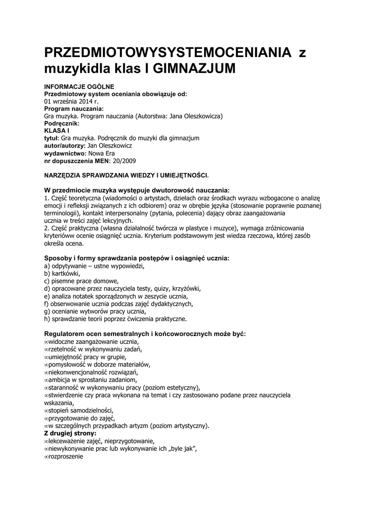 PRZEDMIOTOWYSYSTEMOCENIANIA z muzykidla klas I GIMNAZJUM INFORMACJE OGÓLNE Przedmiotowy system oceniania obowiązuje od: 01 września 2014 r. Program nauczania: Gra muzyka. Program nauczania (Autorstwa: Jana Oleszkowicza) Podręcznik: KLASA I tytuł: Gra muzyka. Podręcznik do muzyki dla gimnazjum autor/autorzy: Jan Oleszkowicz wydawnictwo: Nowa Era nr dopuszczenia MEN: 20/2009 NARZĘDZIA SPRAWDZANIA WIEDZY I UMIEJĘTNOŚCI. W przedmiocie muzyka występuje dwutorowość nauczania: 1. Część teoretyczna (wiadomości o artystach, dziełach oraz środkach wyrazu wzbogacone o analizę emocji i refleksji związanych z ich odbiorem) oraz w obrębie języka (stosowanie poprawnie poznanej terminologii), kontakt interpersonalny (pytania, polecenia) dający obraz zaangażowania ucznia w treści zajęć lekcyjnych. 2. Część praktyczna (własna działalność twórcza w plastyce i muzyce), wymaga zróżnicowania kryterióww ocenie osiągnięć ucznia. Kryterium podstawowym jest wiedza rzeczowa, której zasób określa ocena. Sposoby i formy sprawdzania postępów i osiągnięć ucznia: a) odpytywanie – ustne wypowiedzi, b) kartkówki, c) pisemne prace domowe, d) opracowane przez nauczyciela testy, quizy, krzyżówki, e) analiza notatek sporządzonych w zeszycie ucznia, f) obserwowanie ucznia podczas zajęć dydaktycznych, g) ocenianie wytworów pracy ucznia, h) sprawdzanie teorii poprzez ćwiczenia praktyczne. Regulatorem ocen semestralnych i końcoworocznych może być: • widoczne zaangażowanie ucznia, • rzetelność w wykonywaniu zadań, • umiejętność pracy w grupie, • pomysłowość w doborze materiałów, • niekonwencjonalność rozwiązań, • ambicja w sprostaniu zadaniom, • staranność w wykonywaniu pracy (poziom estetyczny), • stwierdzenie czy praca wykonana na temat i czy zastosowano podane przez nauczyciela wskazania, • stopień samodzielności, • przygotowanie do zajęć, • w szczególnych przypadkach artyzm (poziom artystyczny). Z drugiej strony: • lekceważenie zajęć, nieprzygotowanie, • niewykonywanie prac lub wykonywanie ich „byle jak”, • rozproszenie Ocena wyników nauczania w przedmiocie „muzyka” jest szczególnie trudna ze względu na duże różniceuzdolnień uczniów i poziom ich rozwoju. Dlatego proponuje się wprowadzić ocenę w stosunku do poszczególnychuczniów uwzględniając dwa aspekty: a) obiektywny – oceniający realne osiągnięcia ucznia w zakresie rozwoju umiejętności wokalnych, instrumentalnych, rozwoju wyobraźni muzycznej i opanowania wiedzy; b) subiektywny – oceniający postawę ucznia wobec stawianych zadań i pracę wkładaną w ich wykonanie. Z przedmiotu muzyka nie przewiduje się pisemnych prac kontrolnych, testów, sprawdzianów, itp. Kryteria oceny: • czynne uczestnictwo w zajęciach, • wykazywanie pozytywnej motywacji do przedmiotu, • umiejętność samodzielnego wykonywania zadań, • umiejętność analizowania słuchanych utworów, • umiejętność oceniania muzyki, • osiągnięcia w zakresie śpiewu, • osiągnięcia w zakresie ćwiczeń improwizacyjnych, • indywidualne wypowiedzi, • znajomość poznanej literatury muzycznej. Ocenę śródroczną i roczną uczeń otrzymujeza: • odpowiedzi ustne (wiedza o muzyce, o kompozytorach), • śpiewanie piosenek, • pracę na lekcji (praca w grupie i samodzielna – ćwiczenia), • aktywność na lekcji, • zeszyt przedmiotowy (notatki, staranność, estetyka), • słuchanie i analiza muzyki, • wkład pracy w przygotowanie się do zajęć (zbieranie materiałów o kompozytorach, ciekawostek, zdjęć, utworów, albumów, itp.), • pozytywny stosunek do przedmiotu. KRYTERIA DLA SZEŚCIOSTOPNIOWEJ SKALI OCEN Z MUZYKI: * ocenę celującą – otrzymuje uczeń, który wykazuje się realizacją zadań nadobowiązkowych, reprezentuje szkołę w konkursach muzycznych, aktywnie uczestniczy w imprezach szkolnych, wykazuje się uzdolnieniami artystycznymi, kompletnie i starannie wykonuje zadania dodatkowe, podejmuje samodzielnie zadania twórcze, przyswojone wiadomości uzupełnia informacjami z innych źródeł, utwory wokalne wykonuje solo z odpowiednią emisją głosu, intonacją, dykcją; * ocenę bardzo dobrą – otrzymuje uczeń, który systematycznie pracuje na każdej lekcji, jest zawsze przygotowany do zajęć i starannie prowadzi zeszyt, dokładnie wykonuje zadania obowiązkowe, posiada umiejętność refleksyjnego słuchania muzyki, dokonuje samodzielnie analizy dzieł muzycznych, opanuje pełen zakres wiedzy teoretycznej (określony programem nauczania), umie posługiwać się podstawowymi środkami wyrazu muzycznego, aktywnie uczestniczy w zajęciach, wykazuje pozytywną postawę wobec stawianych zadań, mobilizuje kolegów do aktywności na lekcji; * ocenę dobrą – otrzymuje uczeń, który wymaga zachęty do pracy, nie zawsze jest przygotowany do zajęć, w zadaniach teoretycznych występują błędy, czasem wymaga pomocy nauczyciela, z mniejszą starannością wykonuje zadania obowiązkowe, w ćwiczeniach muzycznych zdarzają się drobne „potknięcia”, brak równego bądź odpowiedniego tempa, uczeń prowadzi zeszyt, lecz występują w nim braki, nie zawsze aktywnie uczestniczy w zajęciach; * ocenę dostateczną – otrzymuje uczeń, który wymaga zachęty do pracy i dłuższego czasu na jej wykonanie, niechętnie wykonuje zadania i ćwiczenia praktyczne, często korzysta z pomocy nauczyciela, w zeszycie ma liczne braki, rzadko wykazuje aktywność na lekcji; * ocenę niedostateczną – otrzymuje uczeń, który przede wszystkim wykazuje bierny i niechętny stosunek do przedmiotu i nie wyraża chęci poprawy, jest notorycznie nieprzygotowany do lekcji, nie wykonuje zadań twórczych o minimalnym stopniu trudności, nie oddaje zeszytu do oceny, nie wykonuje ćwiczeń, nie współpracuje z nauczycielem w celu poprawienia oceny, swoją postawą dezorganizuje zajęcia i zniechęca pozostałych uczniów do pracy. Nauczyci