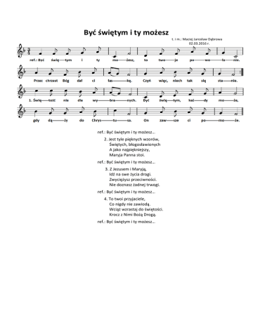 Być świętym i ty możesz t. i m.: Maciej Jarosław Dąbrowa 02.03.2016 r. ref.: Byd świętym i ty możesz… 2. Jest tyle pięknych wzorów, Świętych, błogosławionych A jako najpiękniejszy, Maryja Panna stoi. ref.: Byd świętym i ty możesz… 3. Z Jezusem i Maryją, Idź na swe życia drogi. Zwyciężysz przeciwności. Nie doznasz żadnej trwogi. ref.: Byd świętym i ty możesz… 4. To twoi przyjaciele, Co nigdy nie zawiodą. Wciąż wzrastaj do świętości. Krocz z Nimi Bożą Drogą. ref.: Byd świętym i ty możesz…