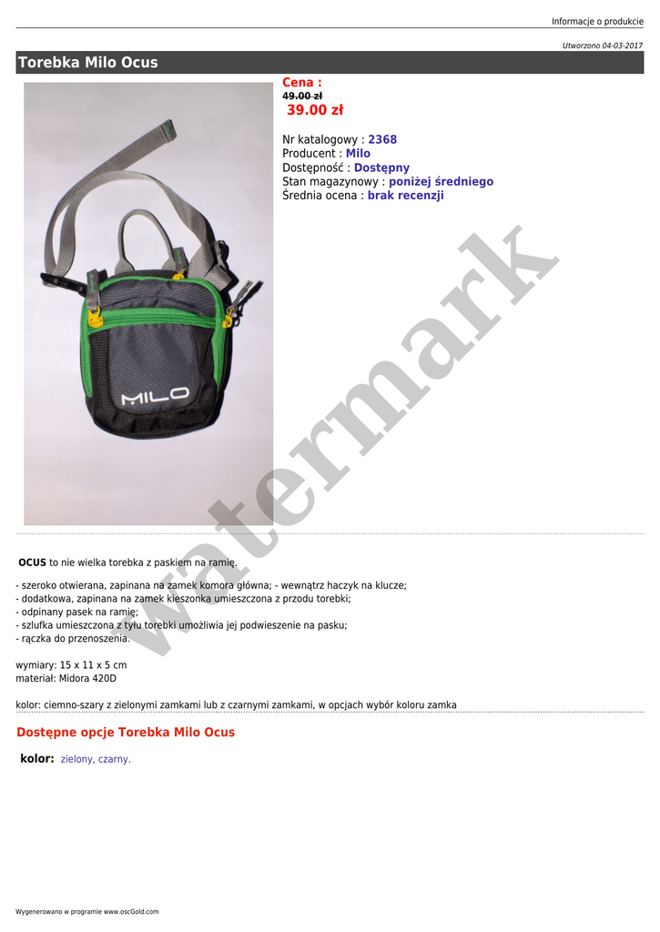 Informacje o produkcie Utworzono 04-03-2017 Torebka Milo Ocus Cena : 49.00 zł 39.00 zł at er m ar k Nr katalogowy : 2368 Producent : Milo Dostępność : Dostępny Stan magazynowy : poniżej średniego Średnia ocena : brak recenzji OCUS to nie wielka torebka z paskiem na ramię. w - szeroko otwierana, zapinana na zamek komora główna; - wewnątrz haczyk na klucze; - dodatkowa, zapinana na zamek kieszonka umieszczona z przodu torebki; - odpinany pasek na ramię; - szlufka umieszczona z tyłu torebki umożliwia jej podwieszenie na pasku; - rączka do przenoszenia. wymiary: 15 x 11 x 5 cm materiał: Midora 420D kolor: ciemno-szary z zielonymi zamkami lub z czarnymi zamkami, w opcjach wybór koloru zamka Dostępne opcje Torebka Milo Ocus kolor: zielony, czarny. Wygenerowano w programie www.oscGold.com