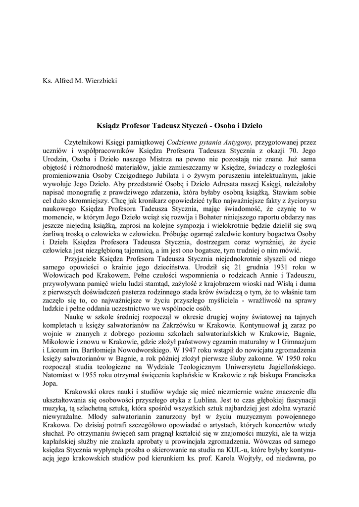 Ks. Alfred M. Wierzbicki Ksiądz Profesor Tadeusz Styczeń - Osoba i Dzieło Czytelnikowi Księgi pamiątkowej Codzienne pytania Antygony, przygotowanej przez uczniów i współpracowników Księdza Profesora Tadeusza Stycznia z okazji 70. Jego Urodzin, Osoba i Dzieło naszego Mistrza na pewno nie pozostają nie znane. Już sama objętość i różnorodność materiałów, jakie zamieszczamy w Księdze, świadczy o rozległości promieniowania Osoby Czcigodnego Jubilata i o żywym poruszeniu intelektualnym, jakie wywołuje Jego Dzieło. Aby przedstawić Osobę i Dzieło Adresata naszej Księgi, należałoby napisać monografię z prawdziwego zdarzenia, która byłaby osobną książką. Stawiam sobie cel dużo skromniejszy. Chcę jak kronikarz opowiedzieć tylko najważniejsze fakty z życiorysu naukowego Księdza Profesora Tadeusza Stycznia, mając świadomość, że czynię to w momencie, w którym Jego Dzieło wciąż się rozwija i Bohater niniejszego raportu obdarzy nas jeszcze niejedną książką, zaprosi na kolejne sympozja i wielokrotnie będzie dzielił się swą żarliwą troską o człowieka w człowieku. Próbując ogarnąć zaledwie kontury bogactwa Osoby i Dzieła Księdza Profesora Tadeusza Stycznia, dostrzegam coraz wyraźniej, że życie człowieka jest niezgłębioną tajemnicą, a im jest ono bogatsze, tym trudniej o nim mówić. Przyjaciele Księdza Profesora Tadeusza Stycznia niejednokrotnie słyszeli od niego samego opowieści o krainie jego dzieciństwa. Urodził się 21 grudnia 1931 roku w Wołowicach pod Krakowem. Pełne czułości wspomnienia o rodzicach Annie i Tadeuszu, przywoływana pamięć wielu ludzi stamtąd, zażyłość z krajobrazem wioski nad Wisłą i duma z pierwszych doświadczeń pasterza rodzinnego stada krów świadczą o tym, że to właśnie tam zaczęło się to, co najważniejsze w życiu przyszłego myśliciela - wrażliwość na sprawy ludzkie i pełne oddania uczestnictwo we wspólnocie osób. Naukę w szkole średniej rozpoczął w okresie drugiej wojny światowej na tajnych kompletach u księży salwatorianów na Zakrzówku w Krakowie. Kontynuował ją zaraz po wojnie w znanych z dobrego poziomu szkołach salwatoriańskich w Krakowie, Bagnie, Mikołowie i znowu w Krakowie, gdzie złożył państwowy egzamin maturalny w I Gimnazjum i Liceum im. Bartłomieja Nowodworskiego. W 1947 roku wstąpił do nowicjatu zgromadzenia księży salwatorianów w Bagnie, a rok później złożył pierwsze śluby zakonne. W 1950 roku rozpoczął studia teologiczne na Wydziale Teologicznym Uniwersytetu Jagiellońskiego. Natomiast w 1955 roku otrzymał święcenia kapłańskie w Krakowie z rąk biskupa Franciszka Jopa. Krakowski okres nauki i studiów wydaje się mieć niezmiernie ważne znaczenie dla ukształtowania się osobowości przyszłego etyka z Lublina. Jest to czas głębokiej fascynacji muzyką, tą szlachetną sztuką, która spośród wszystkich sztuk najbardziej jest zdolna wyrazić niewyrażalne. Młody salwatorianin zanurzony był w życiu muzycznym powojennego Krakowa. Do dzisiaj potrafi szczegółowo opowiadać o artystach, których koncertów wtedy słuchał. Po otrzymaniu święceń sam pragnął kształcić się w znajomości muzyki, ale ta wizja kapłańskiej służby nie znalazła aprobaty u prowincjała zgromadzenia. Wówczas od samego księdza Stycznia wypłynęła prośba o skierowanie na studia na KUL-u, które byłyby kontynuacją jego krakowskich studiów pod kierunkiem ks. prof. Karola Wojtyły, od niedawna, po rozwiązaniu przez władze komunistyczne Wydziału Teologicznego UJ, prowadzącego wykłady w Lublinie. Jesienią 1955 roku rozpoczyna się lubelski okres w życiu księdza Stycznia, najpierw studenta, a później długoletniego pracownika naukowego Katolickiego Uniwersytetu Lubelskiego. Ksiądz Profesor zwykł z dumą mówić, że stał się lublinianinem, który nie utracił nigdy duszy krakowiaka. Taka przemiana i zachowanie swej tożsamości w Mieście Unii nie powinny nikogo dziwić. Nie tylko sam Lublin, ale i Lubelszczyzna stała się małą ojczyzną księdza Stycznia. Zżył się z ludźmi i z krajobrazem Nałęczowa, w którym mieszkał tylko kilka lat pomiędzy doktoratem a habilitacją, ale kiedy widzi się go wśród nałęczowian, których codziennymi sprawami nadal żyje, można mieć wrażenie, że ciągle tam mieszka i jest jednym z nich. W latach 1955-1963 ks. Styczeń był studentem i doktorantem na Wydziale Filozofii Chrześcijańskiej, gdzie specjalizował się w zakresie filozofii moralnej przy Katedrze Etyki kierowanej przez ks. prof. Karola Wojtyłę. W 1960 roku uzyskał tytuł magistra filozofii, przedstawiając pracę: Koncepcja cnoty u Nicolai Hartmana. Kolejnym krokiem na drodze naukowego rozwoju był doktorat w 1963 roku na podstawie rozprawy: Problem możliwości etyki u Johna Locke'a. W 1963 roku jako doktor ks. Tadeusz Styczeń został zatrudniony przy Katedrze Etyki na stanowisku adiunkta. W 1971 roku habilitował się w oparciu o monografię: Problem możliwości etyki jako empirycznie uprawomocnionej i ogólnie ważnej teorii moralności. W 1978 roku, po wyborze dotychczasowego kierownika Katedry Etyki KUL Kardynała Karola Wojtyły na Papieża Jana Pawła II, ks. doc. dr hab. Tadeusz Styczeń został powołany na kierownika Katedry i Zakładu Etyki. W 1981 roku objął stanowisko profesora nadzwyczajnego. W 1992 roku otrzymał tytuł profesora oraz został powołany na stanowisko profesora zwyczajnego. Od 1963 roku ks. Tadeusz Styczeń prowadzi wykłady i seminaria etyki w Katolickim Uniwersytecie Lubelskim. Jest promotorem ośmiu doktoratów. Prócz wykładów z etyki w tym Uniwersytecie trzeba również odnotować wieloletnie wykłady w Seminarium Księży Salwatorianów w Bagnie, które przyczyniły się do bardzo żywego zainteresowania etyką w jego zgromadzeniu zakonnym, o czym świadczy fakt, że wielu księży z tego zgromadzenia podejmowało potem specjalistyczne studia z ety