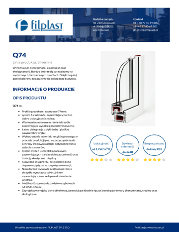 Siedziba zarządu 48-250 Głogówek ul. 3 Maja 33k woj. Opolskie Kontakt tel. +48 77 40 69 800 tel +48 77 40 69 801 [email protected] Q74 Linia produktu: Silverline Wyróżnia nas oszczędność, skromność oraz ekologiczność. Bardzo dobrze się sprawdzamy na wyciszonych, bezpiecznych osiedlach. Dzięki bogatej gamie kolorów, dopasujemy się do każdego budynku. INFORMACJE O PRODUKCIE OPIS PRODUKTU Q74 to: Profil o głębokości zabudowy 74mm; system 5-ciu komór, zapewniający bardzo dobrą izolacyjność cieplną; Wzmocnienia stalowe w ramie i skrzydle zapewniające wysokie parametry statyczne; Łatwa pielęgnacja dzięki dużej i gładkiej powierzchni wrębu; Wykorzystanie materiału recyklingowanego w procesie produkcji pvc, co przyczynia się do Izolacyjność DźwiękoBezpieczeństwo ochrony środowiska dzięki optymalizowaniu chłonność zużycia surowców; od 1,2W/m2*K do klasy RC2 System dwóch uszczelek oporowych, do 42dB zapewniających bardzo dobrą szczelność oraz izolację akustyczną i cieplną; Klasyczna linia profilu, dzięki której okna dopasowują się do każdego typu elewacji; Niska łączna wysokość zestawienia ramy i skrzydła wynosząca tylko 116 mm zapewniająca jeszcze lepsze doświetlenie wnętrza; Możliwość stosowania pakietów szybowych od 22 do 46mm; Zaprojektowane jako okno obiektowe, pozwalające idealnie łączyć ze sobą parametry ekonomiczne, cieplne oraz ekologiczne. Wszelkie prawa zastrzeżone. FILPLAST SP. Z O.O. Realizacja: www.feb.net.pl KOLORYSTYKA Oregon IV Złoty dąb 2178.001 Brąz 8875.05 Orzech 2178.007 Dąb bagienny 2052.089 Dąb bagienny Dąb rustykalny Kremowo-biały Ciemnoszary Machoń 2065.021 Czarno-brązowy 8518.05 Bordowy 3005.05 Czerwono-brązowy 3081.05 Ciemnozielony 6125.05 Zielony 6005.05 Granatowy 5150.05 Brylantowo-niebieski 5007.05 Kwarcowo-szary 7039.05 Ciemnoszary 7016.05 Bazaltowo-szary 7012.05 Srebrno-szary gładki 7155.05-083 Agatowo-szary 7038.05 Jasno szary 7251.05 Macore 3162.002 Jasny dąb 3118.076 Sosna górska 3069.041 Winczester 49240 Siena noce 49237 Acrylcolor DB703 Acrylcolor Białe aluminium Acrylcolor srebrny Acrylcolor Łupkowo szary Wszelkie prawa zastrzeżone. FILPLAST SP. Z O.O. Realizacja: www.feb.net.pl Acrylcolor Szary Acrylcolor Brąz sepia Acrylcolor Czarnobrązowy 9016 RAL PARAMETRY GŁĘBOKOŚĆ ZABUDOWY 74 mm IZOLACYJNOŚĆ TERMICZNA W zestawieniu z standardową szybą zespoloną 4/16/4 o współczynniku Ug 1,1 W/m²K parametr Uw wynosi 1,2 W/m2K, natomiast w połączeniu z zespoleniem 3-szybowym 4/14/4/14/4 Ug=0,6 W/m2K, parametr Uw wynosi nawet 0,89 W/m2K. LICZBA KOMÓR 5 USZCZELKI Nowoczesne uszczelki EPDM z pamięcią kształtu, dostępne w kolorach: czarnym, szarym lub opcjonalnie karmelowym. OKUCIE SZYBY Nowoczesne okucie Maco Multi wyposażone w czopy antywyważeniowe i.S (intelligente Sicherheit). Okna Q74 standardowo wyposażone w szybę 4/16/4 o współczynniku Ug 1,1 W/m²K wypełnioną argonem. Istnieje również możliwość wyboru zestawów 3-szybowych 4/12/4/12/4 lub 4/14/4/14/4 o parametrach odpowiednio Ug=0,7 lub Ug =0,6 Wm2/K ZDJĘCIA Wszelkie prawa zastrzeżone. FILPLAST SP. Z O.O. Realizacja: www.feb.net.pl Wszelkie prawa zastrzeżone. FILPLAST SP. Z O.O. Realizacja: www.feb.net.pl
