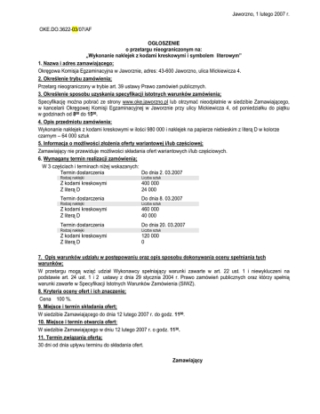 Jaworzno, 1 lutego 2007 r. OKE.DO.3622-03/07/AF OGŁOSZENIE o przetargu nieograniczonym na: „Wykonanie naklejek z kodami kreskowymi i symbolem literowym” 1. Nazwa i adres zamawiającego; Okręgowa Komisja Egzaminacyjna w Jaworznie, adres: 43-600 Jaworzno, ulica Mickiewicza 4. 2. Określenie trybu zamówienia; Przetarg nieograniczony w trybie art. 39 ustawy Prawo zamówień publicznych. 3. Określenie sposobu uzyskania specyfikacji istotnych warunków zamówienia; Specyfikację można pobrać ze strony www.oke.jaworzno.pl lub otrzymać nieodpłatnie w siedzibie Zamawiającego, w kancelarii Okręgowej Komisji Egzaminacyjnej w Jaworznie przy ulicy Mickiewicza 4, od poniedziałku do piątku w godzinach od 800 do 1500. 4. Opis przedmiotu zamówienia; Wykonanie naklejek z kodami kreskowymi w ilości 980 000 i naklejek na papierze niebieskim z literą D w kolorze czarnym – 64 000 sztuk 5. Informacja o możliwości złożenia oferty wariantowej i/lub częściowej; Zamawiający nie przewiduje możliwości składania ofert wariantowych i/lub częściowych. 6. Wymagany termin realizacji zamówienia; W 3 częściach i terminach niżej wskazanych: Termin dostarczenia Do dnia 2. 03.2007 Rodzaj naklejki Liczba sztuk Z kodami kreskowymi Z literą D 400 000 24 000 Termin dostarczenia Do dnia 8. 03.2007 Z kodami kreskowymi Z literą D 460 000 40 000 Termin dostarczenia Do dnia 20. 03.2007 Z kodami kreskowymi Z literą D 120 000 0 Rodzaj naklejki Rodzaj naklejki Liczba sztuk Liczba sztuk 7. Opis warunków udziału w postępowaniu oraz opis sposobu dokonywania oceny spełniania tych warunków; W przetargu mogą wziąć udział Wykonawcy spełniający warunki zawarte w art. 22 ust. 1 i niewykluczeni na podstawie art. 24 ust. 1 i 2 ustawy z dnia 29 stycznia 2004 r. Prawo zamówień publicznych oraz którzy spełnią warunki zawarte w Specyfikacji Istotnych Warunków Zamówienia (SIWZ). 8. Kryteria oceny ofert i ich znaczenie; Cena 100 %. 9. Miejsce i termin składania ofert; W siedzibie Zamawiającego do dnia 12 lutego 2007 r. do godz. 1100. 10. Miejsce i termin otwarcia ofert: W siedzibie Zamawiającego w dniu 12 lutego 2007 r. o godz. 1130. 11. Termin związania ofertą; 30 dni od dnia upływu terminu do składania ofert. Zamawiający