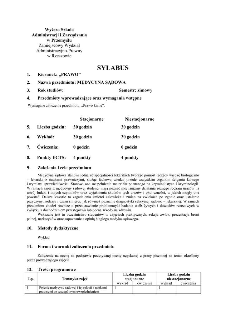 WyŜsza Szkoła Administracji i Zarządzania w Przemyślu Zamiejscowy Wydział Administracyjno-Prawny w Rzeszowie SYLABUS 1. Kierunek: „PRAWO” 2. Nazwa przedmiotu: MEDYCYNA SĄDOWA 3. Rok studiów: 4. Przedmioty wprowadzające oraz wymagania wstępne Semestr: zimowy Wymagane zaliczenie przedmiotu: „Prawo karne”. Stacjonarne Niestacjonarne 5. Liczba godzin: 30 godzin 30 godzin 6. Wykład: 30 godzin 30 godzin 7. Ćwiczenia: 0 godzin 0 godzin 8. Punkty ECTS: 4 punkty 4 punkty 9. ZałoŜenia i cele przedmiotu Medycyna sądowa stanowi jedną ze specjalności lekarskich tworząc pomost łączący wiedzę biologiczno – lekarską z naukami prawniczymi, słuŜąc fachową wiedzą przede wszystkim organom ścigania karnego i wymiaru sprawiedliwości. Stanowi ona uzupełnienie materiału poznanego na kryminalistyce i kryminologii. W ramach zajęć z medycyny sądowej studenci mają poznać mechanizmy działania róŜnego rodzaju urazów na ustrój ludzki i innych czynników oraz wyjaśnienia skutków tych urazów i okoliczności, w jakich mogły one powstać. Dalsze kwestie to zagadnienia śmierci człowieka i zmian na zwłokach po zgonie oraz ustalenie przyczyny, rodzaju i czasu śmierci, jak równieŜ poznanie diagnostyki sekcyjnej sądowo – lekarskiej. W ramach przedmiotu chodzi równieŜ o przedstawienie problematyki badania osób Ŝywych i dowodów rzeczowych w związku z dochodzeniem przestępstwa lub oceną szkody na zdrowiu. Wskazane jest tu uczestnictwo studentów w zajęciach praktycznych: sekcja zwłok, prezentacja broni palnej, narkotyków oraz zapoznanie z opinią biegłego medyka sądowego. 10. Metody dydaktyczne Wykład 11. Forma i warunki zaliczenia przedmiotu Zaliczenie na ocenę na podstawie pozytywnej oceny uzyskanej z pracy pisemnej na temat określony przez prowadzącego zajęcia. 12. Lp. I Treści programowe Liczba godzin stacjonarne wykład ćwiczenia Tematyka zajęć Pojęcie medycyny sądowej i jej relacji z naukami prawnymi ze szczególnym uwzględnieniem 1 Liczba godzin niestacjonarne wykład ćwiczenia 1 II III IV V VI VII VIII IX X XI 13. 1. 2. 3. postępowania procesowego karnego i cywilnego Nauka o obraŜeniach (traumatologia sądowolekarska); pojęcie urazu, obraŜenia, cechy obraŜeń, systematyka obraŜeń, diagnostyka obraŜeń, przydatność opisu obraŜeń dla wnioskowania procesowego Nauka o śmierci (tanatologia sądowo-lekarska): pojęcie śmierci, rodzaje śmierci, diagnostyka zgonu. Oględziny i sekcja zwłok. Oględziny zwłok na miejscu znalezienia ciała: aspekty kryminalistyczne i sądowo-lekarskie. Śmierć gwałtowna wskutek urazu Diagnostyka sekcyjna sądowo-lekarska. Opiniowanie o zgonach Uduszenie gwałtowne: systematyka, rodzaje, diagnostyka sekcyjna. Aspekty kryminalne, kryminalistyczne i sądowo-lekarskie uduszenia gwałtownego Inne rodzaje śmierci nagłej i gwałtownej (warunki atmosferyczne, działa nie prądu elektrycznego, czynników pokarmowych i głodu, wyczerpanie) Wypadki komunikacyjne. Diagnostyka obraŜeń ofiar wypadków komunikacyjnych, moŜliwości wnioskowania kryminalistycznego i sądowolekarskiego, rekonstrukcja wypadków z udziałem pieszych ofiar Orzecznictwo sądowo-lekarskie. RóŜnica pomiędzy orzecznictwem karnym a cywilnym i dla celów ubezpieczeniowych. Kwalifikacja lekarska obraŜeń. Pojęcie cięŜkiego uszczerbku na zdrowiu w kodeksie karnym i kodeksie cywilnym Toksykologia sądowo-lekarska i genetyka sądowolekarska. Podstawowe pojęcia. Wykorzystanie nauk przyrodniczych w procesie karnym i cywilnym Alkohol etylowy. Stan nietrzeźwości i stan po uŜyciu alkoholu – aspekty prawne i medyczne. Diagnostyka przyŜyciowa i sekcyjna stanu nietrzeźwości. Rachunek retrospektywny Kryminalistyka w praktyce. Prezentacja broni palnej i innych dowodów przestępstw, prezentacja metod pracy ekspertów z zakresu kryminalistyki - wykład gościnny prowadzony wspólnie z Naczelnikiem Laboratorium Kryminalistycznego Komendy Wojewódzkiej Policji w Rzeszowie 5 5 4 4 1 1 2 2 1 1 4 4 6 6 2 2 2 2 2 2 Literatura podstawowa T. Marcinkowski, Medycyna sądowa dla prawników, Warszawa 2005 Jakliński, Z. Marek, Medycyna sądowa dla prawników, Kraków 1999 V. I. DiMaio, D. DiMaio, Medycyna sądowa, Wrocław 2003 14. Literatura uzupełniająca 1. Z. L. Starowicz, Seksuologia sądowa, Warszawa 1988 15. Nazwisko osoby prowadzącej zajęcia na studiach stacjonarnych - wykład: prof. dr hab. A. Grzywa - ćwiczenia: 16. Nazwisko osoby prowadzącej zajęcia na studiach niestacjonarnych - wykład: prof. dr hab. A. Grzywa - ćwiczenia: