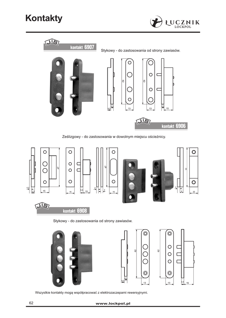 Kontakty kontakt 6907 Stykowy - do zastosowania od strony zawiasów. kontakt 6906 Zeœlizgowy - do zastosowania w dowolnym miejscu oœcie¿nicy. kontakt 6908 Stykowy - do zastosowania od strony zawiasów. Wszystkie kontakty mog¹ wspó³pracowaæ z elektrozaczepami rewersyjnymi. 62 www.lockpol.pl 55