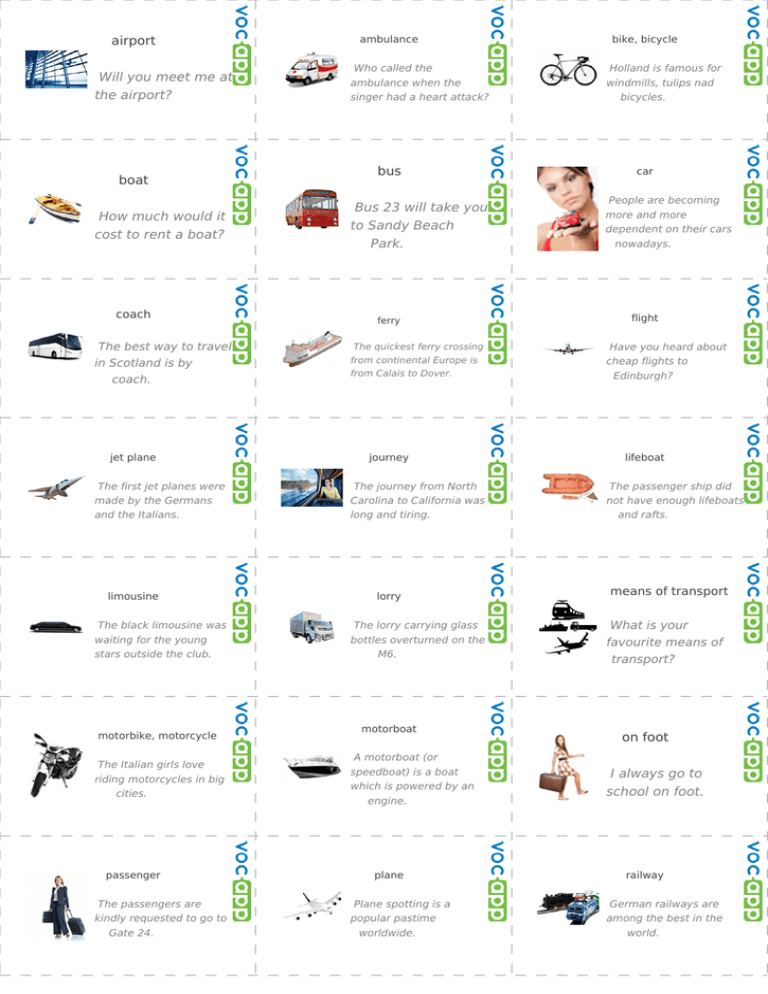 airport Will you meet me at the airport? boat How much would it cost to rent a boat? coach The best way to travel in Scotland is by coach. jet plane ambulance Who called the ambulance when the singer had a heart attack? bus Bus 23 will take you to Sandy Beach Park. ferry The quickest ferry crossing from continental Europe is from Calais to Dover. journey The first jet planes were made by the Germans The journey from North Carolina to California was and the Italians. long and tiring. limousine The black limousine was waiting for the young stars outside the club. motorbike, motorcycle The Italian girls love riding motorcycles in big cities. passenger The passengers are kindly requested to go to Gate 24. lorry The lorry carrying glass bottles overturned on the M6. motorboat A motorboat (or speedboat) is a boat which is powered by an engine. plane Plane spotting is a popular pastime worldwide. bike, bicycle Holland is famous for windmills, tulips nad bicycles. car People are becoming more and more dependent on their cars nowadays. flight Have you heard about cheap flights to Edinburgh? lifeboat The passenger ship did not have enough lifeboats and rafts. means of transport What is your favourite means of transport? on foot I always go to school on foot. railway German railways are among the best in the world. rower karetka lotnisko Holandia słynie z wiatraków, Kto zadzwonił po karetkę gdy Czy wyjedziesz po mnie na tulipanów i rowerów. piosenkarz miał atak serca? lotnisko? samochód autobus łódź Do Sandy Beach Park W dzisiejszych czasach ludzie coraz bardziej uzależniają się od samochodów. dojedziesz autobusem numer lot prom Czy słyszałeś o tanich lotach to Edynburga? łódź ratunkowa Statek pasażerski nie miał wystarczająco dużo łodzi ratunkowych i tratw. Ile kosztuje wynajęcie łodzi? 23. Najszybsze połączenie promem z kontynentalną Europą jest między Calais i Dover. podróż Podróż z Północnej Karoliny do Kaliforni była długa i męcząca. autokar W Szkocji najlepiej jest podróżować autokarem. odrzutowiec Pierwsze samoloty odrzutowe zbudowali niemcy i włosi. środki transportu ciężarówka Jaki jest twój ulubiony środek transportu? butelki przewróciła się na autostradzie M6. Czarna limuzyna czekała na młode gwiazdy przed klubem. motorówka motocykl Motorówka jest łodzią o napędzie mechanicznym. Włoszki uwielbiają jazdę motocyklem w dużych miastach. samolot pasażer Obserwowanie samolotów jest popularnym zajęciem czasu wolnego na świecie. Pasażerowie są proszeni o przejście do wyjścia numer 24. pieszo Zawsze idę do szkoły pieszo. kolej Niemieckie koleje uznawane są za jedne z najlepszych na świecie. Ciężarówka przewożąca szklane limuzyna railway station Let's meet at the railway station at 7.30. submarine "Yellow Submarine" is a 1966 song by The Beatles, written by Paul McCartney. to go by bus Are you going by bus or by tram? tram Trams are becoming more comfortable and faster these days. vehicle The road to Green Mountain is closed for the season to vehicles. ship The captain was the last person to abandon the ship. taxi Do you know where I can get a taxi? to ride a bike Once a week, the students are advised to ride a bike to college. underground spaceship Let's watch the models of future spaceships. to drive a car Could someone tell me how to drive a car with an automatic transmission? train I would like to enquire about trains to Bristol? van Baker Street tube station is at the junction of Baker Street and Marylebone Road. yacht Tom went to the harbour to see the yachts from the whole world. The white van has been sold for peanuts. tube The London tube was opened in 1890 and is the oldest in the world. statek kosmiczny statek stacja kolejowa Obejrzyjmy modele statków Kapitan był ostatnią osobą, Spotkajmy się na dworcu kosmicznych przyszłości. która opuściła statek. kolejowym o 7.30. prowadzić samochód taksówka łódź podwodna Czy ktoś mógłby mi powiedzieć jak prowadzić samochód z automatyczną skrzynią biegów? Czy wie pan gdzie mogę złapać taksówkę? "Żółta Łódź Podwodna" to tytuł piosenki Beatlesów z 1966 roku, napisanej przez Paula McCartney'a. pociąg jeździć na rowerze jechać autobusem Chciałbym dowiedzieć się o pociągi do Bristolu? furgonetka Biała furgonetka została Powered by TCPDF (www.tcpdf.org) Raz w tygodniu, studenci zachęcani są do podróżowania na uczelnię na rowerze. metro Stacja metra Baker Street umiejscowiona jest pod Czy jedziesz autobusem czy tramwajem? tramwaj Tramwaje są coraz sprzedana za grosze. skrzyżowaniem ulic Baker i Marylebone. wygodniejsze i szybsze. metro jacht pojazd Londyńskie metro z 1890 roku jest najstarszym na świecie. Tomek poszedł do portu by obejrzeć jachty z całego świata. Droga do Green Mountain w sezonie jest zamknięta dla pojazdów.