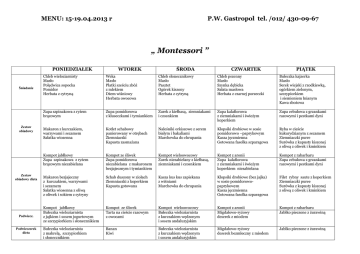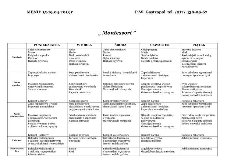 MENU: 15-19.04.2013 r P.W. Gastropol tel. /012/ 430-09-67 „ Montessori ” PONIEDZIAŁEK Śniadanie Zestaw obiadowy Zestaw obiadowy dieta Podwiecz. Podwieczorek dieta WTOREK ŚRODA CZWARTEK PIĄTEK Chleb wieloziarnisty Masło Polędwica sopocka Pomidor Herbata z cytryną Weka Masło Płatki sześciu zbóż z mlekiem Dżem wiśniowy Herbata owocowa Chleb słonecznikowy Masło Pasztet Ogórek kiszony Herbata z cytryną Chleb pszenny Masło Szynka dębicka Sałata masłowa Herbata z czarnej porzeczki Bułeczka kajzerka Masło Serek wiejski z rzodkiewką, ogórkiem zielonym, szczypiorkiem i siemieniem lnianym Kawa zbożowa Zupa szpinakowa z ryżem brązowym Zupa pomidorowa z kluseczkami i tymiankiem Zurek z kiełbasą, ziemniakami i czosnkiem Zupa kalafiorowa z ziemniakami i świeżym koperkiem Zupa cebulowa z grzankami razowymi i pestkami dyni Makaron z kurczakiem, warzywami i sezamem Sałatka wiosenna Kotlet schabowy panierowany w otrębach Ziemniaczki Kapusta zasmażana Naleśniki orkiszowe z serem białym i bakaliami Marchewka do chrupania Klopsiki drobiowe w sosie pomidorowo –paprykowym Kasza jęczmienna Gotowana fasolka szparagowa Ryba w cieście kukurydzianym z sezamem Ziemniaczki purre Surówka z kapusty kiszonej z oliwą z oliwek i kminkiem Kompot jabłkowy Zupa szpinakowa z ryżem brązowym niezabielana Kompot ze śliwek Zupa pomidorowa niezabielana z makaronem bezjajecznym i tymiankiem Kompot wieloowocowy Żurek niezabielany z kiełbasą, ziemniakami i czosnkiem Kompot z aronii Zupa kalafiorowa z ziemniakami i świeżym koperkiem niezabielana Kompot z rabarbaru Zupa cebulowa z grzankami razowymi i pestkami dyni Makaron bezjajeczny z kurczakiem, warzywami i sezamem Sałatka wiosenna z oliwą z oliwek i sokiem z cytryny Schab duszony w ziołach Ziemniaczki z koperkiem Kapusta gotowana Kasza kus kus zapiekana z wiśniami Marchewka do chrupania Klopsiki drobiowe (bez jajka) w sosie pomidorowopaprykowym Kasza jęczmienna Gotowana fasolka szparagowa Filet rybny saute z koperkiem Ziemniaczki puree Surówka z kapusty kiszonej z oliwą z oliwek i kminkiem Kompot jabłkowy Bułeczka wieloziarnista z jajkiem i sosem jogurtowym ze szczypiorkiem i słonecznikiem Kompot ze śliwek Tarta na cieście razowym z owocami Kompot wieloowocowy Bułeczka wieloziarnista z kurczakiem wędzonym i sosem andaluzyjskim Kompot z aronii Migdałowo-ryżowy deserek z miodem Kompot z rabarbaru Jabłko pieczone z żurawiną Bułeczka wieloziarnista z makrelą, szczypiorkiem i słonecznikiem Banan Kiwi Bułeczka wieloziarnista z kurczakiem wędzonym i sosem andaluzyjskim Migdałowo-ryżowy deserek bezmleczny z miodem Jabłko pieczone z żurawiną