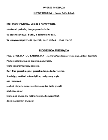 WIERSZ MIESIĄCA NOWY KOLEGA – Iwona Róża Salach Mój mały trzylatku, usiądź z nami w kole, siostra ci pokaże, twoje przedszkole. W szatni schowaj butki, a zabawki w sali. W umywalni powieść ręcznik, zuch jesteś – choć mały! PIOSENKA MIESIĄCA PAC, GRUSZKA DO FARTUSZKA – sł. Stanisław Karaszewski, muz. Antoni Szaliński Pod owocami zgina się gruszka, pac grusza, wiatr konarami gruszy porusza. Ref: Pac gruszka, pac gruszka, hop, do fartuszka. Spadają gruszki od soku miękkie, nad gruszą krążą osa i szerszeń. Ja choć nie jestem szerszeniem, osą, też lubię gruszki pachnące rosą! Stanę pod gruszą i w mój fartuszek, dla wszystkich dzieci nazbieram gruszek!