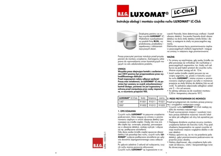 B.E.G. LUXOMAT ® LC-Click Instrukcja obsługi i montażu czujnika ruchu LUXOMAT® LC-Click Dziękujemy państwu za zakup czujnika LUXOMAT® LC. Wybraliście wysokojakościowy produkt firmy B.E.G., wyprodukowany, przebadany i zapakowany z dołożeniem najwyższych starań. czewki Fresnela, które determinują wielkość i kształt obszaru detekcji. Soczewka Fresnela dzieli obszar detekcji na dwie strefy detekcji (strefa bliska i daleka), a następnie te strefy na poszczególne segmenty. Elektronika sensora łączy promieniowanie cieplne w poszczególnych strefach/segmentach i reaguje na zmiany w natężeniu tego promieniowania. Proszę przeczytać poniższe instrukcje przed przystąpieniem do montażu urządzenia. Zastrzegamy sobie prawo do wprowadzania zmian konstrukcyjnych mających na celu udoskonalenie produktu. WAŻNE: • T e zmiany są najsilniejsze, gdy osoby (źródła ciepła) poruszają się wchodząc lub wychodząc z poszczególnych segmentów, tzn. kiedy ruch odbywa się pod kątem prostym do czujnika ruchu. Można uzyskać zasięg od ok. 12 m. • Jeżeli osoba (źródło ciepła) porusza się wewnątrz segmentu, np. prosto w kierunku czujnika ruchu LUXOMAT®, istotna zmiana w promieniowaniu cieplnym pojawi się tylko w momencie przejścia ze strefy bliskiej do dalekiej (lub na odwrót). To jednakże odpowiada odległości zaledwie 2 – 4 m od sensora. • T e zakresy odnoszą się do wysokości montażu 2,50 m i temperatury otoczenia 18°C. UWAGA Wszystkie prace obejmujące kontakt z zasilaniem z sieci 230 V powinny być przeprowadzone przez wykwalifikowanego elektryka! Przed rozpoczęciem należy odłączyć zasilanie! Proszę mieć świadomość, że LUXOMAT® LC nie powinien być uważany za czujnik antywłamaniowy/ kontroli dostępu, ponieważ nie jest wyposażony w ochronę przed manipulacją przez osoby niepowołane, w rozumieniu przepisów VDS. biały brązowy czarny 2. PRZED PRZYSTĄPIENIEM DO MONTAŻU 140° 91001 91011 91021 200° 91002 91012 91022 Przed przystąpieniem do montażu proszę przeczytać i uwzględnić następujące uwagi: •C zujniki ruchu LUXOMAT® LC-Click nadają się tylko do montażu naściennego. •P rzed wyznaczeniem miejsca i wysokości montażu proszę dokładnie rozeznać warunki lokalne takie jak odległość od ulicy lub sąsiedniej posesji. •N ajlepsze działanie uzyskuje się przy montażu urządzenia bokiem do kierunku ruchu. Przy podchodzeniu bezpośrednio na wprost czujnika istnieje możliwość wejścia względnie daleko w obszar detekcji. •N ależy upewnić się, że nic nie przesłania pola detekcji, gdyż promieniowanie podczerwone nie przenika przez obiekty. •N ależy dopilnować, aby urządzenie było osłonięte od deszczu, wiatru i bezpośredniego światła słonecznego. LUXOMAT® LC-Click B.E.G. 4 6396 – 050210–1 1. OPIS DZIAŁANIA Czujniki ruchu LUXOMAT® to pasywne urządzenia podczerwieni, które reagują na zmiany w promieniowaniu cieplnym w swoim obszarze detekcji (poruszające się źródła ciepła). Osoby lub inne źródła ciepła (np. zwierzęta, pojazdy), poruszające się w obszarze detekcji, zostają wykryte i włącza się np. podłączone oświetlenie. Gdy dana osoba (źródło ciepła) opuszcza obszar detekcji lub pozostaje bez ruchu, czujnik ruchu LUXOMAT® wyłącza podłączone oświetlenie po upływie dowolnie zaprogramowanego czasu załączenia. Po upływie zaledwie 3 sekund od wyłączenia, czujnik ruchu można ponownie aktywować. Czujniki ruchu LUXOMAT® są wyposażone w so1 3. MONTAŻ Rys.1 Najpierw proszę rozdzielić dwie części obudowy i podłączyć przewody zgodnie z opisem zacisków. 6. SPECYFIKACJA TECHNICZNA Rys. 4 40 130 1000 50 10 1.2 20 4 sec 2 Lux 6 10 min 2. Przełącznik fotoelektryczny (od 2 do 1000 luksów) Obracając tarczą przeciwnie do ruchu zegara można ustawić tryb dzienno-nocny (1000 luksów) Obracając tarczą przeciwnie zgodnie z ruchem zegara można ustawić tryb nocny (2 luksy) 4. PRZYKŁADY ZASTOSOWAŃ Stała aktywność termiczna w obszarze detekcji -U sunąć źródło ciepła z obszaru detekcji. Sprawdzić prawidłowe funkcjonowanie czujnika zakrywając całkowicie soczewkę (światło powinno się wyłączyć po upływie pewnego czasu). Czujnik ruchu jest połączony równolegle z łącznikiem umożliwiającym ręczne załączanie - Zwrócić uwagę na prawidłowe podłączenie łącznika. 12 57 L' 27 Praca równoległa 2 czujników LC N 67 23 7 53 7 4. Źródło światła pozostaje włączone przez długie okresy, gdy nikogo nie ma w pobliżu UWAGA: Wszystkie prace obejmujące kontakt z zasilaniem z sieci 230 V powinny być przeprowadzone przez wykwalifikowanego elektryka! L N L' Dodatkowy włącznik ręczny Współpraca z łącznikiem schodowym 5. OBSZAR DETEKCJI Obszar detekcji LC-140 Wysokość montażu 2,5 m Widok z góry maks. 4m WAŻNE: Zawsze należy instalować LUXOMAT® LC-Click w taki sposób aby elementy regulacji były skierowane w dół. maks. 5 m Widok z bokugóry 2.5 m maks. 12 m maks. 5 m 200° przechodzenie w poprzek podchodzenie na wprost 2 5. O graniczenie zasięgu (poniżej minimum podanego w specyfikacji) Wysokość montażu nie jest optymalna - Zmienić odpowiednio wysokość montażu (2,50 m). Ludzie poruszają się bezpośrednio w kierunku czujnika - Zamontować czujnik w taki sposób, aby podchodzenie z boku było również wykrywane. Strome powierzchnie - Odpowiednio wyregulować głowicę sferyczną. 1. Lampa się nie zaświeca Wysokość montażu 2,5 m Widok z góry 1. Ustawienia czasu (od 4 sek. do 10 min.) Obracając tarczą regulującą zgodnie z ruchem zegara można zwiększyć nastawiany czas. Obracając tarczą przeciwnie do ruchu zegara można zmniejszyć nastawiany czas. KOMPATYBILNOŚĆ ELEKTROMAGNETYCZNA (EMV) W przypadku umieszczenia czujnika w bezpośrednim sąsiedztwie urządzeń transmitujących fale radiowe o dużej mocy (np. przenośne telefony, H.A.M., radiostacje używane w taksówkach, policji, straży 