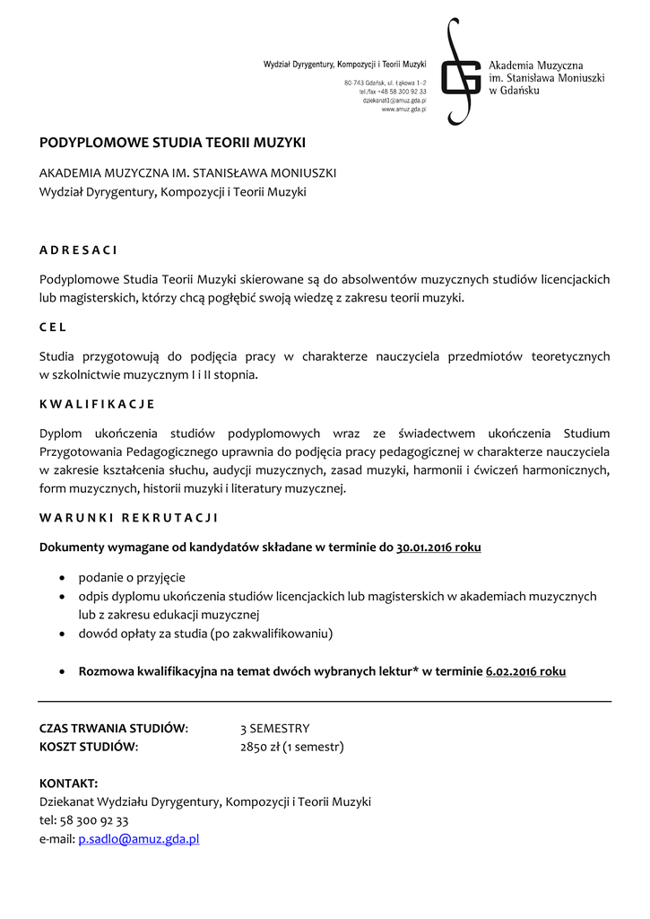 PODYPLOMOWE STUDIA TEORII MUZYKI AKADEMIA MUZYCZNA IM. STANISŁAWA MONIUSZKI Wydział Dyrygentury, Kompozycji i Teorii Muzyki ADRESACI Podyplomowe Studia Teorii Muzyki skierowane są do absolwentów muzycznych studiów licencjackich lub magisterskich, którzy chcą pogłębić swoją wiedzę z zakresu teorii muzyki. CEL Studia przygotowują do podjęcia pracy w charakterze nauczyciela przedmiotów teoretycznych w szkolnictwie muzycznym I i II stopnia. KWALIFIKACJE Dyplom ukończenia studiów podyplomowych wraz ze świadectwem ukończenia Studium Przygotowania Pedagogicznego uprawnia do podjęcia pracy pedagogicznej w charakterze nauczyciela w zakresie kształcenia słuchu, audycji muzycznych, zasad muzyki, harmonii i ćwiczeń harmonicznych, form muzycznych, historii muzyki i literatury muzycznej. WARUNKI REKRUTACJI Dokumenty wymagane od kandydatów składane w terminie do 30.01.2016 roku podanie o przyjęcie odpis dyplomu ukończenia studiów licencjackich lub magisterskich w akademiach muzycznych lub z zakresu edukacji muzycznej dowód opłaty za studia (po zakwalifikowaniu) Rozmowa kwalifikacyjna na temat dwóch wybranych lektur* w terminie 6.02.2016 roku CZAS TRWANIA STUDIÓW: KOSZT STUDIÓW: 3 SEMESTRY 2850 zł (1 semestr) KONTAKT: Dziekanat Wydziału Dyrygentury, Kompozycji i Teorii Muzyki tel: 58 300 92 33 e-mail: [email protected] Termin składania dokumentów: 15 lutego 2016 r. Dopuszczalna minimalna liczba uczestników: 5 osób * Lista lektur: 1. Dahlhaus Carl, Eggebrecht Hans H., Co to jest muzyka?, Warszawa 1992. 2. Fubini Enrico, Historia estetyki muzycznej, Kraków 2002. 3. Gołąb Maciej, Spór o granice poznania dzieła muzycznego, Wrocław 2003. 4. Jabłoński Maciej, Muzyka jako znak. Wokół semiotyki muzyki Eero Tarastiego, Poznań 1999. 5. Jarzębska Alicja, Z dziejów myśli o muzyce. Wybrane zagadnienia teorii i analizy muzyki tonalnej i posttonalnej, Kraków 2002. 6. Kompozytorzy polscy 1918-2000, praca zbiorowa pod red. Marka Podhajskiego, tom 1, Eseje, Gdańsk 2005. 7. Kostka Violetta, Tadeusz Zygfryd Kassern. Indywidualne odmiany stylów muzycznych XX wieku, Poznań 2011. 8. Kozłowska-Lewna Alicja, Innowacyjna strategia kształcenia słuchu muzycznego u dzieci w wieku wczesnoszkolnym, Gdańsk 2006. 9. Meyer Leonard B., Emocja i znaczenie w muzyce, Kraków 1974. 10. Piotrowska Maria, Neoklasycyzm w muzyce XX wieku, Warszawa 1982. 11. Podhajski Marek, „Nowy system muzyki” X. Jana Jarmusiewicza w perspektywie polskich prac z harmonii XIX wieku, Gdańsk 1992. 12. Popinigis Danuta, Muzyka Andrzeja Hakenbergera, Gdańsk 1997. 13. Skowron Zbigniew, Teoria i estetyka awangardy muzycznej drugiej połowy XX wieku, Warszawa 1989. 14. Skupin Renata, Poetyka muzyki orkiestrowej Giacinto Scelsiego. Dzieło a duchowość kompozytora – między Wschodem a Zachodem, Kraków 2008. 15. Szlagowska Danuta, Repertuar muzyczny z XVII-wiecznych rękopisów gdańskich, Gdańsk 2005. 16. Tomaszewski Mieczysław, Interpretacja integralna dzieła muzycznego. Rekonesans, Kraków 2000. 17. Tomaszewski Mieczysław, O muzyce polskiej w perspektywie intertekstualnej. Studia i szkice, Kraków 2005.