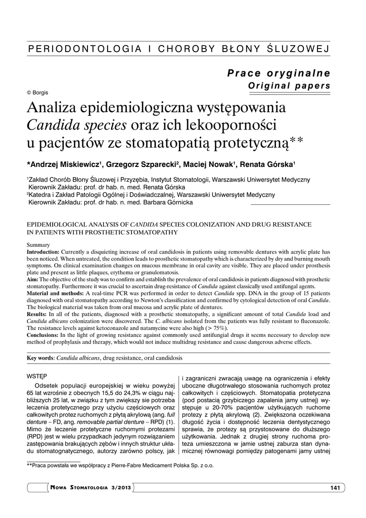 PERIODONTOLOGIA I CHOROBY BŁONY ŚLUZOWEJ Prace oryginalne Original papers © Borgis Analiza epidemiologiczna występowania Candida species oraz ich lekooporności u pacjentów ze stomatopatią protetyczną** *Andrzej Miskiewicz1, Grzegorz Szparecki2, Maciej Nowak1, Renata Górska1 Zakład Chorób Błony Śluzowej i Przyzębia, Instytut Stomatologii, Warszawski Uniwersytet Medyczny Kierownik Zakładu: prof. dr hab. n. med. Renata Górska 2 Katedra i Zakład Patologii Ogólnej i Doświadczalnej, Warszawski Uniwersytet Medyczny Kierownik Zakładu: prof. dr hab. n. med. Barbara Górnicka 1 Epidemiological analysis of Candida species colonization and drug resistance in patients with prosthetic stomatopathy Summary Introduction: Currently a disquieting increase of oral candidosis in patients using removable dentures with acrylic plate has been noticed. When untreated, the condition leads to prosthetic stomatopathy which is characterized by dry and burning mouth symptoms. On clinical examination changes on mucous membrane in oral cavity are visible. They are placed under prosthesis plate and present as little plaques, erythema or granulomatosis. Aim: The objective of the study was to confirm and establish the prevalence of oral candidosis in patients diagnosed with prosthetic stomatopathy. Furthermore it was crucial to ascertain drug-resistance of Candida against classically used antifungal agents. Material and methods: A real-time PCR was performed in order to detect Candida spp. DNA in the group of 15 patients diagnosed with oral stomatopathy according to Newton’s classification and confirmed by cytological detection of oral Candida. The biological material was taken from oral mucosa and acrylic plate of dentures. Results: In all of the patients, diagnosed with a prosthetic stomatopathy, a significant amount of total Candida load and Candida albicans colonization were discovered. The C. albicans isolated from the patients was fully resistant to fluconazole. The resistance levels against ketoconazole and natamycine were also high (> 75%). Conclusions: In the light of growing resistance against commonly used antifungial drugs it seems necessary to develop new method of prophylaxis and therapy, which would not induce multidrug resistance and cause dangerous adverse effects. Key words: Candida albicans, drug resistance, oral candidosis Wstęp Odsetek populacji europejskiej w wieku powyżej 65 lat wzrośnie z obecnych 15,5 do 24,3% w ciągu najbliższych 25 lat, w związku z tym zwiększy sie potrzeba leczenia protetycznego przy użyciu częściowych oraz całkowitych protez ruchomych z płytą akrylową (ang. full denture – FD, ang. removable partial denture – RPD) (1). Mimo że leczenie protetyczne ruchomymi protezami (RPD) jest w wielu przypadkach jedynym rozwiązaniem zastępowania brakujących zębów i innych struktur układu stomatognatycznego, autorzy zarówno polscy, jak i zagraniczni zwracają uwagę na ograniczenia i efekty uboczne długotrwałego stosowania ruchomych protez całkowitych i częściowych. Stomatopatia protetyczna (pod postacią grzybiczego zapalenia jamy ustnej) występuje u 20-70% pacjentów użytkujących ruchome protezy z płytą akrylową (2). Zwiększona oczekiwana długość życia i dostępność leczenia dentystycznego sprawia, że protezy są przystosowane do dłuższego użytkowania. Jednak z drugiej strony ruchoma proteza umieszczona w jamie ustnej zaburza stan dynamicznej równowagi pomiędzy patogenami jamy ustnej **Praca powstała we współpracy z Pierre-Fabre Medicament Polska Sp. z o.o. N OWA S TOMATOLOGIA 3/2013 141 Andrzej Miskiewicz i wsp. a układem odpornościowym gospodarza. Promuje to transformację Candida albicans z saprofitycznej formy blastosporowej do formy inwazyjnej pseudostrzępkowej (3, 4). Aktualne badania wskazują, że płyta akrylowa obecna w protezach jest decydującym czynnikiem predysponującym do zwiększonej kolonizacji i rozwinięcia stomatopatii protetycznej (4, 5). Techniki izolacji eksfoliatywnej w połączeniu z mykogramem stanowią wiarygodne narzędzie dla klinicysty w diagnozowaniu oraz leczeniu pacjentów, u których podejrzewamy zakażenie Candida albicans w przebiegu stomatopatii (4, 6). Jednakże ciągle narastająca oporność Candida spp. przeciwko powszechnie używanym antybiotykom przeciw grzybom, takim jak: nystatyna, flukonazol, mikonazol, itrakonazol i ketokonazol stanowi poważny problem w leczeniu miejscowym, jak i ogólnym pacjentów ze zdiagnozowaną grzybicą (7-10) (ryc. 1). Biorąc zatem pod uwagę zwiększone ryzyko wytworzenia ultraopornych szczepów Candida, które nie odpowiadają na leczenie, celem badaczy powinno być opracowanie nowej metody diagnostyki i leczenia stomatopatii bez użycia azoli i alkiloamin, aby zachować je dla terapii stanów zagrażających życiu, takim jak grzybice układowe (11, 12). Materiał i metody Do badania zostało włączonych 15 pacjentów Zakładu Chorób Błony Śluzowej i Przyzębia IS WUM ze zdiagnozowaną stomatopatią protetyczną w oparciu o klasyfikację wg Newtona potwierdzoną klasycznym badaniem mykologicznym wraz z mykogramem (oporność na wybrane leki przeciwgrzybicze). Pacjenci użytkowali ruchome uzupełnienia protetyczne w postaci górnych protez całkowitych oraz częściowych protez ruchomych z rozległą akrylową płytą podniebienną (proteza uzupełnia więcej niż brak 5 zębów w szczęce) (FD, RPD). W pierwszym etapie został zebrany wywiad stomatologiczny oraz ogólnomedyczny, ze szczególnym uwzględnieniem: czasu użytkowania dotychczasowej protezy, występowania suchości i pieczenia jamy ustnej z oznaczeniem w 10-stopniowej skali VAS subiektywnego stopnia dyskomfortu, chorób ogólnoustrojowych, w tym cukrzycy typu I i II oraz astmy oskrzelowej (13, 14). Ponadto każdy z badanych wypełniał formularz dotyczący stanu zdrowia oraz przyjmowanych leków. Wyselekcjonowana w ten sposób grupa badawcza została włączona do badania