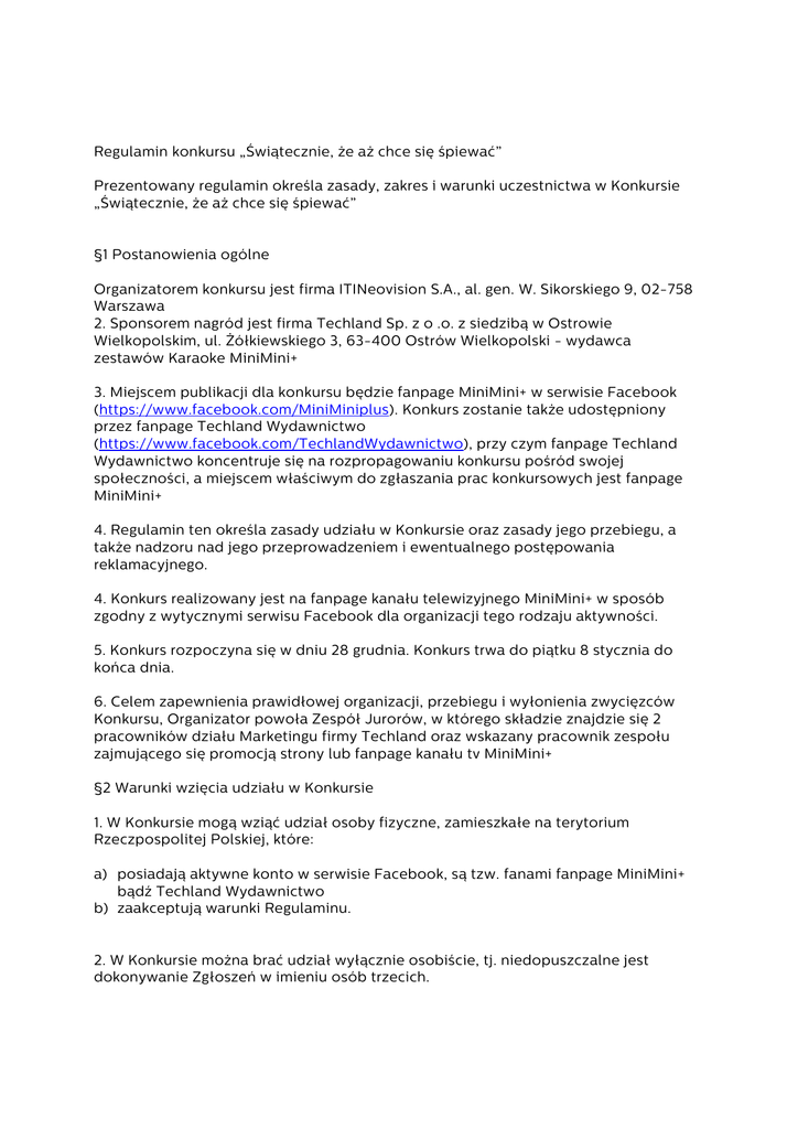 Regulamin konkursu „Świątecznie, że aż chce się śpiewać” Prezentowany regulamin określa zasady, zakres i warunki uczestnictwa w Konkursie „Świątecznie, że aż chce się śpiewać” §1 Postanowienia ogólne Organizatorem konkursu jest firma ITINeovision S.A., al. gen. W. Sikorskiego 9, 02-758 Warszawa 2. Sponsorem nagród jest firma Techland Sp. z o .o. z siedzibą w Ostrowie Wielkopolskim, ul. Żółkiewskiego 3, 63-400 Ostrów Wielkopolski - wydawca zestawów Karaoke MiniMini+ 3. Miejscem publikacji dla konkursu będzie fanpage MiniMini+ w serwisie Facebook (https://www.facebook.com/MiniMiniplus). Konkurs zostanie także udostępniony przez fanpage Techland Wydawnictwo (https://www.facebook.com/TechlandWydawnictwo), przy czym fanpage Techland Wydawnictwo koncentruje się na rozpropagowaniu konkursu pośród swojej społeczności, a miejscem właściwym do zgłaszania prac konkursowych jest fanpage MiniMini+ 4. Regulamin ten określa zasady udziału w Konkursie oraz zasady jego przebiegu, a także nadzoru nad jego przeprowadzeniem i ewentualnego postępowania reklamacyjnego. 4. Konkurs realizowany jest na fanpage kanału telewizyjnego MiniMini+ w sposób zgodny z wytycznymi serwisu Facebook dla organizacji tego rodzaju aktywności. 5. Konkurs rozpoczyna się w dniu 28 grudnia. Konkurs trwa do piątku 8 stycznia do końca dnia. 6. Celem zapewnienia prawidłowej organizacji, przebiegu i wyłonienia zwycięzców Konkursu, Organizator powoła Zespół Jurorów, w którego składzie znajdzie się 2 pracowników działu Marketingu firmy Techland oraz wskazany pracownik zespołu zajmującego się promocją strony lub fanpage kanału tv MiniMini+ §2 Warunki wzięcia udziału w Konkursie 1. W Konkursie mogą wziąć udział osoby fizyczne, zamieszkałe na terytorium Rzeczpospolitej Polskiej, które: a) posiadają aktywne konto w serwisie Facebook, są tzw. fanami fanpage MiniMini+ bądź Techland Wydawnictwo b) zaakceptują warunki Regulaminu. 2. W Konkursie można brać udział wyłącznie osobiście, tj. niedopuszczalne jest dokonywanie Zgłoszeń w imieniu osób trzecich. §3 Zasady i przebieg Konkursu 1. Uczestnictwo w konkursie polega na wykonaniu pracy fotograficznej, której motywem jest wyjątkowa atmosfera świąt Bożego Narodzenia. Tematyka powinna stać w zgodzie ze sformułowaniem tytułu konkursu „Świątecznie, że aż chce się śpiewać” oraz opublikowanie wzmiankowanej fotografii w polu komentarzy pod wpisem obwieszczającym konkurs 2. Organizatorzy dopuszczają do uczestnictwa w konkursie tylko prace fotograficzne. Zaawansowana obróbka graficzna fotografii jest zabroniona. Organizatorzy dopuszczają jedynie korekty w obszarze naświetlenia, korekcji barw i ekspozycji. 3. Kompozycja fotografii, zastosowane techniki, a przez to uzyskany efekt pozostają w wyłącznym uznaniu autora pracy. Podstawą oceny pracy jest jej subiektywny osąd przez Zespół Jurorów. 4. Opublikowanie fotografii we wskazany powyżej sposób jest równoznaczne z tzw. „Zgłoszeniem”. Zgłoszenia dostarczone po Czasie Trwania Konkursu lub naruszające warunki Regulaminu nie będą brały udziału w Konkursie. 5. Nagrodami w konkursie są nagrody ufundowane prze Techland Wydawnictwo: 6 zestawów karaoke MiniMini+ vol. 2 4. Organizator oświadcza, że wartość każdej z nagród przewidzianych w ramach niniejszego konkursu nie przekracza kwoty 760 PLN netto, o której mowa w art. 21 ust. 1 pkt. 68 ustawy z dnia 26 lipca 1991 r. o podatku dochodowym od osób fizycznych (Dz. U. z 1993r. Nr 90, poz. 416 z późn. zm.), a więc nagrody te wolne są od podatku dochodowego. 5. W przypadku, gdy zdobywcą Nagrody będzie jakakolwiek osoba, która nie spełnia warunków wskazanych w niniejszym Regulaminie, osoba taka traci prawa do nagrody, a w wypadku ujawnienia tego faktu po jej doręczeniu osoba ta będzie zobowiązana do jej zwrotu. Organizator uprawniony będzie do przyznania takiej nagrody Uczestnikowi, który zajmował kolejne miejsce w Konkursie. 6. Organizator wyłącza możliwość wypłaty ekwiwalentu pieniężnego za którąkolwiek z nagród ani zamiany jej na inną nagrodę. 7. W Konkursie można otrzymać nagrody wyłącznie raz. 8. W ciągu 5 dni roboczych od zakończenia Konkursu zostanie zwołane zebranie Zespołu Jurorów w celu wyłonienia zwycięzców Konkursu. 9. Informacja o wygranych nagrodach zostanie umieszczona na fanpage Techland Wydawnictwo oraz fanpage MiniMini+ 10. Laureaci wskazani przez Zespół Jurorów zobowiązani są do przekazania adresów doręczenia nagród konkursowych oraz telefonów pod adres mailowy [email protected]. Organizatorzy oczekują na takie zgłoszenia przez 7 dni roboczych. Po tym terminie następuje wysyłka nagród do laureatów, którzy wykonali zgłoszenie. 11. Z tytułu uczestnictwa w Konkursie nie przysługuje zwrot kosztów ani innych poniesionych przez Uczestników konkursu wydatków. Nie ma też nagród przewidzianych za samo uczestnictwo w Konkursie. 12. Przystąpienie do Konkursu jest równoznaczne z akceptacją Regulaminu Konkursu w całości oraz zobowiązanie Uczestnika do przestrzegania określonych w nim zasad. Przystępując do konkursu Uczestnik potwierdza również, że spełnia wszystkie warunki, które uprawniają go do udziału w Konkursie. §4 Prawa autorskie 1. Przesłanie odpowiedzi w konkursie przez jego uczestników jest równoznaczne z oświadczeniem, iż są oni autorami swoich prac i w żaden sposób przy ich tworzeniu nie naruszyli praw autorskich, ani innych praw osób trzecich, w tym prawa do wizerunku. 2. Wszelkie autorskie prawa majątkowe do zwycięskich Zgłoszeń, z dniem wydania nagrody zostają przeniesione na organizatora konkursu przez uczestnika, bez odrębnego wynagrodzenia, w zakresie nieograniczonego w czasie wykorzystywania na wszelkich znanych polach eksploatacji, w szczególności w zakresie utrwalania i zwielokrotniania utworu – wytwarzania określoną techniką egzemplarzy utworu, w 