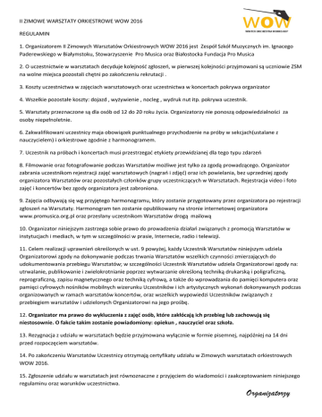 II ZIMOWE WARSZTATY ORKIESTROWE WOW 2016 REGULAMIN 1. Organizatorem II Zimowych Warsztatów Orkiestrowych WOW 2016 jest Zespół Szkół Muzycznych im. Ignacego Paderewskiego w Białymstoku, Stowarzyszenie Pro Musica oraz Białostocka Fundacja Pro Musica 2. O uczestnictwie w warsztatach decyduje kolejność zgłoszeń, w pierwszej kolejności przyjmowani są uczniowie ZSM na wolne miejsca pozostali chętni po zakończeniu rekrutacji . 3. Koszty uczestnictwa w zajęciach warsztatowych oraz uczestnictwa w koncertach pokrywa organizator 4. Wszelkie pozostałe koszty: dojazd , wyżywienie , nocleg , wydruk nut itp. pokrywa uczestnik. 5. Warsztaty przeznaczone są dla osób od 12 do 20 roku życia. Organizatorzy nie ponoszą odpowiedzialności za osoby niepełnoletnie. 6. Zakwalifikowani uczestnicy maja obowiązek punktualnego przychodzenie na próby w sekcjach(ustalane z nauczycielem) i orkiestrowe zgodnie z harmonogramem. 7. Uczestnik na próbach i koncertach musi przestrzegać etykiety przewidzianej dla tego typu zdarzeń 8. Filmowanie oraz fotografowanie podczas Warsztatów możliwe jest tylko za zgodą prowadzącego. Organizator zabrania uczestnikom rejestracji zajęć warsztatowych (nagrań i zdjęć) oraz ich powielania, bez uprzedniej zgody organizatora Warsztatów oraz pozostałych członków grupy uczestniczących w Warsztatach. Rejestracja video i foto zajęć i koncertów bez zgody organizatora jest zabroniona. 9. Zajęcia odbywają się wg przyjętego harmonogramu, który zostanie przygotowany przez organizatora po rejestracji zgłoszeń na Warsztaty. Harmonogram ten zostanie opublikowany na stronie internetowej organizatora www.promusica.org.pl oraz przesłany uczestnikom Warsztatów drogą mailową 10. Organizator niniejszym zastrzega sobie prawo do prowadzenia działań związanych z promocją Warsztatów w instytucjach i mediach, w tym w szczególności w prasie, Internecie, radio i telewizji. 11. Celem realizacji uprawnień określonych w ust. 9 powyżej, każdy Uczestnik Warsztatów niniejszym udziela Organizatorowi zgody na dokonywanie podczas trwania Warsztatów wszelkich czynności zmierzających do udokumentowania przebiegu Warsztatów; w szczególności Uczestnik Warsztatów udziela Organizatorowi zgody na: utrwalanie, publikowanie i zwielokrotnianie poprzez wytwarzanie określoną techniką drukarską i poligraficzną, reprograficzną, zapisu magnetycznego oraz techniką cyfrową, a także do wprowadzania do pamięci komputera oraz pamięci cyfrowych nośników mobilnych wizerunku Uczestników i ich artystycznych wykonań dokonywanych podczas organizowanych w ramach warsztatów koncertów, oraz wszelkich wypowiedzi Uczestników związanych z przebiegiem warsztatów i udzielonych Organizatorowi na jego prośbę. 12. Organizator ma prawo do wykluczenia z zajęć osób, które zakłócają ich przebieg lub zachowują się niestosownie. O fakcie takim zostanie powiadomiony: opiekun , nauczyciel oraz szkoła. 13. Rezygnacja z udziału w warsztatach będzie przyjmowana wyłącznie w formie pisemnej, najpóźniej na 14 dni przed rozpoczęciem warsztatów. 14. Po zakończeniu Warsztatów Uczestnicy otrzymają certyfikaty udziału w Zimowych warsztatach orkiestrowych WOW 2016. 15. Zgłoszenie udziału w warsztatach jest równoznaczne z przyjęciem do wiadomości i zaakceptowaniem niniejszego regulaminu oraz warunków uczestnictwa. Organizatorzy