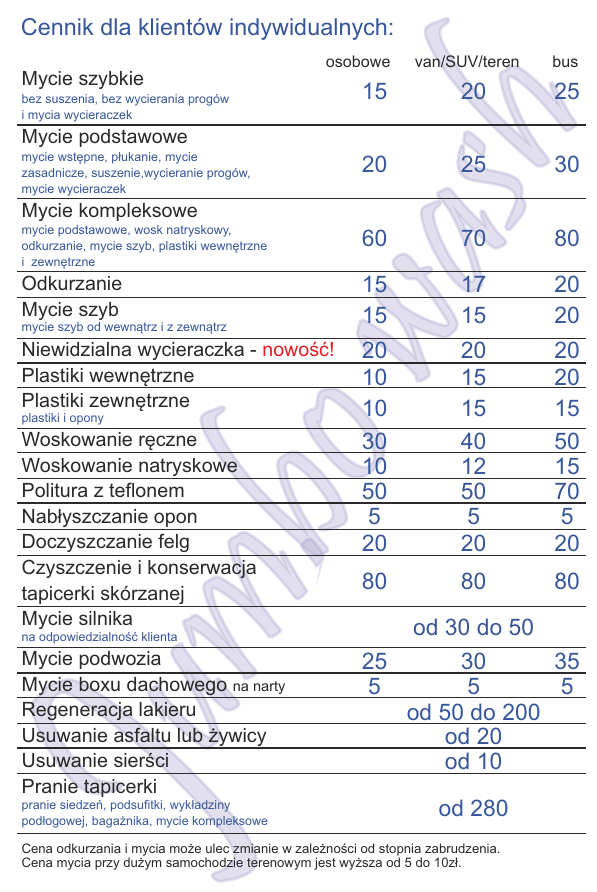 Cennik dla klientów indywidualnych: osobowe Mycie szybkie van/SUV/teren bus 20 25 20 25 30 mycie podstawowe, wosk natryskowy, odkurzanie, mycie szyb, plastiki wewnętrzne i zewnętrzne 60 70 80 Odkurzanie Mycie szyb 15 15 17 15 20 20 20 10 10 30 10 50 5 20 20 15 15 40 12 50 5 20 20 20 15 50 15 70 5 20 80 80 80 bez suszenia, bez wycierania progów i mycia wycieraczek Mycie podstawowe Mycie kompleksowe mycie szyb od wewnątrz i z zewnątrz was mycie wstępne, płukanie, mycie zasadnicze, suszenie,wycieranie progów, mycie wycieraczek h 15 Niewidzialna wycieraczka - nowość! Plastiki wewnętrzne Plastiki zewnętrzne J um.bo plastiki i opony Woskowanie ręczne Woskowanie natryskowe Politura z teflonem Nabłyszczanie opon Doczyszczanie felg Czyszczenie i konserwacja tapicerki skórzanej Mycie silnika na odpowiedzialność klienta Mycie podwozia Mycie boxu dachowego na narty Regeneracja lakieru Usuwanie asfaltu lub żywicy Usuwanie sierści Pranie tapicerki pranie siedzeń, podsufitki, wykładziny podłogowej, bagażnika, mycie kompleksowe od 30 do 50 25 30 35 5 5 5 od 50 do 200 od 20 od 10 od 280 Cena odkurzania i mycia może ulec zmianie w zależności od stopnia zabrudzenia. Cena mycia przy dużym samochodzie terenowym jest wyższa od 5 do 10zł.