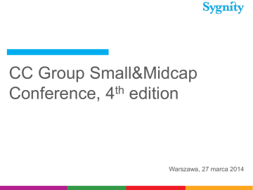 CC Group Small&Midcap th Conference, 4 edition Warszawa, 27 marca 2014 ZASTRZEŻENIA PRAWNE Niniejsza prezentacja nie stanowi oferty sprzedaży jakichkolwiek papierów wartościowych Spółki Sygnity S.A. (“Spółka”), w szczególności nie zawiera informacji o papierach wartościowych oraz warunkach ich nabywania, jak również nie stanowi zaproszenia do sprzedaży papierów wartościowych, składania ofert ich nabycia lub zapisu na papiery wartościowe Spółki. Niniejsza prezentacja ani żadna jej część jak też fakt jej dystrybucji nie będą stanowić podstawy do zawarcia jakiejkolwiek umowy lub zaciągnięcia jakiegokolwiek zobowiązania. Nie stanowi ona też źródła informacji, które mogłyby być podstawą decyzji o zawarciu jakiejkolwiek umowy lub zaciągnięciu jakiegokolwiek zobowiązania. Nie należy dla jakichkolwiek potrzeb polegać na informacjach zawartych w niniejszej prezentacji, ani też zakładać, że informacje te są kompletne, ścisłe lub rzetelne. Wszelkie takie założenia czynione są wyłącznie na własne ryzyko. Ani Spółka, ani osoby działające w jej imieniu, w szczególności członkowie Zarządu Spółki, ani jakiekolwiek inne osoby nie udzieliły żadnych wyraźnych ani dorozumianych gwarancji ani zapewnień co do ścisłości, kompletności lub rzetelności informacji bądź opinii zawartych w niniejszej prezentacji. Oświadczenia zawarte w niniejszej prezentacji, które nie stanowią faktów historycznych są „oświadczeniami dotyczącymi przyszłości”. Oświadczenia dotyczące przyszłości, w szczególności takich jak przewidywania co do przychodów z określonych rynków czy rozważania dotyczące rozwoju Spółki jej podmiotów zależnych oraz podmiotów stowarzyszonych i powiązanych („Grupa Kapitałowa”), nie należy traktować jako wiążących prognoz. Ani Spółka, ani osoby działające w jej imieniu, w szczególności członkowie Zarządu Spółki, ani jakiekolwiek inne osoby nie udzielają zapewnienia, że przewidywania dotyczące przyszłości zostaną spełnione, w szczególności nie gwarantują zgodności przyszłych wyników lub wydarzeń z tymi oświadczeniami jak również tego, że przyszłe wyniki Grupy Kapitałowej nie będą się istotnie różnić od przewidywanych. Informacje zamieszczone w niniejszej prezentacji mogą ulegać istotnym zmianom. Ani Spółka ani żadna inna osoba nie ma obowiązku aktualizowania lub dbania o aktualność informacji zawartych w niniejszej prezentacji ani też poprawiania jakichkolwiek ewentualnych nieścisłości; wszelkie wyrażone w niniejszej prezentacji opinie mogą ulec zmianie bez uprzedzenia. Ani Spółka, ani jakikolwiek członek jej organów, pracownik wyższego lub niższego szczebla, ani też jakakolwiek inna osoba nie ponosi jakiejkolwiek odpowiedzialności z tytułu jakichkolwiek szkód wynikających z wykorzystania niniejszej prezentacji lub jej treści. Poprzez udział w niniejszej prezentacji lub przyjęcie kopii niniejszego dokumentu, zobowiązują się Państwo do przestrzegania wspomnianych wyżej ograniczeń i warunków. 2 AGENDA O Sygnity Realizacja strategii 2013-2015 Wyniki finansowe 1Q 2014 Załączniki 3 O Sygnity O SYGNITY LOKALIZACJE W 15 MIASTACH W POLSCE I 1 NA LITWIE KLUCZOWE DATY I LICZBY Debiut na GPW Fuzja z Emax Przychody (FY2013) Liczba projektów zrealizowanych 1995 2007 rok 481 mln PLN ~8000 (raporty z lat 2003-2013) Liczba projektów w toku ~1000 Liczba klientów w roku ~ 500 4 O Sygnity HISTORIA Powstaje Emax 1988 Powstaje Computerland Sp z.o.o 1991 Debiut na GPW 1995 Debiut Emax SA na GPW /w skład wchodziły Emax SA, Winuel SA i Max Elektronik SA Z Computerland SA powstaje grupa kapitałowa Sygnity i zastępuje na giełdzie obie spółki Computerland nabywa 81,35% Spółki Geomar SA 2002 2007 Sygnity powstało w wyniku połączenia Grupy ComputerLand SA i Emax SA. Do grupy kapitałowej Sygnity należy również Geomar, Max Elektronik oraz litewski BKC. 5 O Sygnity ZMIANY JAKIE PRZESZLIŚMY PO FUZJI PRZYCHODY* mln PLN 2007 – utrata pionu Telco (~80 mln 1202 przychodu) 996 2007/2008 Spółka sprzedaje obszar rozwiązań dla szpitali i NFZ (~200 mln przychodu) 563 2007/2008 zakończenie kontraktu na dostawy 566 515 470 463 sprzętu dla MEN (~200 mln przychodu) 2009 Sygnity sprzedaje spółki Webinn i KPG (~40 mln przychodów) 2007 2008 2009 2010 *dane za lata kalendarzowe 2011 2012 2013 6 O Sygnity PEŁEN ZAKRES USŁUG IT - OD CONSULTINGU, POPRZEZ REALIZACJĘ DO OUTSOURCINGU ZESPÓŁ SPECJALISTÓW, ZŁOŻONYCH PROJEKTÓW KTÓRZY ŁĄCZĄ UNIKALNE KOMPETENCJE UMOŻLIWIAJA PROWADZENIE Unikalne kompetencje z obszaru zagadnień rynku pracy i zabezpieczeń społecznych, rozwiązań dla banków i biur maklerskich oraz z zakresu rynku energetyki Doświadczenie w kluczowych branżach – na rynku od 1991 roku Zdolność do wymiany wiedzy i wspólnego wykorzystywania posiadanych rozwiązań 7 O Sygnity STRATEGICZNE PARTNERSTWA Z LICZĄCYMI SIĘ MIĘDZYNARODOWYMI DOSTAWCAMI USŁUG IT Cross-selling produktów i usług Dostęp do nowych produktów i rynków (nowe źródła przychodów) Współpraca z globalnymi graczami (np. Fast Enterprises przy kontrakcie ePodatki) Połączenie i wykorzystanie unikalnych kompetencji Sygnity z możliwościami, które jako globalny lider, posiada IBM Otwarcie dla Sygnity rynku CEE w obszarze administracji publicznej ze szczególnym naciskiem na obszar rozliczeń podatkowych Wykorzystanie doświadczeń obu firm zdobywanych podczas realizacji projektu e-Podatki Współpraca Sygnity i Indra Systems – możliwość oferowania innowacyjnych rozwiązań w oparciu o specjalistyczną wiedzę i produkty Indra – międzynarodowa firma z sektora teleinformatyki, numer 1 w Hiszpanii i jeden z liderów na rynku europejskim i latynoamerykańskim. 8 AGENDA O Sygnity Realizacja strategii 2013-2015 Wyniki finansowe 1Q 2014 Załączniki 9 Realizacja strategii 2013-2015 ZAŁOŻENIA STRATEGII 2013-2015 PRIORYTETY STRATEGII 10 Rea
