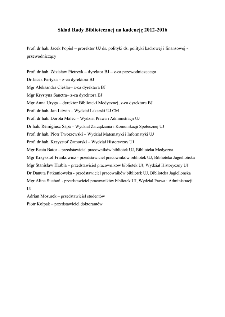 Skład Rady Bibliotecznej na kadencję 2012-2016 Prof. dr hab. Jacek Popiel – prorektor UJ ds. polityki ds. polityki kadrowej i finansowej przewodniczący Prof. dr hab. Zdzisław Pietrzyk – dyrektor BJ – z-ca przewodniczącego Dr Jacek Partyka – z-ca dyrektora BJ Mgr Aleksandra Cieślar– z-ca dyrektora BJ Mgr Krystyna Sanetra– z-ca dyrektora BJ Mgr Anna Uryga – dyrektor Biblioteki Medycznej, z-ca dyrektora BJ Prof. dr hab. Jan Litwin – Wydział Lekarski UJ CM Prof. dr hab. Dorota Malec – Wydział Prawa i Administracji UJ Dr hab. Remigiusz Sapa – Wydział Zarządzania i Komunikacji Społecznej UJ Prof. dr hab. Piotr Tworzewski – Wydział Matematyki i Informatyki UJ Prof. dr hab. Krzysztof Zamorski – Wydział Historyczny UJ Mgr Beata Bator – przedstawiciel pracowników bibliotek UJ, Biblioteka Medyczna Mgr Krzysztof Frankowicz - przedstawiciel pracowników bibliotek UJ, Biblioteka Jagiellońska Mgr Stanisław Hrabia – przedstawiciel pracowników bibliotek UJ, Wydział Historyczny UJ Dr Danuta Patkaniowska - przedstawiciel pracowników bibliotek UJ, Biblioteka Jagiellońska Mgr Alina Suchoń - przedstawiciel pracowników bibliotek UJ, Wydział Prawa i Administracji UJ Adrian Mosurek – przedstawiciel studentów Piotr Kołpak – przedstawiciel doktorantów