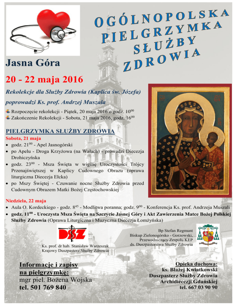 Jasna Góra 20 - 22 maja 2016 Rekolekcje dla Służby Zdrowia (Kaplica św. Józefa) poprowadzi Ks. prof. Andrzej Muszala Rozpoczęcie rekolekcji - Piątek, 20 maja 2016 o godz. 1000 Zakończenie Rekolekcji - Sobota, 21 maja 2016, godz. 1600 PIELGRZYMKA SŁUŻBY ZDROWIA Sobota, 21 maja  godz. 2100 - Apel Jasnogórski  po Apelu - Droga Krzyżowa (na Wałach) - prowadzi Diecezja Drohiczyńska  godz. 2300 - Msza Święta w wigilię Uroczystości Trójcy Przenajświętszej w Kaplicy Cudownego Obrazu (oprawa liturgiczna Diecezja Ełcka)  po Mszy Świętej - Czuwanie nocne Służby Zdrowia przed Cudownym Obrazem Matki Bożej Częstochowskiej Niedziela, 22 maja  Aula O. Kordeckiego - godz. 845 - Modlitwa poranna; godz. 900 - Konferencja Ks. prof. Andrzeja Muszali  godz. 1100 - Uroczysta Msza Święta na Szczycie Jasnej Góry i Akt Zawierzenia Matce Bożej Polskiej Służby Zdrowia (Oprawa Liturgiczna i Muzyczna Diecezja Łomżyńska) Ks. prof. dr hab. Stanisław Warzeszak Krajowy Duszpasterz Służby Zdrowia Informacje i zapisy na pielgrzymkę: mgr piel. Bożena Wojska tel. 501 769 840 Bp Stefan Regmunt Biskup Zielonogórsko - Gorzowski, Przewodniczący Zespołu KEP ds. Duszpasterstwa Służby Zdrowia Opieka duchowa: ks. Błażej Kwiatkowski Duszpasterz Służby Zdrowia Archidiecezji Gdańskiej tel. 667 03 90 90