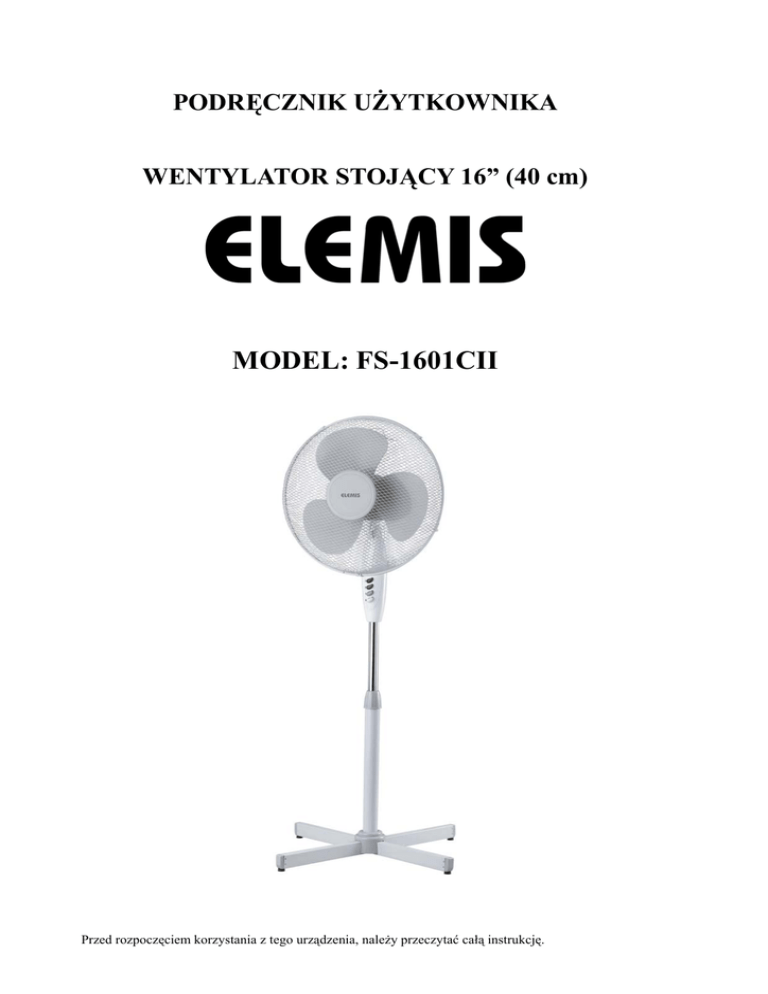 PODRĘCZNIK UŻYTKOWNIKA WENTYLATOR STOJĄCY 16” (40 cm) MODEL: FS-1601CII Przed rozpoczęciem korzystania z tego urządzenia, należy przeczytać całą instrukcję. Ostrzeżenia dotyczące bezpieczeństwa: 1. Należy sprawdzić, czy parametry na tabliczce znamionowej wentylatora odpowiadają parametrom zasilania w danym regionie. 2. Wtyczkę kabla zasilającego można włożyć do gniazdka dopiero po całkowitym złożeniu wentylatora. 3. Dzieci nie mogą się bawić pod wentylatorem. 4. Nie należy wkładać przez osłony palców ani innych obiektów, kiedy wentylator jest włączony. 5. Podczas przenoszenia wentylatora w inne miejsce, a także podczas czyszczenia należy wyłączyć zasilacz. 6. Gniazdo elektryczne musi być podłączone do instalacji uziemienia. 7. Jeśli przewód zasilający uległ zniszczeniu, to należy go wymienić na specjalny przewód miękki lub na specjalne części kupowane od producenta lub w punkcie obsługi konserwacyjnej. 8. Nachylenie powierzchni, na której umieszcza się wentylator, musi być mniejsze niż 10°. Nachylenie powierzchni, na której wentylator ma działać, musi być mniejsze niż 5°. 9. W celu bezpiecznego przetransportowania tego produktu należy zapakować w oryginalny karton i materiały opakowaniowe. 10. Dane techniczne mogą ulec zmianie, ze względu na stały proces usprawniania naszych produktów. Zastrzegamy sobie prawo do wprowadzania zmian i modyfikacji bez powiadomienia użytkownika. Jeśli w przyszłości zaistnieje konieczność wyrzucenia urządzenia, należy pamiętać, że zużyte urządzenia elektryczne nie powinny być wyrzucane wraz z odpadami domowymi. Jeśli w okolicy są centra recyklingu, należy tam przekazać urządzenie. Informacje dotyczące recyklingu można uzyskać od lokalnych władz lub od sprzedawcy sprzętu. (Dyrektywa w sprawie zużytego sprzętu elektrycznego i elektronicznego) CZĘŚCI WENTYLATORA 1 Krzyżak podstawy 2 Osłonka podstawy 3 Rurka zewnętrzna 4 Pokrętło regulacji wysokości 5 Rurka wewnętrzna 6 Nakrętka 7 Włącznik 8 Korpus włącznika 9 Obudowa silnika 10 Gałka trybu oscylacji 11 Oś 12 Osłona tylna 13 Nakrętka osłony 14 Śmigło 15 Nakrętka śmigła 16 Osłona przednia 17 Wypukła pokrywka Montaż: Najpierw należy zmontować krzyżak podstawy, odkręcić i wyjąć cztery śruby z listew i skrzyżować je. Cztery otwory na kołnierzu należy odpowiednio wyrównać. Następnie należy dokręcić cztery śruby i nałożyć na nóżki osłonkę podstawy. (Por. rys. 1) Osłonę tylną należy nałożyć z przodu silnika, a następnie dokręcić osłonę za pomocą nakrętki. (Por. rys. 2) Na oś silnika należy nałożyć śmigło, a następnie dokręcić je nakrętką. (Por. rys. 3) Całość należy przykryć przednią osłoną. Następnie należy połączyć osłonę przednią z osłoną tylną za pomocą przycisku. (Por. rys. 4) Rurkę wewnętrzną należy wyciągnąć z rurki zewnętrznej do odpowiedniej wysokości i skręcić je za pomocą pokrętła regulacji wysokości. Następnie należy nałożyć zmontowany korpus wentylatora na rurkę wewnętrzną. Na koniec należy przymocować korpus wentylatora za pomocą nakrętki. (Por. rys. 5) Obsługa: Włącznikami można włączać i wyłączać wentylator, a także ustawiać intensywność nawiewu: 0 = stop, 1 = niska prędkość, 2 = średnia prędkość, 3 = wysoka prędkość. Po wciśnięciu gałki trybu oscylacji głowica będzie się obracać na boki podczas wentylowania. Po podniesieniu tej gałki wentylator będzie nawiewał powietrze cały czas w jednym kierunku. Po odkręceniu pokrętła nachylenia można ustawić kąt nawiewu powietrza (góra-dół). Po regulacji należy dokręcić to pokrętło. Konserwacja 1. Do wycierania wentylatora należy używać wilgotnej ściereczki z detergentem lub suchej ściereczki. 2. Przed rozpoczęciem czyszczenia należy odłączyć zasilanie. 3. Nie należy stosować benzyny ani innych środków chemicznych do czyszczenia plastikowych części wentylatora. 4. Nie należy spłukiwać wentylatora wodą. 5. Podczas czyszczenia nie należy otwierać obudowy. Wewnątrz nie ma żadnych elementów obsługiwanych przez użytkownika. 6. Raz w roku należy wkropić do przedniego i tylnego łożyska w silniku niewielką ilość dobrej jakości smaru lub oleju do maszyn do szycia. 7. Wentylator może być używany w miejscach suchych i przewiewnych. Jeśli nie korzysta się z wentylatora, należy go odpowiednio zapakować. Nie należy przyciskać wentylatora podczas przechowywania. 8. Aby uniknąć zagrożenia w przypadku uszkodzenia kabla zasilającego, należy zlecić jego wymianę producentowi, autoryzowanemu punktowi serwisowemu lub osobie o odpowiednich kwalifikacjach. Telestar Electronics Ltd. Sp. z o.o. ul. Matuszewska 14, 03-876, Warszawa http://www.myelemis.pl INFOLINIA: 0801 45 10 10