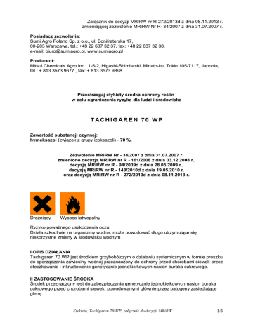 Załącznik do decyzji MRiRW nr R-272/2013d z dnia 08.11.2013 r. zmieniającej zezwolenie MRiRW Nr R- 34/2007 z dnia 31.07.2007 r. Posiadacz zezwolenia: Sumi Agro Poland Sp. z o.o., ul. Bonifraterska 17, 00-203 Warszawa, tel.: +48 22 637 32 37, fax: +48 22 637 32 38, e-mail: [email protected], www.sumiagro.pl Producent: Mitsui Chemicals Agro Inc., 1-5-2, Higashi-Shimbashi, Minato-ku, Tokio 105-7117, Japonia, tel.: + 813 3573 9677 , fax: + 813 3573 9898 Przestrzegaj etykiety środka ochrony roślin w celu ograniczenia ryzyka dla ludzi i środowiska T ACH IG AR E N 70 WP Zawartość substancji czynnej: hymeksazol (związek z grupy izoksazoli) - 70 %. Zezwolenie MRiRW Nr - 34/2007 z dnia 31.07.2007 r. zmienione decyzją MRiRW nr R - 161/2008 z dnia 03.12.2008 r., decyzją MRiRW nr R - 94/2009d z dnia 28.05.2009 r., decyzją MRiRW nr R - 148/2010d z dnia 19.05.2010 r. oraz decyzją MRiRW nr R - 272/2013d z dnia 08.11.2013 r. Drażniący Wysoce łatwopalny Ryzyko poważnego uszkodzenia oczu. Działa szkodliwie na organizmy wodne, może powodować długo utrzymujące się niekorzystne zmiany w środowisku wodnym I OPIS DZIAŁANIA Tachigaren 70 WP jest środkiem grzybobójczym o działaniu systemicznym w formie proszku do sporządzania zawiesiny wodnej przeznaczony do ochrony przed chorobami siewek przez otoczkowanie i inkrustowanie genetycznie jednokiełkowych nasion buraka cukrowego. II ZASTOSOWANIE ŚRODKA Środek przeznaczony jest do zabezpieczania genetycznie jednokiełkowych nasion buraka cukrowego przed chorobami siewek, powodowanymi głównie przez patogeny zasiedlające glebę. Etykieta, Tachigaren 70 WP, załącznik do decyzji MRiRW 1/3 ROŚLINY ROLNICZE 1 Burak cukrowy zgorzel siewek Zalecana dawka do inkrustowania i otoczkowania: 1500g/ 100kg nasion. Maksymalna dawka do inkrustowania i otoczkowania: 1500g/ 100kg nasion. Otoczkowanie i inkrustowanie - odbywa się automatycznie w cyklu zamkniętym, zgodnie ze szczegółową instrukcją obsługi urządzenia do otoczkowania i inkrustowania. Należy ściśle przestrzegać zalecanej dawki środka. UWAGI: 1. Zaprawianie nasion metodą otoczkowania lub inkrustowania może odbywać się wyłącznie w profesjonalnych zakładach zaprawiania nasion. 2. Nasiona otoczkowane lub inkrustowane przechowywać w suchych i przewiewnych pomieszczeniach. 3. Zaprawiony materiał siewny może być wykorzystany wyłącznie do siewu. 4. Nasiona buraka zaprawione wysokimi dawkami środków grzybobójczych przeznaczone są wyłącznie do zasiewów punktowych. III ŚRODKI OSTROŻNOŚCI 1. OKRES OD ZASTOSOWANIA ŚRODKA DO DNIA, W KTÓRYM NA OBSZAR, NA KTÓRYM ZASTOSOWANO ŚRODEK MOGĄ WEJŚĆ LUDZIE ORAZ ZOSTAĆ WPROWADZONE ZWIERZĘTA (okres prewencji). Nie dotyczy. 2. OKRES PREWENCJI DLA PSZCZÓŁ (okres zapobiegający zatruciu) Nie dotyczy. 3. OKRES OD OSTATNIEGO ZASTOSOWANIA ŚRODKA DO DNIA ZBIORU ROŚLINY UPRAWNEJ (okres karencji) Nie dotyczy. 4. OKRES OD OSTATNIEGO ZASTOSOWANIA ŚRODKA NA ROŚLINY PRZEZNACZONE NA PASZĘ DO DNIA, W KTÓRYM ZWIERZĘTA MOGĄ BYĆ KARMIONE TYMI ROŚLINAMI (okres karencji dla pasz) Nie dotyczy. 5. OKRES OD OSTATNIEGO ZASTOSOWANIA ŚRODKA NA ROŚLINY DO DNIA, W KTÓRYM MOŻNA SIAĆ LUB SADZIĆ ROŚLINY UPRAWIANE NASTĘPCZO Nie dotyczy. 6. OCHRONA STOSUJĄCEGO ŚRODEK OCHRONY ROŚLIN Nie spożywać posiłków i napojów oraz nie palić tytoniu podczas stosowania środka. Nie wdychać pyłu. Nie wdychać par cieczy użytkowej. Unikać zanieczyszczenia oczu. W przypadku zanieczyszczenia oczu przemyć je natychmiast dużą ilością wody i zasięgnąć porady lekarza. Natychmiast zdjąć całą zanieczyszczoną odzież. Etykieta, Tachigaren 70 WP, załącznik do decyzji MRiRW 2/3 W przypadku zanieczyszczenia skóry natychmiast przemyć ją dużą ilością wody. Nosić odpowiednią odzież ochronną, odpowiednie rękawice ochronne i okulary/ochronę twarzy. W razie połknięcia niezwłocznie zasięgnąć porady lekarza i pokazać mu opakowanie lub etykietę. 7. OCHRONA ŚRODOWISKA Zabrania się stosowania środka w strefie bezpośredniej ochrony ujęć wody. Nie zanieczyszczać wód środkiem ochrony roślin lub jego opakowaniem. Nie myć aparatury w pobliżu wód powierzchniowych. Unikać zanieczyszczania wód poprzez rowy odwadniające z gospodarstw i dróg. Przed zastosowaniem środka należy poinformować o tym fakcie wszystkie zainteresowane strony, które mogą być narażone na znoszenie cieczy roboczej i które zwróciły się o taką informację. Wodę użytą do mycia zaprawiarki zużyć do sporządzenia cieczy użytkowej podczas kolejnego zaprawiania. Po pracy aparaturę dokładnie wymyć. Opróżnione opakowania traktować jako odpady komunalne. Zabrania się spalania opakowań po środku ochrony roślin we własnym zakresie Zabrania się wykorzystywania opróżnionych opakowań po środkach ochrony roślin do innych celów, w tym także traktowania ich jako surowce wtórne IV PIERWSZA POMOC Antidotum: brak, stosować leczenie objawowe. W przypadku awarii lub jeśli się źle poczujesz, niezwłocznie zasięgnij porady lekarza - jeżeli to możliwe, pokaż etykietę). W zaistniałych sytuacjach, kiedy wymagana jest lub konieczna inna pomoc medyczna niż ujęta w wyżej wymienionych ostrzeżeniach skontaktować się z najbliższym ośrodkiem toksykologicznym: Gdańsk Kraków Lublin Łódź Poznań (58) 682-04-04 (12) 411-99-99 (81) 740-89-83 (42) 657-99-00 (61) 847-69-46 Rzeszów Sosnowiec Tarnów Warszawa Wrocław (17) 866-40-25 (32) 266-11-45 (14) 631-54-09 (22) 619-66-54 (71) 343-30-08 V PRZECHOWYWANIE Przechowywać pod zamknięciem i chronić przed dziećmi. Nie przechowywać razem z żywnością, napojami i paszami dla zwierząt. Przechowywać z dala od źródeł ciepła. Przechowywać wyłącznie w oryginalnym opakowaniu w temperaturze nie niższej niż 0oC i nie wyższej niż 30oC. Okres ważności - 2 lata Data produkcji - ........ Zawartość netto - ........ Nr partii - ........ Etykieta, Tachigaren 70 WP, załącz