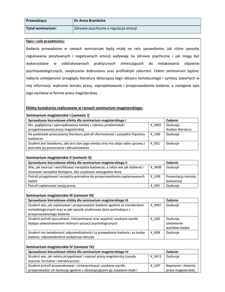 Prowadzący: Dr Anna Braniecka Tytuł seminarium: Zdrowie psychiczne a regulacja emocji Opis i cele przedmiotu: Badania prowadzone w ramach seminarium będą miały na celu sprawdzenie, jak różne sposoby regulowania pozytywnych i negatywnych emocji wpływają na zdrowie psychiczne i jak mogą być wykorzystane w oddziaływaniach praktycznych zmierzających do redukowania objawów psychopatologicznych, zwiększania dobrostanu oraz profilaktyki zaburzeń. Celem seminarium będzie: nabycie umiejętności przeglądu literatury dotyczącej tego obszaru tematycznego i syntezy zawartych w niej informacji, wybranie tematu pracy, zaprojektowanie i przeprowadzenie badania, a następnie opis jego wyników w formie pracy magisterskiej. Efekty kształcenia realizowane w ramach seminarium magisterskiego: Seminarium magisterskie I (semestr I) Sprawdzane kierunkowe efekty dla seminarium magisterskiego I Ma pogłębioną i uporządkowaną wiedzę z zakresu problematyki przygotowywanej pracy magisterskiej Na podstawie przeczytanej literatury potrafi sformułować i uzasadnić hipotezy badawcze Student jest świadomy, jaki jest stan jego wiedzy oraz ma zdaje sobie sprawę z potrzeby jej poszerzania i aktualizowania K_U06 Zadanie Dyskusje, Analiza literatury Dyskusje K_K01 Dyskusje K_W08 Zadanie Dyskusje K_W02 Seminarium magisterskie II (semestr II) Sprawdzane kierunkowe efekty dla seminarium magisterskiego II Wie, jak tworzyć i weryfikować narzędzia badawcze, a także wie jak dobierać i stosować narzędzia dostępne, aby uzyskiwać wiarygodne dane Potrafi przygotować narzędzia potrzebne do przeprowadzenia zaplanowanych badań Potrafi zaplanować swoją pracę. K_U08 K_K05 Prezentacja metody badawczej Dyskusje K_W07 Zadanie Dyskusje Seminarium magisterskie III (semestr III) Sprawdzane kierunkowe efekty dla seminarium magisterskiego III Student wie, jak zaplanować i przeprowadzić badanie zgodnie ze standardami metodologicznymi oraz w jaki sposób analizować dane pochodzące z przeprowadzonego badania Student potrafi wyszukiwać, interpretować oraz wyjaśnić uzyskane wyniki będące odwzorowaniem realnych sytuacji psychologicznych Student ma świadomość odpowiedzialności za prowadzone badania i za osoby badane, odpowiedzialnie podejmuje decyzje K_U02 K_K08 Dyskusje, omówienie wyników badań Dyskusje K_W13 Zadanie Dyskusje Seminarium magisterskie IV (semestr IV) Sprawdzane kierunkowe efekty dla seminarium magisterskiego IV Student wie, jak należy przygotować i napisać pracę magisterską (zasady etyczne, formalne i merytoryczne) Student potrafi przeanalizować i zinterpretować uzyskane wyniki, przeprowadzić ich dyskusję zgodnie z obowiązującymi go zasadami etyki i K_U07 Napisanie i złożenie pracy magisterskiej względami formalnymi Potrafi napisać pracę magisterską Świadomie stosuje się do zasad etyki zawodowej i w ich świetle rozpatruje napotykane trudności w realizacji projektu K_U12 K_K07 Dyskusje Tematyka i przykładowe pytania badawcze: Przedmiotem badań realizowanych w ramach seminarium będą różnorodne formy wpływania na stan emocjonalny, które podejmowane są przez osoby z zaburzeniami psychicznymi oraz przez osoby doświadczające trudnych sytuacji życiowych i kryzysów psychicznych. Badania będą dotyczyły tego, czy i w jakich warunkach takie sposoby regulowania emocji, jak przewartościowanie, humor, tłumienie, akceptacja czy dystrakcja mają korzystny wpływ na określone aspekty zdrowia psychicznego oraz jak mogą być wykorzystywane w ramach pomocy psychologicznej. Przykładowe pytania badawcze: Jakie sposoby regulacji emocji są optymalne w depresji a jakie w zaburzeniach lękowych? Jaki rodzaj przewartościowania sytuacji porażki jest najbardziej korzystny dla zmniejszania negatywnego afektu i obwiniania się. Czy osoby z zaburzeniami psychicznymi czerpią więcej korzyści dla samopoczucia z komizmu, kiedy go tworzą czy kiedy są jego odbiorcami? Jaka walencja przywoływanych wspomnień poprawia a jaka pogarsza regulację emocji w depresji? Pozytywna, negatywna czy afektywnie mieszana? Jaki rodzaj humoru stosowanego przez osoby podatne na depresje zmniejsza poziom ruminacji i doświadczanych emocji negatywnych? Jakie są różnice pod względem regulacji emocji między osobami z zaburzeniem afektywnym dwubiegunowym a osobami z zaburzeniami depresyjnymi nawracającymi? Wymagania wobec uczestników seminarium: Zainteresowanie problematyką zdrowia psychicznego, zaburzeń psychicznych, regulacji emocji, praktycznymi zastosowaniami psychologii klinicznej. Dobra bierna znajomość języka angielskiego umożliwiająca czytanie tekstów w języku angielskim. Wstępny harmonogram pracy i warunki zaliczenia: Semestr 1: Przeanalizowanie na podstawie literatury problematyki zdrowia psychicznego i zaburzeń psychicznych w kontekście regulacji emocji. Wybór tematu pracy magisterskiej, postawienie pytania badawczego oraz hipotez. Semestr 2: Opracowanie metody badania i przeprowadzenie badania. Semestr 3: Analiza i interpretacja wyników badania Semestr 4: Napisanie pracy magisterskiej Zaliczenie kolejnych semestrów następuje na podstawie wykonania powyższych zadań. Podstawowa literatura do zajęć: Braniecka, A, Parnowska, D. i Radomska, A. (2012). Poczucie humoru u pacjentów z depresją – przegląd badań. Psychiatria Polska, 6, 1007-1018. Butcher, J., Carson, R., Mineka, S. (2003). Psychologia Zaburzeń. Człowiek we współczesnym świecie. Gdańsk: GWP. Fredrickson, B. (2011). Pozytywność. Poznań: Zysk i S-ka. Joseph, S. i Linley, A. (2007). Psychologia pozytywna w praktyce. Warszawa: PWN. Leahy, R.L., Tirch, D. i Neapolitano, L.A. (2014). Regulacja emocji w psychoterapii. Kraków: WUJ. Parnowska, D., Braniecka, A. i Radomska, A. (2013). Poczucie humoru w schizofrenii i możliwości jego wykorzystania w oddziaływaniach terapeutycznych. Psychiatria Polska, 47(5), 945-956. Soroko, E. (2007). Regulacja emocji w kontekście rozwoju osobowości. W: