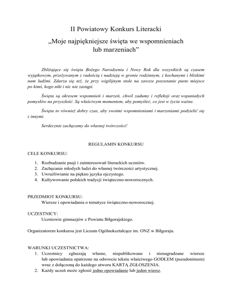 II Powiatowy Konkurs Literacki „Moje najpiękniejsze święta we wspomnieniach lub marzeniach” Zbliżające się święta Bożego Narodzenia i Nowy Rok dla wszystkich są czasem wyjątkowym, przeżywanym z radością i nadzieją w gronie rodzinnym, z kochanymi i bliskimi nam ludźmi. Zdarza się też, że przy wigilijnym stole na zawsze pozostanie puste miejsce po kimś, kogo nikt i nic nie zastąpi. Święta są okresem wspomnień i marzeń, chwil zadumy i refleksji oraz wspaniałych pomysłów na przyszłość. Są właściwym momentem, aby pomyśleć, co jest w życiu ważne. Święta to również dobry czas, aby swoimi wspomnieniami i marzeniami podzielić się z innymi. Serdecznie zachęcamy do własnej twórczości! REGULAMIN KONKURSU CELE KONKURSU: 1. 2. 3. 4. Rozbudzanie pasji i zainteresowań literackich uczniów. Zachęcanie młodych ludzi do własnej twórczości artystycznej. Uwrażliwianie na piękno języka ojczystego. Kultywowanie polskich tradycji świąteczno-noworocznych. PRZEDMIOT KONKURSU: Wiersze i opowiadania o tematyce świąteczno-noworocznej. UCZESTNICY: Uczniowie gimnazjów z Powiatu Biłgorajskiego. Organizatorem konkursu jest Liceum Ogólnokształcące im. ONZ w Biłgoraju. WARUNKI UCZESTNICTWA: 1. Uczestnicy zgłaszają własne, niepublikowane i nienagradzane wiersze lub opowiadania opatrzone na odwrocie tekstu właściwego GODŁEM (pseudonimem) wraz z dołączoną do każdego utworu KARTĄ ZGŁOSZENIA. 2. Każdy uczeń może zgłosić jedno opowiadanie lub jeden wiersz. 3. Konkurs odbywa się w dwóch kategoriach: poezja i proza. 4. Prace konkursowe można: - składać osobiście w sekretariacie Organizatora, - przesłać pocztą tradycyjną na adres: Liceum Ogólnokształcące im. ONZ ul. T. Kościuszki 41/43 23-400 Biłgoraj z dopiskiem Powiatowy Konkurs Literacki - przesłać pocztą elektroniczną: [email protected] z informacją w temacie: Powiatowy Konkurs Literacki. 5. Termin nadsyłania prac 31 stycznia 2017 roku (decyduje data stempla pocztowego). 6. Dla laureatów przewidziane są nagrody i wyróżnienia, dla wszystkich uczestników dyplomy. 7. Uroczyste podsumowanie konkursu odbędzie się w lutym, podczas obchodów w LO im. ONZ w Biłgoraju Międzynarodowego Dnia Języka Ojczystego. O dokładnym terminie uczniowie nagrodzeni i wyróżnieni oraz ich opiekunowie zostaną poinformowani telefonicznie. 8. W przypadku pytań prosimy o kontakt z koordynatorem konkursu panią Jadwigą Oleszek pod nr telefonu 668 825 176. Karta zgłoszenia uczestnika do udziału w II Powiatowym Konkursie Literackim „Moje najpiękniejsze święta we wspomnieniach i marzeniach” Dane uczestnika konkursu: GODŁO (pseudonim) Imię i nazwisko uczestnika: Klasa Dane teleadresowe szkoły: Pełna nazwa szkoły Adres szkoły Nr telefonu Dane dodatkowe: Tytuł wiersza Tytuł opowiadania Imię i nazwisko nauczyciela Telefon lub e-mail kontaktowy nauczyciela Wyrażam zgodę na udział mojego dziecka w Powiatowym Konkursie Literackim „Moje najpiękniejsze święta we wspomnieniach lub marzeniach”. Oświadczam, że wyrażam zgodę na przetwarzanie i wykorzystanie danych osobowych dla celów niniejszego Konkursu zgodnie z art. 6 ustawy z dnia 29.08.97 r. o ochronie danych osobowych (Dz. U. Z 1997 r. Nr 133 poz. 883). ............................................................................ podpis rodzica/opiekuna prawnego uczestnika
