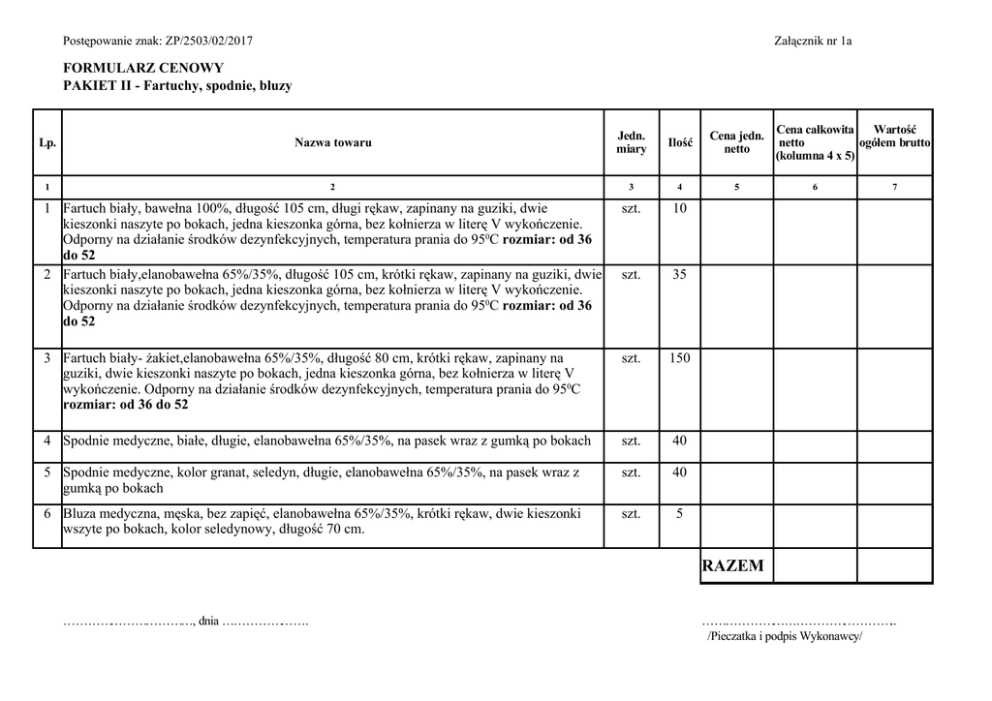 FORMULARZ CENOWY PAKIET II - Fartuchy, spodnie, bluzy 1 szt