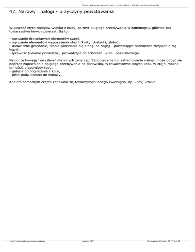 Forum dyskusyjne Nasza Szkapa - konie, jeźdźcy, jeździectwo i inne dyskusje 47. Narowy i nałogi - przyczyny powstawania Większość złych nałogów wynika z nudy, ze zbyt długiego przebywania w zamknięciu, głównie bez towarzystwa innych zwierząt. Są to: - ogryzanie drewnianych elementów stajni; - ogryzanie elementów wyposażenia stajni (kraty, drabinki, żłoby); - ustawiczne grzebanie, tkanie (kołysanie się z nogi na nogę) - powodujące nadmierne zużywanie się kopyt; - łykawość (łykanie powietrza), prowadzące do schorzeń układu pokarmowego. Nałogi te bywają "zaraźliwe" dla innych zwierząt. Zapobieganie lub zahamowanie nałogu może odbyć się poprzez zapewnienie długiego przebywania na pastwisku, w towarzystwie innych koni. W stajni można umieścić przedmioty typu: - gałęzie do obgryzania z kory, - piłka podwieszana do zabawy, Koniom samotnym często zapewnia się towarzystwo innego zwierzęcia, np. kozy, królika. http://naszaszkapa.pl/naszaszkapa Kreator PDF Utworzono 4 March, 2017, 04:37