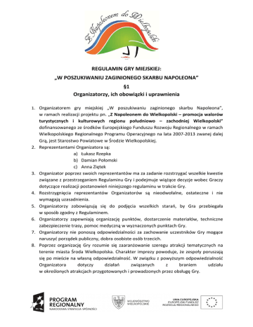 REGULAMIN GRY MIEJSKIEJ: „W POSZUKIWANIU ZAGINIONEGO SKARBU NAPOLEONA” §1 Organizatorzy, ich obowiązki i uprawnienia 1. Organizatorem gry miejskiej „W poszukiwaniu zaginionego skarbu Napoleona”, 2. 3. 4. 5. 6. 7. 8. w ramach realizacji projektu pn. „Z Napoleonem do Wielkopolski – promocja walorów turystycznych i kulturowych regionu południowo – zachodniej Wielkopolski” dofinansowanego ze środków Europejskiego Funduszu Rozwoju Regionalnego w ramach Wielkopolskiego Regionalnego Programu Operacyjnego na lata 2007-2013 zwanej dalej Grą, jest Starostwo Powiatowe w Środzie Wielkopolskiej. Reprezentantami Organizatora są: a) Łukasz Rzepka b) Damian Połomski c) Anna Ziętek Organizator poprzez swoich reprezentantów ma za zadanie rozstrzygać wszelkie kwestie związane z przestrzeganiem Regulaminu Gry i podejmuje wiążące decyzje wobec Graczy dotyczące realizacji postanowień niniejszego regulaminu w trakcie Gry. Rozstrzygnięcia reprezentantów Organizatorów są nieodwołalne, ostateczne i nie wymagają uzasadnienia. Organizatorzy zobowiązują się do podjęcia wszelkich starań, by Gra przebiegała w sposób zgodny z Regulaminem. Organizatorzy zapewniają organizację punktów, dostarczenie materiałów, techniczne zabezpieczenie trasy, pomoc medyczną w wyznaczonych punktach Gry. Organizatorzy nie ponoszą odpowiedzialności za zachowanie uczestników Gry mogące naruszyć porządek publiczny, dobra osobiste osób trzecich. Poprzez organizację Gry rozumie się zaaranżowanie szeregu atrakcji tematycznych na terenie miasta Środa Wielkopolska. Charakter imprezy powoduje, że zespoły poruszają się po mieście na własną odpowiedzialność. W związku z powyższym odpowiedzialność Organizatora dotyczy działań związanych z braniem udziału w określonych atrakcjach przygotowanych i prowadzonych przez obsługę Gry. §2 Uczestnicy 1. Gra przeznaczona jest dla mieszkańców Powiatu Średzkiego oraz gości z powiatów partnerskich projektu tj.: Powiatu Jarocińskiego, Powiatu Śremskiego, Powiatu Kościańskiego, Powiatu Gostyńskiego, oraz Powiatu Leszczyńskiego, zarówno pełnoletnich jak i niepełnoletnich (od trzynastego roku życia) z tym, że osoby niepełnoletnie uczestniczące w Grze muszą posiadać pisemną zgodę rodziców lub opiekunów na udział w Grze. 2. W Grze można wziąć udział w następujących kategoriach wiekowych: a) młodzież gimnazjalna b) młodzież szkół średnich c) rodziny, dorośli i wszyscy chętni 3. Graczem może być osoba fizyczna, która nie jest pod wpływem alkoholu, narkotyków lub innych środków odurzających. 4. Zadaniem uczestników jest rozwiązywanie zagadek Gry i wykonywanie powierzonych im zadań. 5. Udział w Grze jest bezpłatny. 6. Niezbędnym warunkiem udziału w Grze jest rejestracja. 7. Rejestracji dokonuje się mailowo na adres: [email protected], poprzez przesłanie niezbędnych dokumentów (wypełnionej karty zgłoszeniowej i jeśli dotyczy to zgody na uczestnictwo osób niepełnoletnich na udział w Grze) lub na adres: Wydział Promocji i Rozwoju ul. Żwirki i Wigury 1 63-000 Środa Wlkp., z dopiskiem „Gra miejska” do dnia 20.07.2012. (przesłanie zgłoszenia drogą mailową jest równoznaczne z zapoznaniem się z regulaminem. UWAGA: osoby niepełnoletnie muszą dostarczyć podpisaną zgodę opiekunów). 8. Regulamin, karta zgłoszeniowa i zgoda na uczestnictwo osób niepełnoletnich dostępne będą na stronie www.srodawlkp-powiat.pl lub w Wydziale Promocji i Rozwoju Powiatu Średzkiego. 9. Osoby, które dokonały rejestracji mają gwarantowany udział w Grze pod warunkiem osobistego zgłoszenia się do punktu startowego na Starym Rynku w Środzie Wlkp. w dniu Gry od godz. 10.00 do 11.45 celem odebrania Karty Gry (jedna na grupę), kart cyrkulacyjnych, kotylionów z nazwą grupy. 10. Brak osobistego zgłoszenia (przez lidera grupy) do godziny 11.45 w dniu Gry oznacza anulowanie wcześniejszej rejestracji. 11. Przystąpienie do Gry odbywa się w momencie odebrania od Organizatora Kart Gry. Gracz przystępując do Gry zgadza się na warunki przedstawione w niniejszym Regulaminie i zobowiązuje się do ich przestrzegania. 12. Gracz wyraża zgodę na publikację przez organizatora wizerunku uczestnika w dokumentacji fotograficznej i filmowej Gry oraz opublikowanie w łamach strony internetowej i w informacjach medialnych przez Organizatorów wizerunku uczestnika, imienia i nazwiska uczestnika w przypadku, gdy ten otrzyma nagrodę lub wyróżnienie. 13. Gracz przystępując do Gry bierze na siebie pełną odpowiedzialność prawno-cywilną na cały czas trwania Gry. Odpowiedzialność obejmuje przede wszystkim szkody poniesione przez Gracza, a także szkody wyrządzone na Graczu. 14. Gracz w trakcie Gry ma obowiązek postępować zgodnie z Zasadami Gry oraz Regulaminem Gry pod groźbą wykluczenia z Gry w przypadku postępowania niezgodnego z ww. dokumentami. 15. Graczy obowiązują zasady wzajemnego poszanowania i tolerancji. §3 Zasady Gry 1. Gra odbędzie się 18 sierpnia 2012 roku w godz. 12.00 – 16.00 na terenie miasta Środa Wielkopolska. 2. Celem Gry jest przybliżenie uczestnikom wydarzeń z okresu napoleońskiego. 3. Uczestnicy grają w zespołach liczących od 4 do 6 osób. 4. W trakcie Gry Gracze nie mogą rozdzielać się w ramach swoich zespołów i muszą w pełnym składzie pojawić się na kolejnych punktach Gry. 5. Gracze są zobowiązani do znajomości Regulaminu Gry. 6. Podczas Gry Gracze otrzymują wszelkie niezbędne informacje do udziału w Grze. 7. Gracze mogą poruszać się wyłącznie pieszo. 8. Elementem identyfikującym Graczy (zespoły) jest specjalnie przygotowana w tym celu karta, zwana dalej Kartą Gry oraz kotyliony z nazwami grup otrzymane w trakcie rejestracji w dniu Gry. 9. Brak Karty Gry, jej zgubienie lub zniszczenie eliminuje Graczy z Gry. 10. Zadaniem Graczy jest uzyskanie jak najwyższego wyniku liczonego w punktach, które będą wpisywane do karty Gr