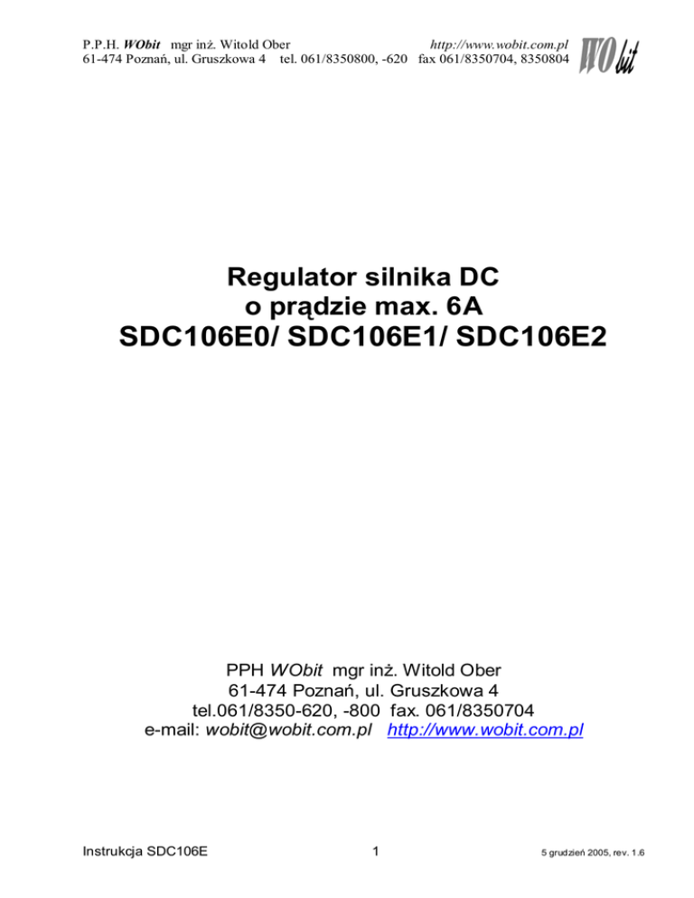 P.P.H. WObit mgr inż. Witold Ober http://www.wobit.com.pl 61-474 Poznań, ul. Gruszkowa 4 tel. 061/8350800, -620 fax 061/8350704, 8350804 Regulator silnika DC o prądzie max. 6A SDC106E0/ SDC106E1/ SDC106E2 PPH WObit mgr inż. Witold Ober 61-474 Poznań, ul. Gruszkowa 4 tel.061/8350-620, -800 fax. 061/8350704 e-mail: [email protected] http://www.wobit.com.pl Instrukcja SDC106E 1 5 grudzień 2005, rev. 1.6 P.P.H. WObit mgr inż. Witold Ober http://www.wobit.com.pl 61-474 Poznań, ul. Gruszkowa 4 tel. 061/8350800, -620 fax 061/8350704, 8350804 WŁAŚCIWOŚCI ................................................................................................................................3 PRZYKŁADOWA KONFIGURACJA (DLA SDC106E0) ............................................................4 OBSŁUGA PODSTAWOWA ...........................................................................................................5 PROGRAMOWANIE STEROWNIKA...........................................................................................6 Ustawianie parametrów regulatora.............................................................................................7 Sterowanie w czasie rzeczywistym ...............................................................................................8 Programowanie listy rozkazów ....................................................................................................8 PRZELICZANIE WARTOŚCI PARAMETRÓW .........................................................................9 ROZKAZY ROZPOZNAWANE PRZEZ STEROWNIK ...........................................................11 AKTUALIZACJA OPROGRAMOWANIA .................................................................................12 HISTORIA ZMIAN OPROGRAMOWANIA...............................................................................14 DANE ELEKTRYCZNE:................................................................................................................14 SYMBOL ZAMÓWIENIOWY: .....................................................................................................14 Instrukcja SDC106E 2 5 grudzień 2005, rev. 1.6 P.P.H. WObit mgr inż. Witold Ober http://www.wobit.com.pl 61-474 Poznań, ul. Gruszkowa 4 tel. 061/8350800, -620 fax 061/8350704, 8350804 Właściwości - - 3 odmiany: SDC106E0, SDC106E1, SDC106E2 przystosowane do pracy z enkoderami o napięciu zasilania równym odpowiednio 5, 12 i 24 VDC 4 tryby pracy: regulacja położenia, regulacja prędkości, regulacja prędkości z prędkością zadawaną potencjometrem, regulacja prędkości do wartości wybieranej trzema wejściami cyfrowymi obciążalność prądowa do 6 A napięcie zasilania 10 – 24 VDC napięcie znamionowe silnika 6 – 24 VDC PWM o częstotliwości 62.5 kHz zabezpieczenie przeciwzwarciowe i przeciwprzeciążeniowe przy 30 A zabezpieczenie termiczne optoizolowane wejścia enkodera optoizolowane wejścia START i DIR do uruchamiania/zatrzymywania silnika i zmiany kierunku wirowania łącze RS232 do sterowania pracą regulatora 3 wejścia cyfrowe do zadawania prędkości wejście analogowe 0 – 5 V do zadawania prędkości 4 wejścia cyfrowe do obsługi zewnętrznych elementów (np. wyłączniki krańcowe) wskaźniki LED stanu zasilania, błędu, gotowości, uruchomienia silnika i kierunku jego wirowania możliwość programowania listy instrukcji do wykonania (typu jedź na pozycję pierwszą, jedź na pozycję drugą, czekaj na sygnał, powtórz cykl) możliwość sterowania w czasie rzeczywistym z komputera PC lub innego urządzenia wyposażonego w interfejs RS232 obudowa przystosowana do montażu na szynie DIN SDC106E0/SDC106E1/ SDC106E2 to seria sterowników przeznaczonych dla silników prądu stałego umożliwiających regulację położenia i prędkości silnika. Sterowanie kierunkiem obrotów odbywa się za pomocą optoizolowanego wejścia DIR lub na drodze programowej. Wejście START decyduje o tym, czy silnik ma pracować (obracać się), czy być zatrzymany. Do zasilania sterownika należy stosować zasilacz niestabilizowany, o napięciu wyjściowym równym napięciu znamionowemu podłączonego silnika lub nieco wyższym (jednak nie jest to zalecane). Zasilacz powinien posiadać na wyjściu duże kondensatory elektrolityczne w celu odebrania ewentualnej energii wracającej od rozpędzonego silnika przez sterownik (BACK EMF). Podłączając sterownik należy zwrócić uwagę na poprawną polaryzację zasilania, gdyż zamiana + z – spowoduje uszkodzenie sterownika. Instrukcja SDC106E 3 5 grudzień 2005, rev. 1.6 P.P.H. WObit mgr inż. Witold Ober http://www.wobit.com.pl 61-474 Poznań, ul. Gruszkowa 4 tel. 061/8350800, -620 fax 061/8350704, 8350804 Przykładowa konfiguracja (dla SDC106E0) ZASILACZ (np. SP0305) GND ZEWNĘTRZNE +5VDC ZEWNĘTRZNE START COM DIR +5VDC AIN GND RXD GND TXD PC ENKODER ENKODER ENKODER ENKODER AIN W1 W2 W3 W4 W5 W6 W7 M+ MVCC GND GND ZASILACZ (10–24V, 6A max) /A A /B B GND GND GND GND GND GND GND GND M Rysunek 1 – przykładowa konfiguracja dla wersji SDC106E0 Do stworzenia napędu, oprócz samego regulatora, będą potrzebne dodatkowe elementy: - silnik prądu stałego o napięciu nominalnym 6 – 24 V i prądzie do 6 A - enkoder sprzężony z wałem silnika (zalecana rozdzielczość 200 działek na obrót); - 2 przełączniki umożliwiające uruchomienie/zatrzymanie silnika oraz zmianę jego kierunku; - zasilacz do enkodera i przełączników (napięcie zależne od napięcia zasilania enkodera), np. 5 V, 0.3 W o oznaczeniu SP0305 z oferty WObit; - zasilacz główny dla regulatora, jego parametry powinny być dopasowane do typu silnika; - potencjometr, jeśli użyte będzie wejście analogowe, np. 10 – obrotowy R = 5 kΩ typ WM2010; - komputer PC wyposażony w łącze szeregowe RS232 (do programowania listy rozkazów lub sterowania w czasie rzeczywistym, jednak nie jest on niezbędny, zob. punkt Obsługa podstawowa) - przełączniki, przyciski lub inne mec
