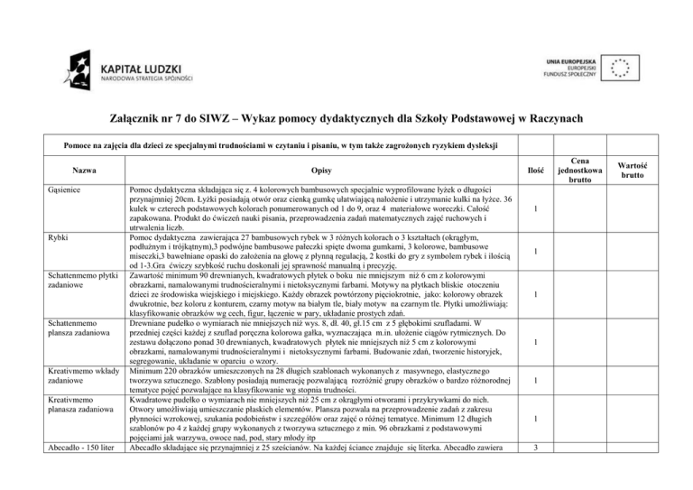 Załącznik nr 7 do SIWZ – Wykaz pomocy dydaktycznych dla Szkoły Podstawowej w Raczynach Pomoce na zajęcia dla dzieci ze specjalnymi trudnościami w czytaniu i pisaniu, w tym także zagrożonych ryzykiem dysleksji Nazwa Gąsienice Rybki Schattenmemo płytki zadaniowe Schattenmemo plansza zadaniowa Kreativmemo wkłady zadaniowe Kreativmemo planasza zadaniowa Abecadło - 150 liter Opisy Pomoc dydaktyczna składająca się z. 4 kolorowych bambusowych specjalnie wyprofilowane łyżek o długości przynajmniej 20cm. Łyżki posiadają otwór oraz cienką gumkę ułatwiającą nałożenie i utrzymanie kulki na łyżce. 36 kulek w czterech podstawowych kolorach ponumerowanych od 1 do 9, oraz 4 materiałowe woreczki. Całość zapakowana. Produkt do ćwiczeń nauki pisania, przeprowadzenia zadań matematycznych zajęć ruchowych i utrwalenia liczb. Pomoc dydaktyczna zawierająca 27 bambusowych rybek w 3 różnych kolorach o 3 kształtach (okrągłym, podłużnym i trójkątnym),3 podwójne bambusowe pałeczki spięte dwoma gumkami, 3 kolorowe, bambusowe miseczki,3 bawełniane opaski do założenia na głowę z płynną regulacją, 2 kostki do gry z symbolem rybek i ilością od 1-3.Gra ćwiczy szybkość ruchu doskonali jej sprawność manualną i precyzję. Zawartość minimum 90 drewnianych, kwadratowych płytek o boku nie mniejszym niż 6 cm z kolorowymi obrazkami, namalowanymi trudnościeralnymi i nietoksycznymi farbami. Motywy na płytkach bliskie otoczeniu dzieci ze środowiska wiejskiego i miejskiego. Każdy obrazek powtórzony pięciokrotnie, jako: kolorowy obrazek dwukrotnie, bez koloru z konturem, czarny motyw na białym tle, biały motyw na czarnym tle. Płytki umożliwiają: klasyfikowanie obrazków wg cech, figur, łączenie w pary, układanie prostych zdań. Drewniane pudełko o wymiarach nie mniejszych niż wys. 8, dł. 40, gł.15 cm z 5 głębokimi szufladami. W przedniej części każdej z szuflad poręczna kolorowa gałka, wyznaczająca m.in. ułożenie ciągów rytmicznych. Do zestawu dołączono ponad 30 drewnianych, kwadratowych płytek nie mniejszych niż 5 cm z kolorowymi obrazkami, namalowanymi trudnościeralnymi i nietoksycznymi farbami. Budowanie zdań, tworzenie historyjek, segregowanie, układanie w oparciu o wzory. Minimum 220 obrazków umieszczonych na 28 długich szablonach wykonanych z masywnego, elastycznego tworzywa sztucznego. Szablony posiadają numerację pozwalającą rozróżnić grupy obrazków o bardzo różnorodnej tematyce pojęć pozwalające na klasyfikowanie wg stopnia trudności. Kwadratowe pudełko o wymiarach nie mniejszych niż 25 cm z okrągłymi otworami i przykrywkami do nich. Otwory umożliwiają umieszczanie płaskich elementów. Plansza pozwala na przeprowadzenie zadań z zakresu płynności wzrokowej, szukania podobieństw i szczegółów oraz zajęć o różnej tematyce. Minimum 12 długich szablonów po 4 z każdej grupy wykonanych z tworzywa sztucznego z min. 96 obrazkami z podstawowymi pojęciami jak warzywa, owoce nad, pod, stary młody itp Abecadło składające się przynajmniej z 25 sześcianów. Na każdej ściance znajduje się literka. Abecadło zawiera Ilość 1 1 1 1 1 1 3 Cena jednostkowa brutto Wartość brutto Tablica z literkami PUZZELATOR mozaika pojedyncza PUZZELATOR mozaika podwójna PUZZELATOR karty zadaniowe PUZZELATOR elementy do działań Fakturowe zgadywanki faktury cz. 1 Fakturowe zgadywanki faktury cz. 2 Fakturowe zgadywanki plansze Literki małe i duże Słowa ukryte w słowach Rymowanki obrazkowe Czytam i układam znaki polskie jak: ó, ż, ć, ś powtórzone dwukrotnie, Samogłoski i spółgłoski rozróżnione są kolorami. Klocki umieszczone w pudełku. A,E,I,O powtórzone przynajmniej siedmiokrotnie co umożliwia układanie wyrazów i budowanie prostych zdań, przeprowadzanie ćw. ortograficznych i zabaw logicznych. Podwójna tablica z zestawem literek i cyferek (min. 70 szt.). Wysokość nie mniejsza niż 110 cm. Z jednej strony do pisania kredą, z drugiej markerem i tzw. tablicą magnetyczną do przyczepiania magnetycznych liter. Pomoc dydaktyczna składająca się 12 gumowych ciemnych obustronnie antypoślizgowych, kwadratowych płytek o wymiarze boku nie mniejszym niż 25 cm. Każda płytka posiada namalowany trudnościeralny duży trójkąt, którego wierzchołek znajduje się pośrodku płytki a inne w rogach płytki lub dwa trójkąty łączące się wierzchołkami. Trójkąt występuje w czterech podstawowych kolorach. Płytki służą do układania mozaiek, tworzenia lustrzanych wzorów i formułowania poleceń w zabawach ruchowych. 14 gumowych, obustronnie antypoślizgowych płytek o boku nie mniejszym niż 25 cm. Płytki posiadają namalowane stykające się po środku wierzchołkami trójkąty umieszczone na ciemnej powierzchni oraz jednolite, kolorowe powierzchnie. Na spodniej ciemnej części płytki można rysować kredą nowe zadania ( np.: literki). Drewniana kostka o boku nie mniejszym niż 3 cm wyznaczająca jednolite i podwójne kolory. Minimum 37 ponumerowanych kart o boku nie większym niż 12 cm wykonanych z giętkiego tworzywa sztucznego odpornego na użytkowanie na różnych podłożach. Na kartach trudnościeralny nadruk różnorodnych wzorów mozaik. Karty umożliwiają ćwiczenie spostrzegania, odwzorowywania i wyszukiwania szczegółów, stanowią element do korygowania zaburzeń orientacji przestrzennej. Skrzynka z przegródkami o długości nie większej 40 cm i szerokości nie mniejszej niż 30 cm, na masywnych kółkach, zamykana pokrywą. Duża drewniana kostka do 6-ciu oczek. Bok kostki nie mniejszy niż 3 cm. 20 bawełnianych szarf w 4 kolorach. Ćwiczenia aktywizują dzieci do ruchu, usprawniają koordynację wzrokoworuchową, uczą zabawy w zespole. 14 kwadratowych płytek o wymiarach boków nie mniejszych niż 7 cm, z przytwierdzonymi na stałe różnorodnymi fakturami 7 rodzajów podwójnie powtórzonych m.in. materiał miękki, twardy, puszysty, zbity. 2 prostok