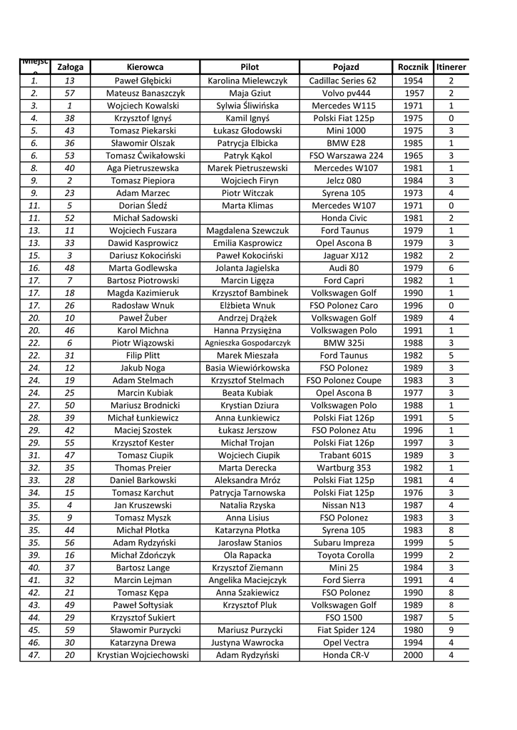 Miejsc Załoga e 1. 13 2. 57 3. 1 4. 38 5. 43 6. 36 6. 53 8. 40 9. 2 9. 23 11. 5 11. 52 13. 11 13. 33 15. 3 16. 48 17. 7 17. 18 17. 26 20. 10 20. 46 22. 6 22. 31 24. 12 24. 19 24. 25 27. 50 28. 39 29. 42 29. 55 31. 47 32. 35 33. 28 34. 15 35. 4 35. 9 35. 44 35. 56 39. 16 40. 37 41. 32 42. 21 43. 49 44. 29 45. 59 46. 30 47. 20 Kierowca Paweł Głębicki Mateusz Banaszczyk Wojciech Kowalski Krzysztof Ignyś Tomasz Piekarski Sławomir Olszak Tomasz Ćwikałowski Aga Pietruszewska Tomasz Piepiora Adam Marzec Dorian Śledź Michał Sadowski Wojciech Fuszara Dawid Kasprowicz Dariusz Kokociński Marta Godlewska Bartosz Piotrowski Magda Kazimieruk Radosław Wnuk Paweł Żuber Karol Michna Piotr Wiązowski Filip Plitt Jakub Noga Adam Stelmach Marcin Kubiak Mariusz Brodnicki Michał Łunkiewicz Maciej Szostek Krzysztof Kester Tomasz Ciupik Thomas Preier Daniel Barkowski Tomasz Karchut Jan Kruszewski Tomasz Myszk Michał Płotka Adam Rydzyński Michał Zdończyk Bartosz Lange Marcin Lejman Tomasz Kępa Paweł Sołtysiak Krzysztof Sukiert Sławomir Purzycki Katarzyna Drewa Krystian Wojciechowski Pilot Karolina Mielewczyk Maja Gziut Sylwia Śliwińska Kamil Ignyś Łukasz Głodowski Patrycja Elbicka Patryk Kąkol Marek Pietruszewski Wojciech Firyn Piotr Witczak Marta Klimas Magdalena Szewczuk Emilia Kasprowicz Paweł Kokociński Jolanta Jagielska Marcin Ligęza Krzysztof Bambinek Elżbieta Wnuk Andrzej Drążek Hanna Przysiężna Agnieszka Gospodarczyk Marek Mieszała Basia Wiewiórkowska Krzysztof Stelmach Beata Kubiak Krystian Dziura Anna Łunkiewicz Łukasz Jerszow Michał Trojan Wojciech Ciupik Marta Derecka Aleksandra Mróz Patrycja Tarnowska Natalia Rzyska Anna Lisius Katarzyna Płotka Jarosław Stanios Ola Rapacka Krzysztof Ziemann Angelika Maciejczyk Anna Szakiewicz Krzysztof Pluk Mariusz Purzycki Justyna Wawrocka Adam Rydzyński Pojazd Cadillac Series 62 Volvo pv444 Mercedes W115 Polski Fiat 125p Mini 1000 BMW E28 FSO Warszawa 224 Mercedes W107 Jelcz 080 Syrena 105 Mercedes W107 Honda Civic Ford Taunus Opel Ascona B Jaguar XJ12 Audi 80 Ford Capri Volkswagen Golf FSO Polonez Caro Volkswagen Golf Volkswagen Polo BMW 325i Ford Taunus FSO Polonez FSO Polonez Coupe Opel Ascona B Volkswagen Polo Polski Fiat 126p FSO Polonez Atu Polski Fiat 126p Trabant 601S Wartburg 353 Polski Fiat 125p Polski Fiat 125p Nissan N13 FSO Polonez Syrena 105 Subaru Impreza Toyota Corolla Mini 25 Ford Sierra FSO Polonez Volkswagen Golf FSO 1500 Fiat Spider 124 Opel Vectra Honda CR-V Rocznik Itinerer 1954 2 1957 2 1971 1 1975 0 1975 3 1985 1 1965 3 1981 1 1984 3 1973 4 1971 0 1981 2 1979 1 1979 3 1982 2 1979 6 1982 1 1990 1 1996 0 4 1989 1991 1 1988 3 1982 5 1989 3 1983 3 1977 3 1988 1 1991 5 1996 1 1997 3 1989 3 1982 1 1981 4 1976 3 1987 4 1983 3 1983 8 1999 5 1999 2 1984 3 1991 4 1990 8 8 1989 1987 5 1980 9 1994 4 2000 4 48. 48. 50. 51. 52. 53. 54. 55. 56. 57. 58. 59. 54 60 8 41 24 14 34 22 27 58 45 51 Marcin Stypulski Sebastian Adamczyk Jolanta Zdończyk Piotr Kozłowski Mateusz Budzyński Maciej Kopiś Michał Maliński Maciej Tomkowicz Marcin Sieciński Tomasz Kamać Maciej Kiernicki Andrzej Miśniakiewicz Karolina Łempio Paweł Witkowski Mirosław Zdończyk Monika Kozłowska Robert Tkaczyk Mateusz Kopiś Patrycja Kaniuk Sylwia Leśniewska Asia Drawc Andrzej Chlebowski Paweł Piepiórka Ford Escort Volkswagen T4 Honda Civic Wartburg 312 Volkswagen Golf 1 Syrena 105 Honda Civic Wartburg 353 S Volkswagen Garbus Nysa 522 FSO Polonez Caro + Opel Kadett E 1990 1994 1999 1963 1977 1975 1998 1988 1968 1990 1999 1991 6 6 5 5 9 27 4 27 27 27 21 27 Zadania 2 3 0 0 0 0 8 3 0 5 5 3 6 4 4 2 6 2 0 0 2 2 3 2 0 8 5 5 2 0 4 0 8 2 2 0 5 0 4 6 7 4 0 0 5 9 3 Spr. Auta 0 0 0 0 0 0 0 0 0 0 5 0 0 0 0 0 0 0 0 0 0 0 0 0 5 0 0 0 0 0 0 10 0 10 5 10 0 0 0 5 0 0 5 10 5 0 5 Rocznik 27 28,5 35,5 37,5 37,5 42,5 32,5 40,5 42 36 35,5 40,5 39,5 39,5 41 39,5 41 45 48 44,5 45,5 44 41 44,5 41,5 38,5 44 40,5 48 48 44,5 41 40,5 38 43,5 41,5 41,5 49,5 49,5 42 45,5 45 44,5 43,5 40 47 50 Suma 31 33,5 36,5 37,5 40,5 43,5 43,5 44,5 45 45 45,5 45,5 46,5 46,5 47 47,5 48 48 48 48,5 48,5 49 49 49,5 49,5 49,5 50 50,5 51 51 51,5 52 52,5 53 54,5 54,5 54,5 54,5 55,5 56 56,5 57 57,5 58,5 59 60 62 KAROL WOJTALA 40 ŻYNDA RAFAŁ 40 Adam Żyszkowski 40 2 5 4 6 8 8 2 9 14 11 14 14 10 5 5 25 15 0 20 10 25 25 25 25 45 47 49,5 31,5 38,5 37,5 49 44 34 45 49,5 45,5 63 63 63,5 67,5 70,5 72,5 75 90 100 108 109,5 111,5
