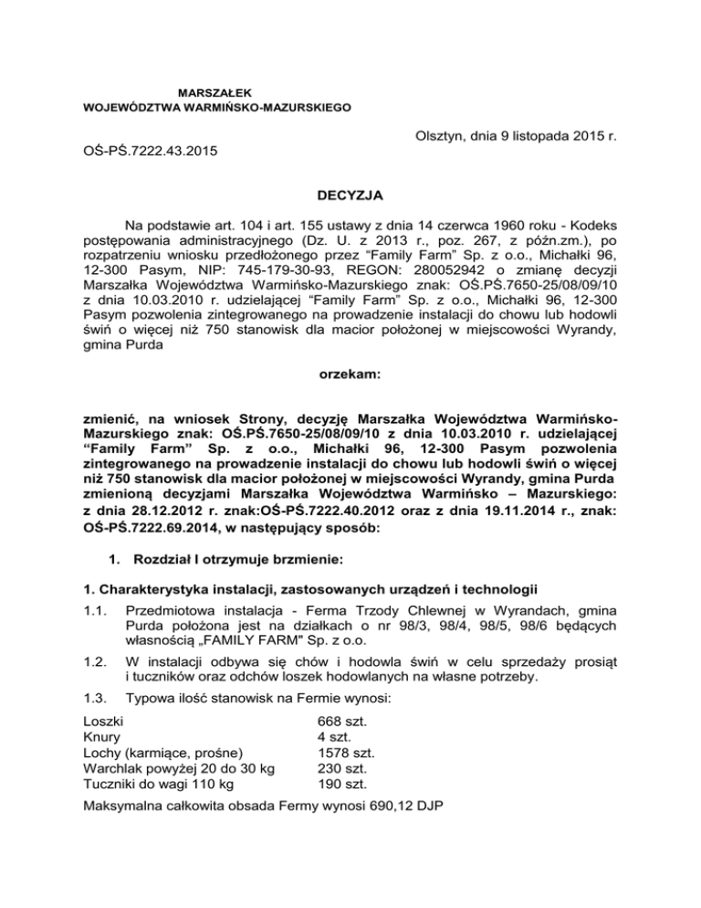 MARSZAŁEK WOJEWÓDZTWA WARMIŃSKO-MAZURSKIEGO Olsztyn, dnia 9 listopada 2015 r. OŚ-PŚ.7222.43.2015 DECYZJA Na podstawie art. 104 i art. 155 ustawy z dnia 14 czerwca 1960 roku - Kodeks postępowania administracyjnego (Dz. U. z 2013 r., poz. 267, z późn.zm.), po rozpatrzeniu wniosku przedłożonego przez “Family Farm” Sp. z o.o., Michałki 96, 12-300 Pasym, NIP: 745-179-30-93, REGON: 280052942 o zmianę decyzji Marszałka Województwa Warmińsko-Mazurskiego znak: OŚ.PŚ.7650-25/08/09/10 z dnia 10.03.2010 r. udzielającej “Family Farm” Sp. z o.o., Michałki 96, 12-300 Pasym pozwolenia zintegrowanego na prowadzenie instalacji do chowu lub hodowli świń o więcej niż 750 stanowisk dla macior położonej w miejscowości Wyrandy, gmina Purda orzekam: zmienić, na wniosek Strony, decyzję Marszałka Województwa WarmińskoMazurskiego znak: OŚ.PŚ.7650-25/08/09/10 z dnia 10.03.2010 r. udzielającej “Family Farm” Sp. z o.o., Michałki 96, 12-300 Pasym pozwolenia zintegrowanego na prowadzenie instalacji do chowu lub hodowli świń o więcej niż 750 stanowisk dla macior położonej w miejscowości Wyrandy, gmina Purda zmienioną decyzjami Marszałka Województwa Warmińsko – Mazurskiego: z dnia 28.12.2012 r. znak:OŚ-PŚ.7222.40.2012 oraz z dnia 19.11.2014 r., znak: OŚ-PŚ.7222.69.2014, w następujący sposób: 1. Rozdział I otrzymuje brzmienie: 1. Charakterystyka instalacji, zastosowanych urządzeń i technologii 1.1. Przedmiotowa instalacja - Ferma Trzody Chlewnej w Wyrandach, gmina Purda położona jest na działkach o nr 98/3, 98/4, 98/5, 98/6 będących własnością „FAMILY FARM" Sp. z o.o. 1.2. W instalacji odbywa się chów i hodowla świń w celu sprzedaży prosiąt i tuczników oraz odchów loszek hodowlanych na własne potrzeby. 1.3. Typowa ilość stanowisk na Fermie wynosi: Loszki Knury Lochy (karmiące, prośne) Warchlak powyżej 20 do 30 kg Tuczniki do wagi 110 kg 668 szt. 4 szt. 1578 szt. 230 szt. 190 szt. Maksymalna całkowita obsada Fermy wynosi 690,12 DJP 1.4. W skład instalacji wchodzi: 8 budynków chowu i hodowli trzody chlewnej oznaczonych nr 101, 301, 302, 303, 304, 401, 402 i 502. W budynkach prowadzony jest bezściołowy chów świń. Kojce w porodówkach wyposażone są w ruszta plastikowe częściowe, natomiast w pozostałych budynkach w ruszta częściowe betonowe. Każdy budynek wyposażony jest w system wentylacji mechanicznej. Nawiew powietrza do wewnątrz budynków odbywał się będzie przez automatycznie uchylane inlety umieszczone w ścianach bocznych. 7 zbiorników na gnojowicę o łącznej pojemności 3500 m 3, 15 zbiorników paszowych (2 silosy o pojemności 3 Mg każdy, 9 silosów o pojemności 9 Mg każdy oraz 4 silosy o pojemności 17 Mg każdy), waga o udźwigu 50 Mg, budynek – agregat prądotwórczy, budynek hydroforni, 2 studnie wiercone, magazyn odpadów. 1.5. Charakterystyka procesu produkcyjnego: W budynkach prowadzony będzie chów świń, a głównym produktem finalnym będą prosięta oraz niewielkie ilości tucznika. Każdy budynek wyposażony jest w system wentylacji mechanicznej; mechaniczny system w postaci wentylatorów wyciągowych dachowych. Nawiew powietrza do wewnątrz budynków odbywał się będzie przez automatycznie uchylane inlety (uchylne okienka) umieszczone w ścianach bocznych. Wszystkie budynki inwentarskie wyposażone są w sterowany komputerowo system wentylacji, który zapewnia utrzymanie odpowiedniej temperatury i wilgotności wewnątrz pomieszczeń. Pasze dostarczane są na fermę paszowozami i magazynowane w silosach zlokalizowanych przy budynkach inwentarskich. Pasze z silosów trafiają do budynków za pomocą paszociągów. W budynkach zainstalowane są indywidualne lub grupowe paszowniki. Zwierzęta pobierają wodę za pomocą poidełek smoczkowo – miseczkowych. Gnojowica z kanałów gnojowych pod budynkami, o pojemności 2663,35 m 3, odprowadzana jest grawitacyjnie poprzez system rur do trzech przepompowni, a następnie do zbiorników magazynowych tzw. kortenów. Na fermie znajduje się 7 kortenów o pojemności 500 m3 każdy. Korteny zostały uszczelnione geomembraną o grubości 1,5 mm. Całkowita pojemność zbiorników magazynowych wynosi 3500 m3. Pojemność kanałów gnojowych oraz kortenów, wynosi łącznie 6163,35 m3 i jest wystarczająca do zmagazynowania gnojowicy przez okres 4 miesięcy. Gnojowica z kortenów wypompowywana jest do beczkowozów, a następnie, w zależności od dalszego sposobu postępowania, wykorzystywana jest jako nawóz (wywożona na pola Fermy w celu rolniczego wykorzystania) i/lub jako wsad do biogazowni. Sprzątanie i dezynfekcja porodówek odbywa się raz w miesiącu, natomiast pozostałych budynków dwa razy w roku. Budynki ogrzewane są za pomocą 36 nagrzewnic elektrycznych o łącznej wydajności cieplnej 1188 kW. Ponadto w budynkach porodówek znajdują się elektryczne maty grzewcze. 1.6. I ETAP - inseminacja loch i loszek w wydzielonych częściach budynków gdzie będą przebywały lochy i loszki po pokryciu. II ETAP - odchów prośnych loch i loszek do około 16 tygodni w kojcach indywidualnych i grupowych. III ETAP - na tydzień przed oproszeniem prośne lochy i loszki przenoszone są na porodówki (kojce indywidualne), gdzie przebywają z prosiętami do około 32 dnia. Następnie lochy przenoszone są do kojców grupowych wydzielonych budynków, część prosiąt jest sprzedawana, natomiast część kierowana jest do dalszego odchowu z przeznaczeniem do odnowienia stada. IV ETAP – w trakcie odchowu prosiąt do loszek remontowych zwierzęta będą przechodziły ocenę czy spełniają parametry wymagane dla loszki remontowej. Zwierzęta nie spełniające wymagań zostają przeklasyfikowane na tucznika, odchowywane do wagi 110 kg i sprzedawane. Przewiduje się 3 cykle tuczu tuczników w roku. Natomiast loszki po osiągnięciu wymaganej wagi będą kierowane do dalszego odchowu na terenie Fermy. 1.7. Cykl produkcyjny: Parametry produkcyjne insta